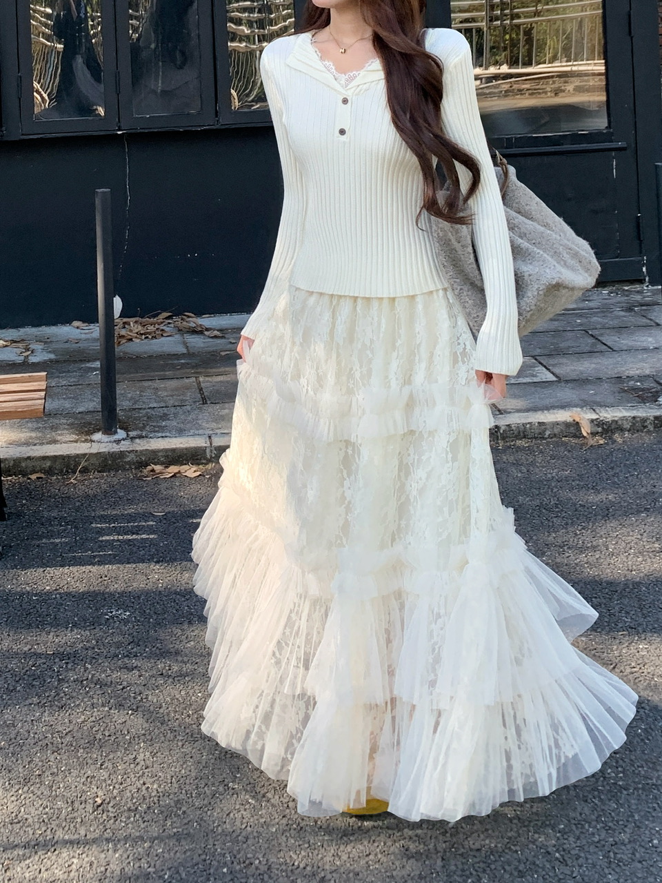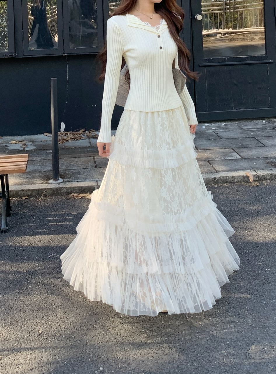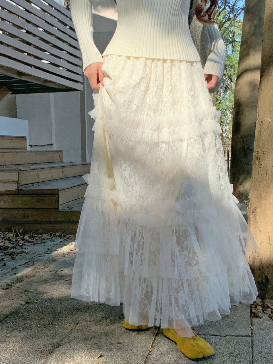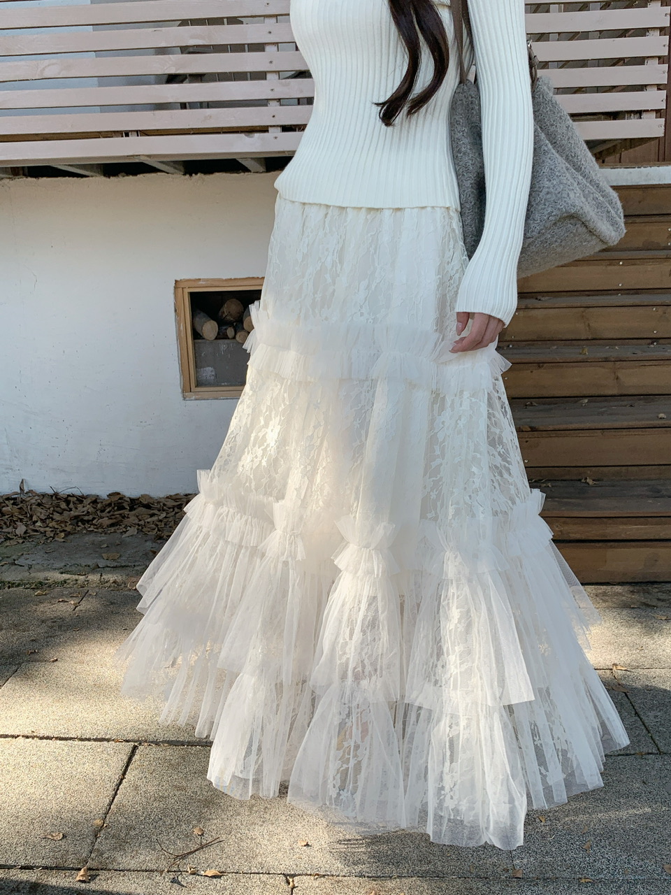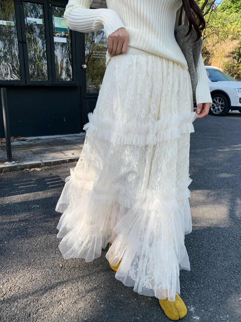 정가 실사 새로운 달콤한 차가운 바람 화이트 레이스 반신 스커트 프릴 큰 진자 롱 스커트