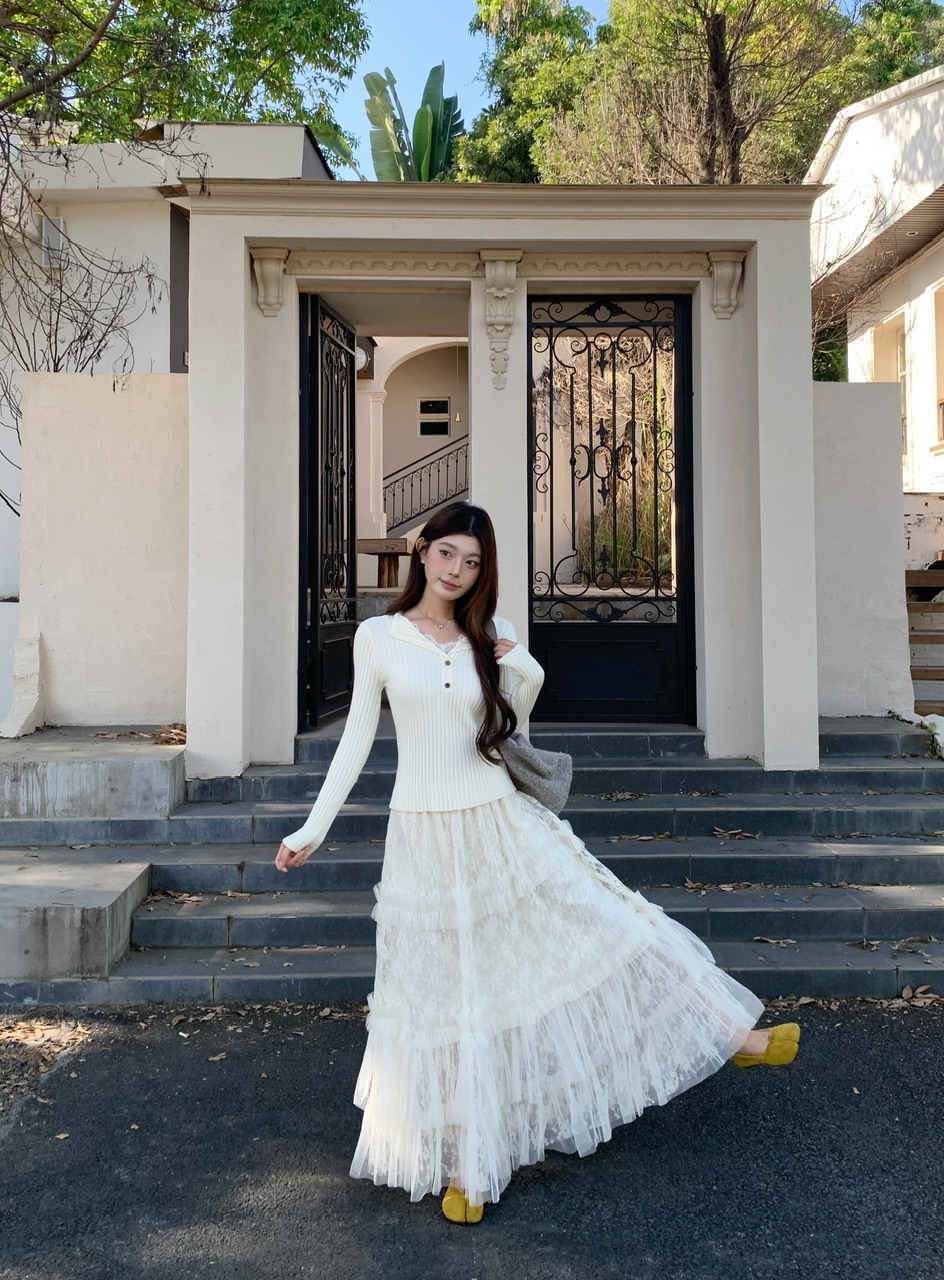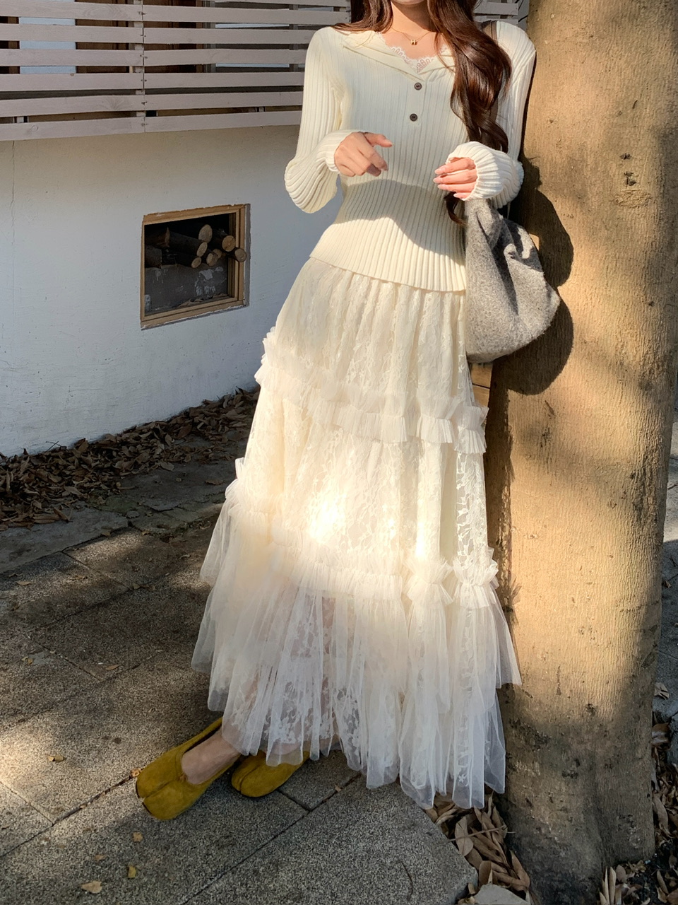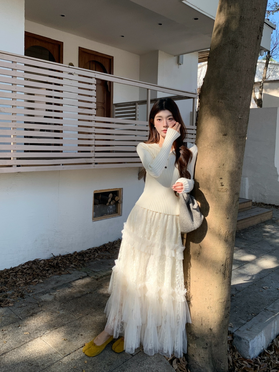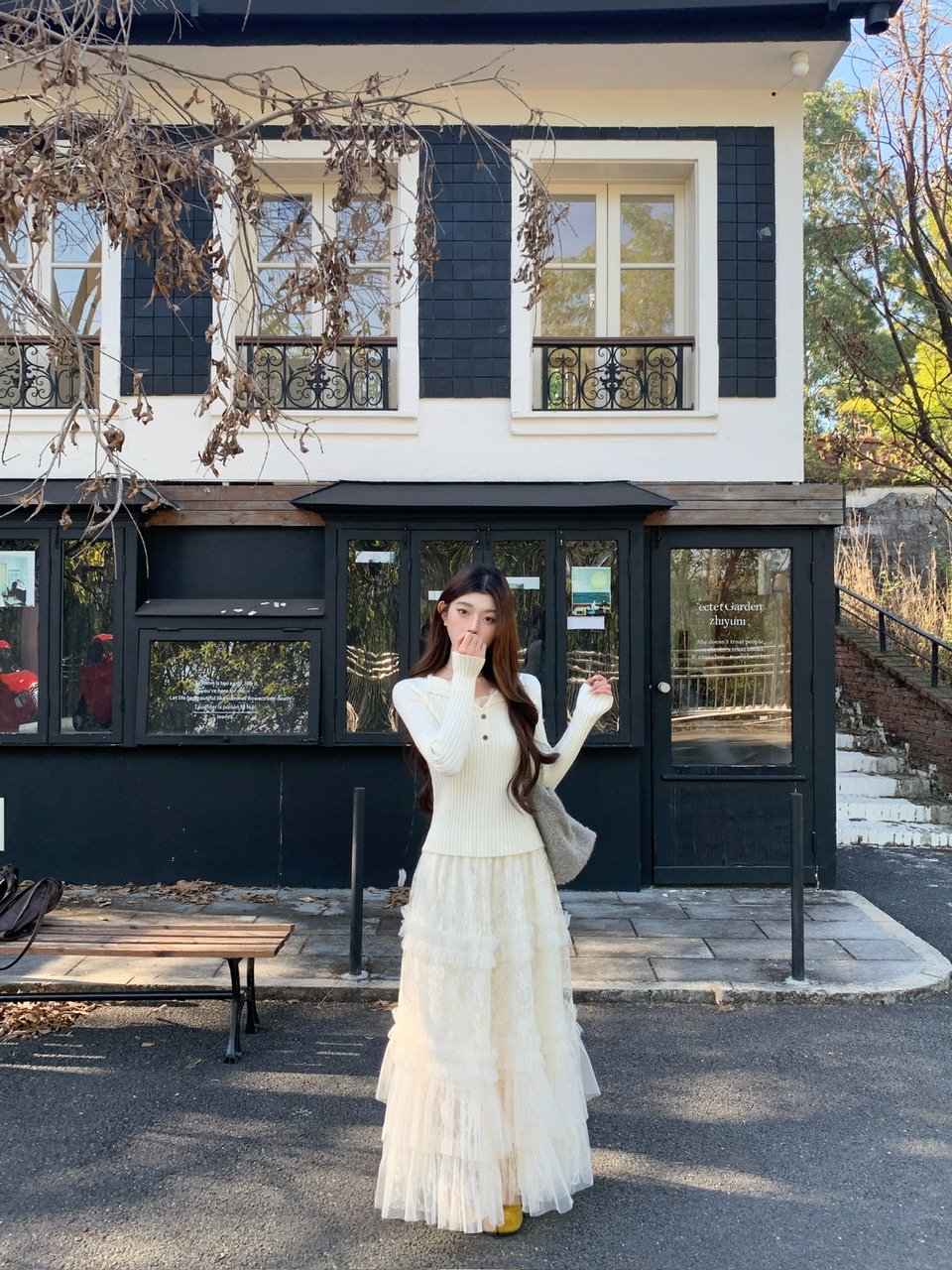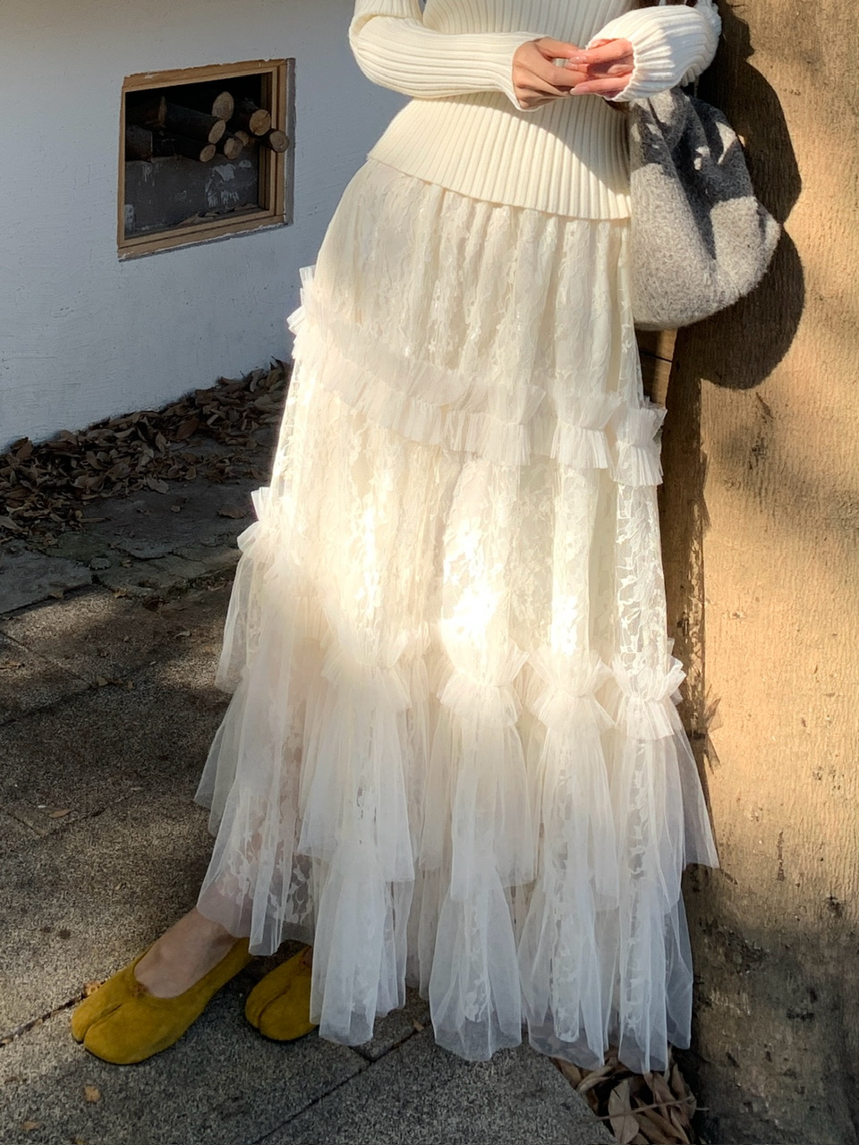 정가 실사 슈퍼 요정 화이트 레이스 케이크 드레스 여성 가을 겨울 하이웨이스트 A라인 스커트 중간 길이 도루 센스 거즈 스커트