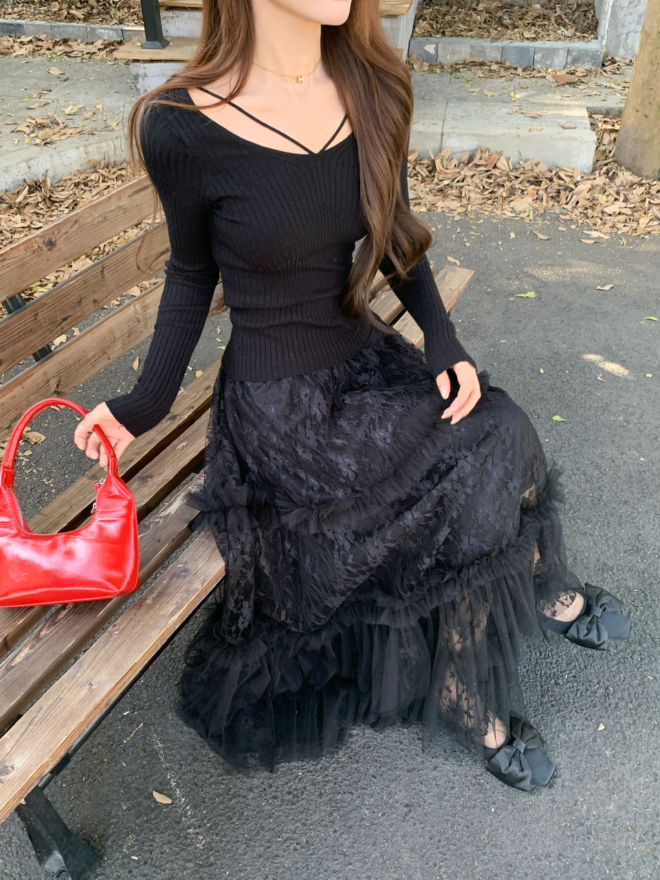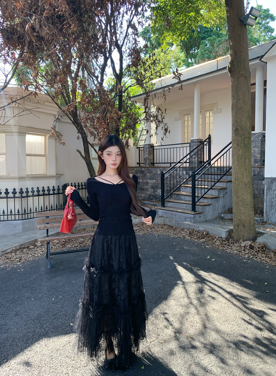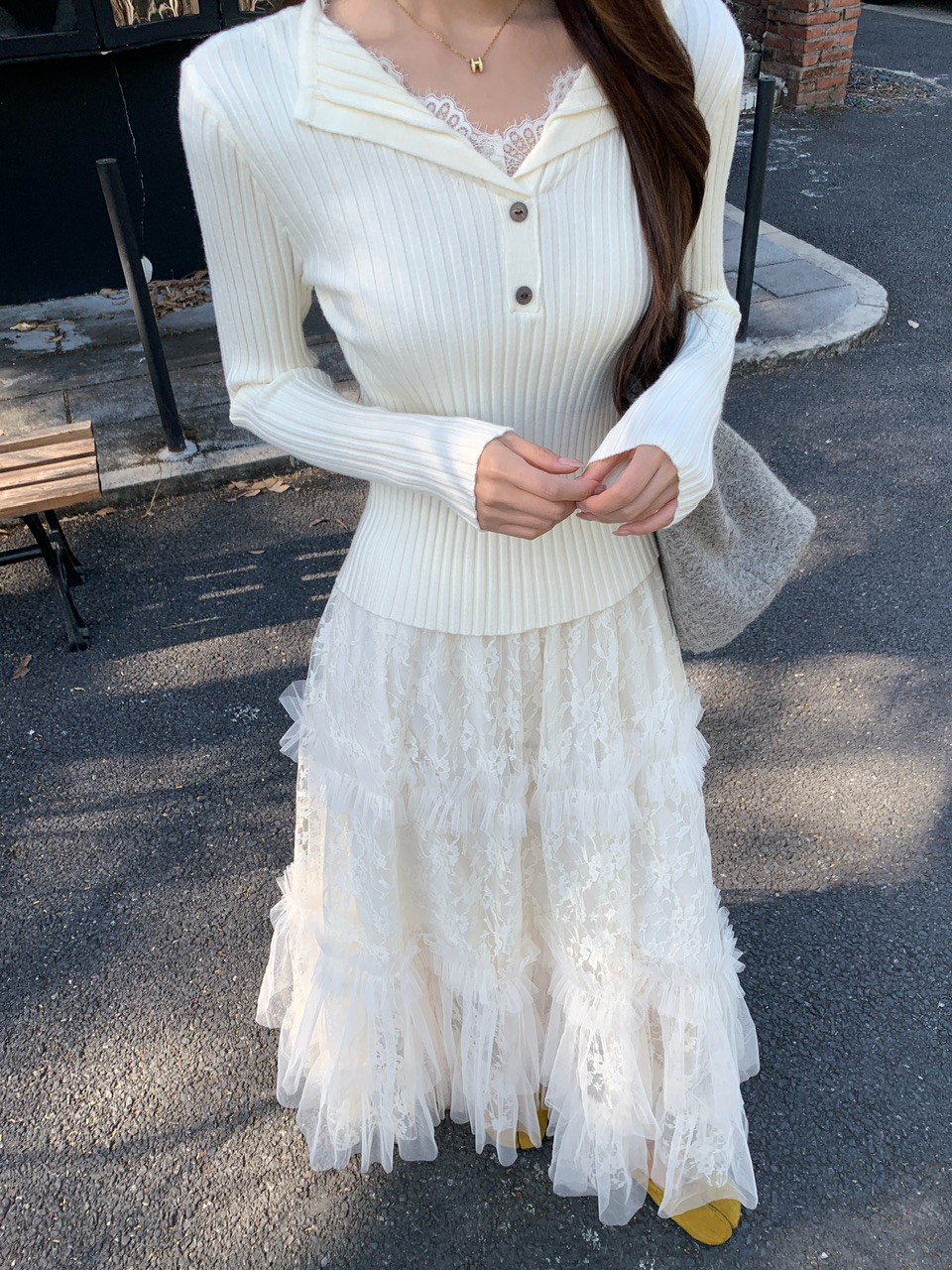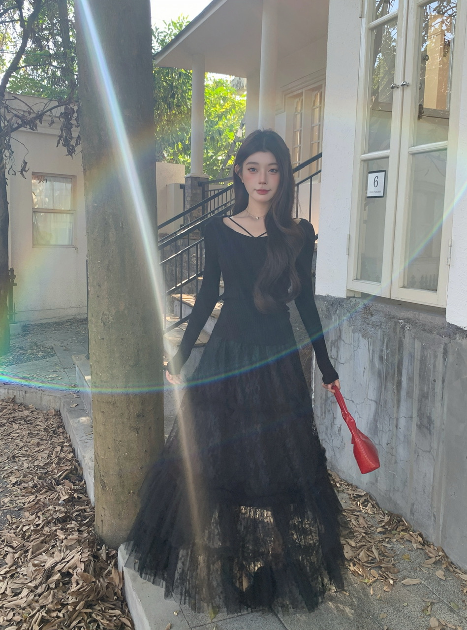 정가 실사 달콤한 차가운 오프숄더 스트라이프 니트 스웨터 쌀 화이트 망사 케이크 드레스 봄 부드러운 바람 투피스 세트