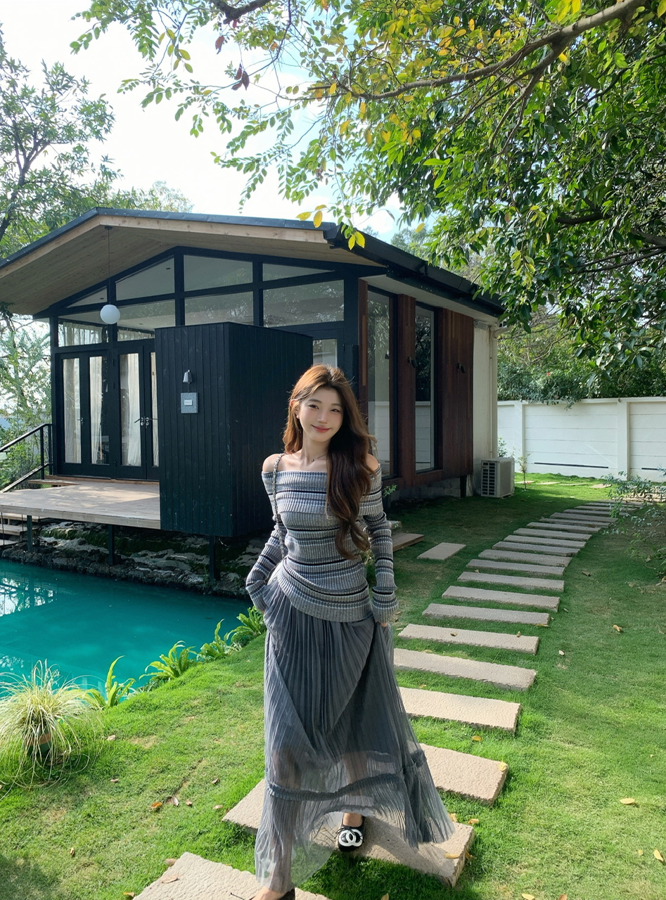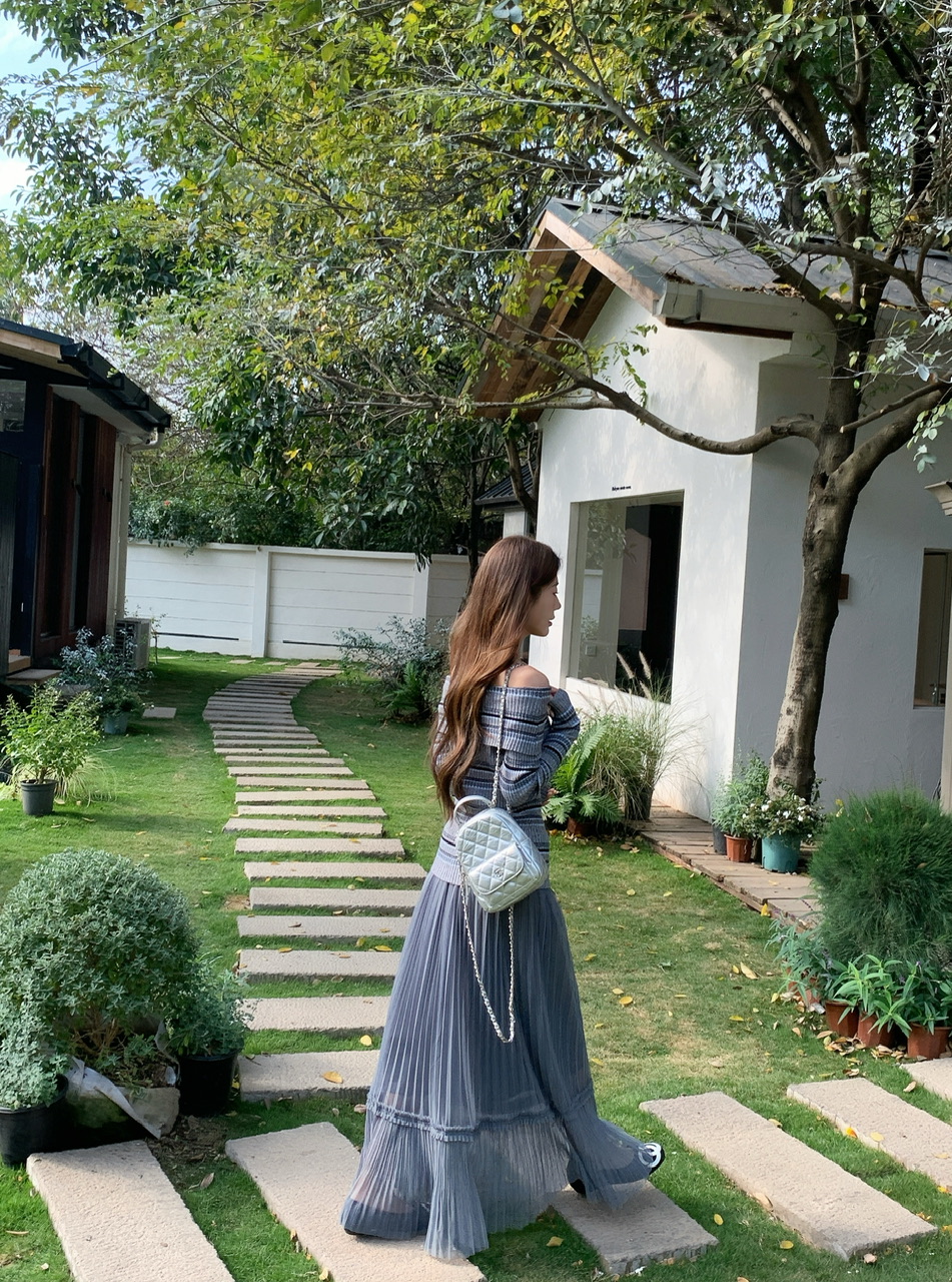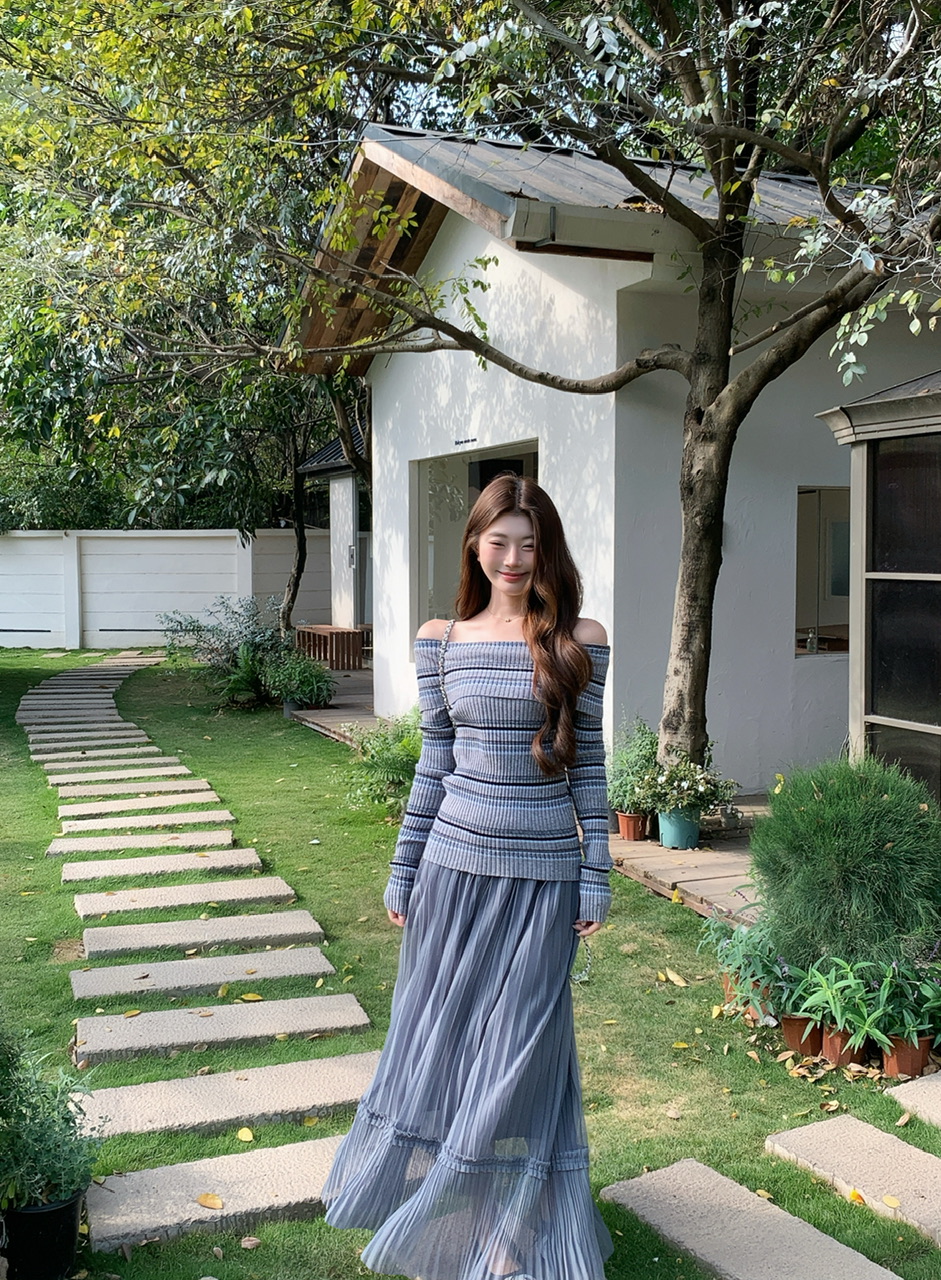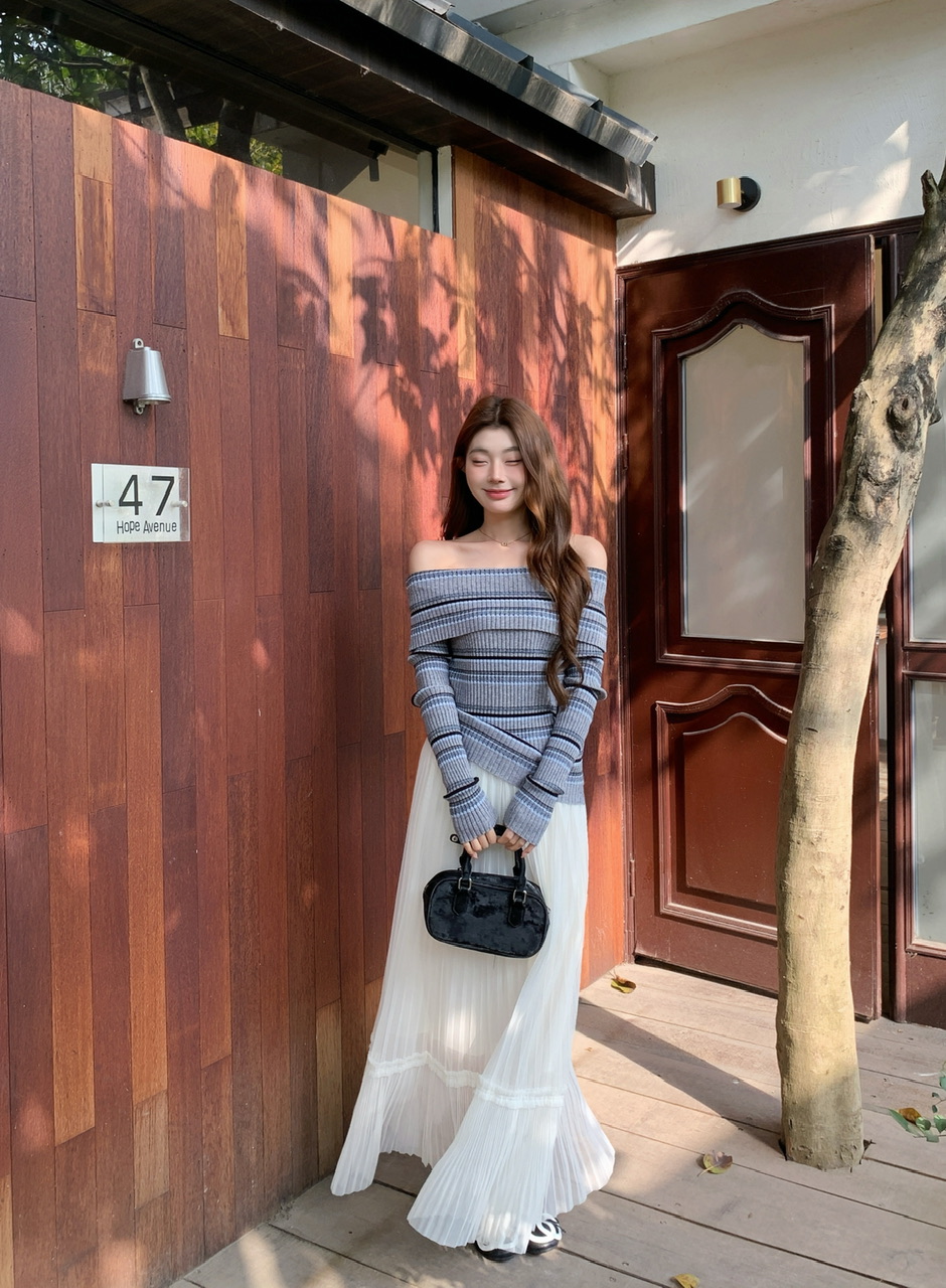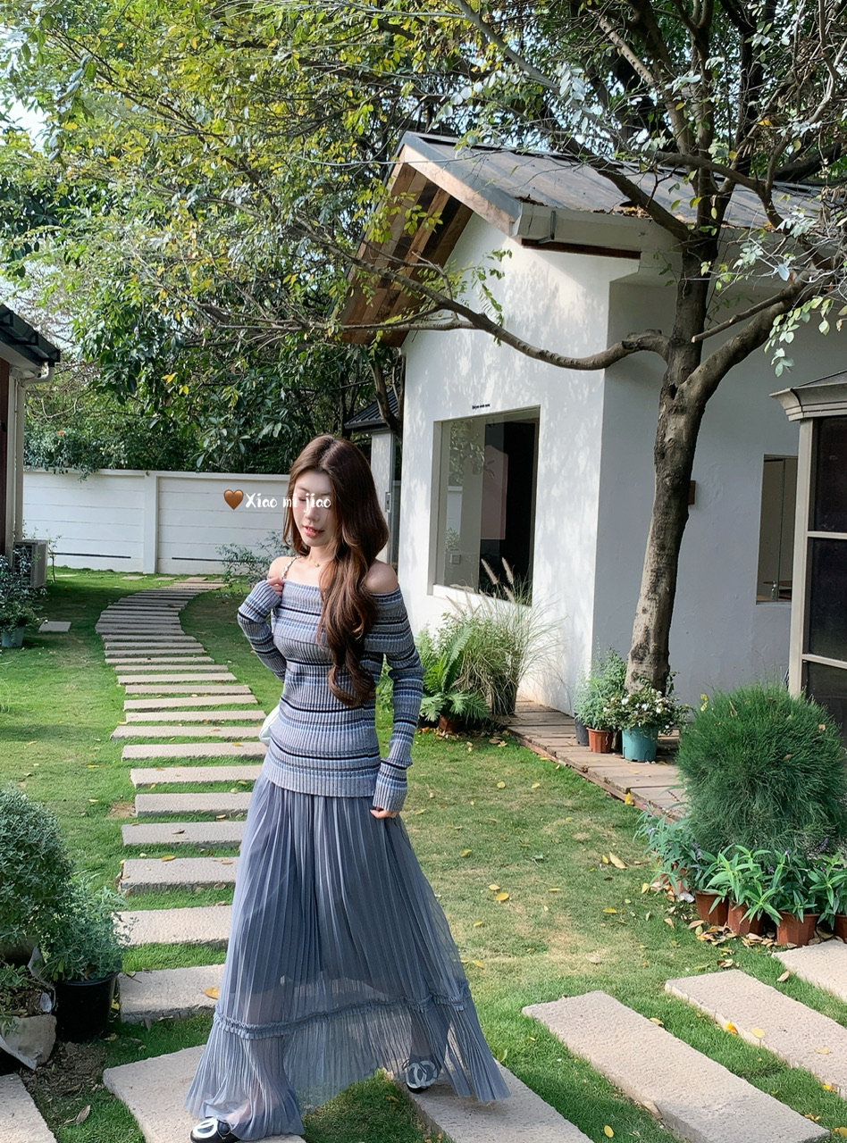 정가 실사 회색 스트라이프 오프숄더 니트 스웨터 여성 가을 하이웨이스트 플리츠 롱 스커트 부드러운 느긋한 바람 투피스 세트