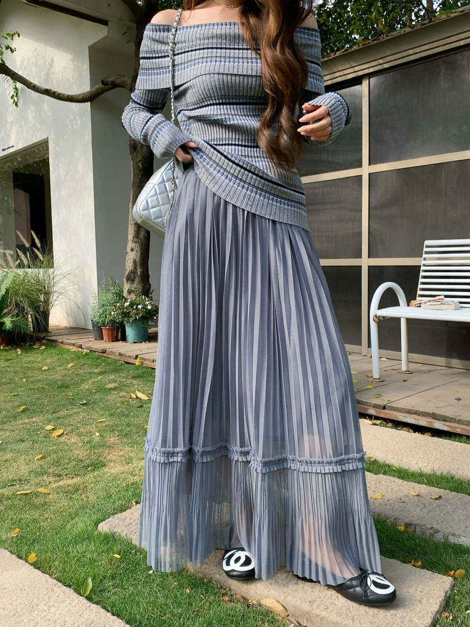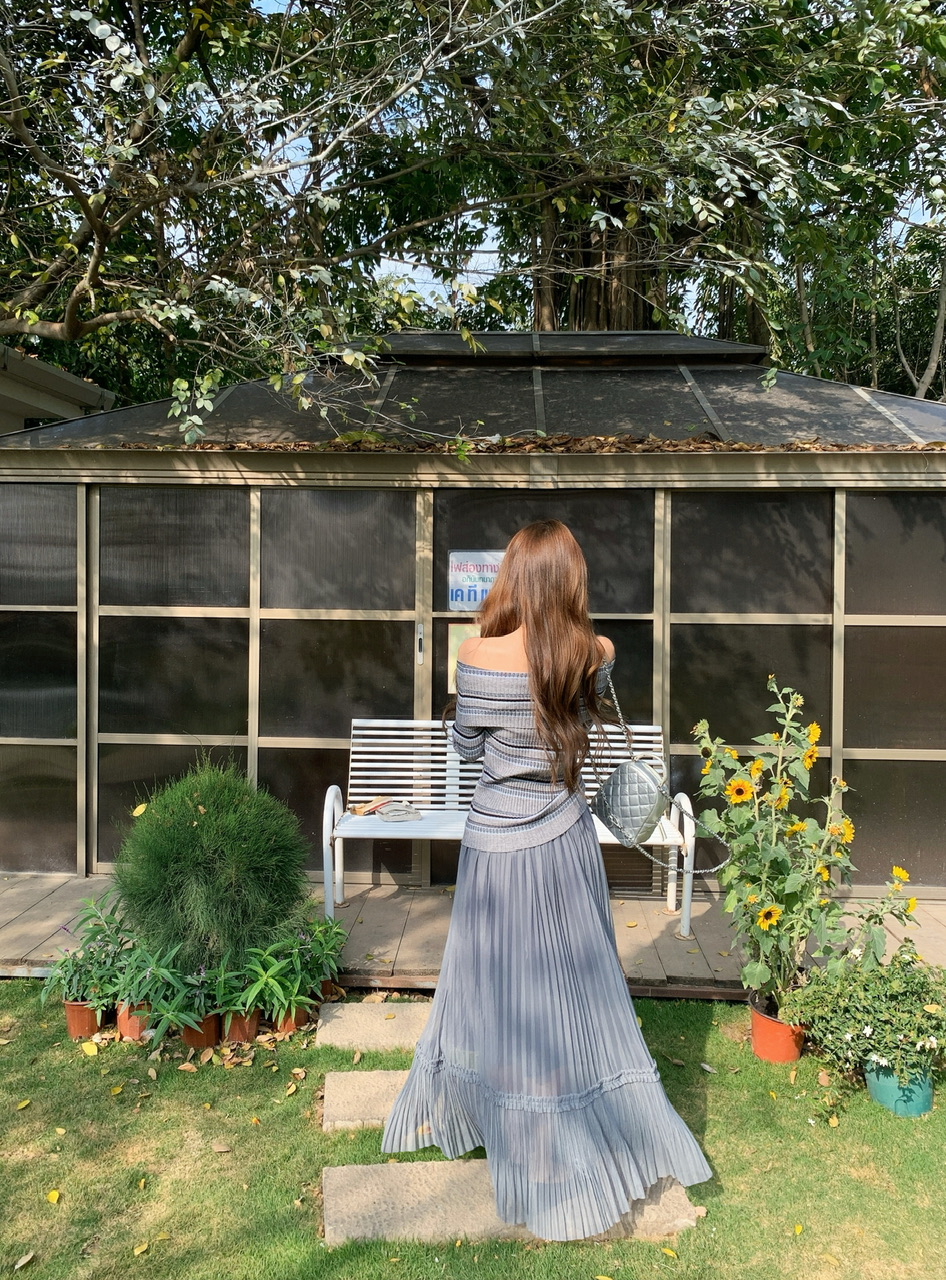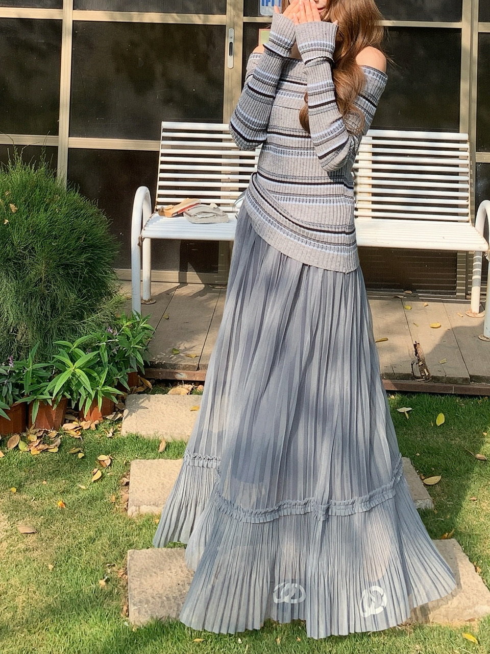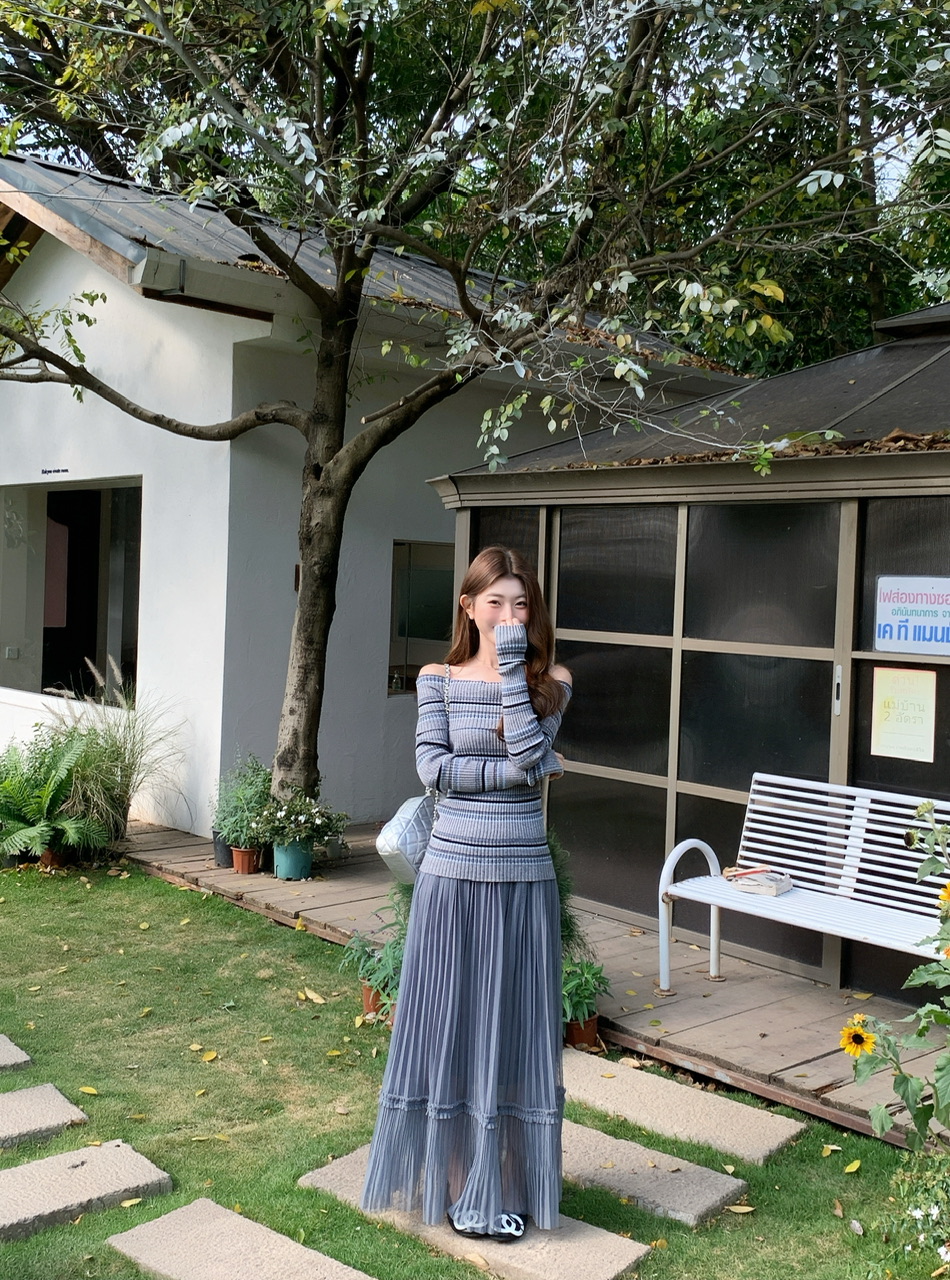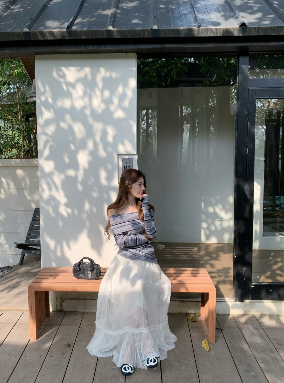 정가 실사 회색 스트라이프 오프숄더 니트 스웨터 여성 가을 하이웨이스트 플리츠 롱 스커트 부드러운 느긋한 바람 투피스 세트