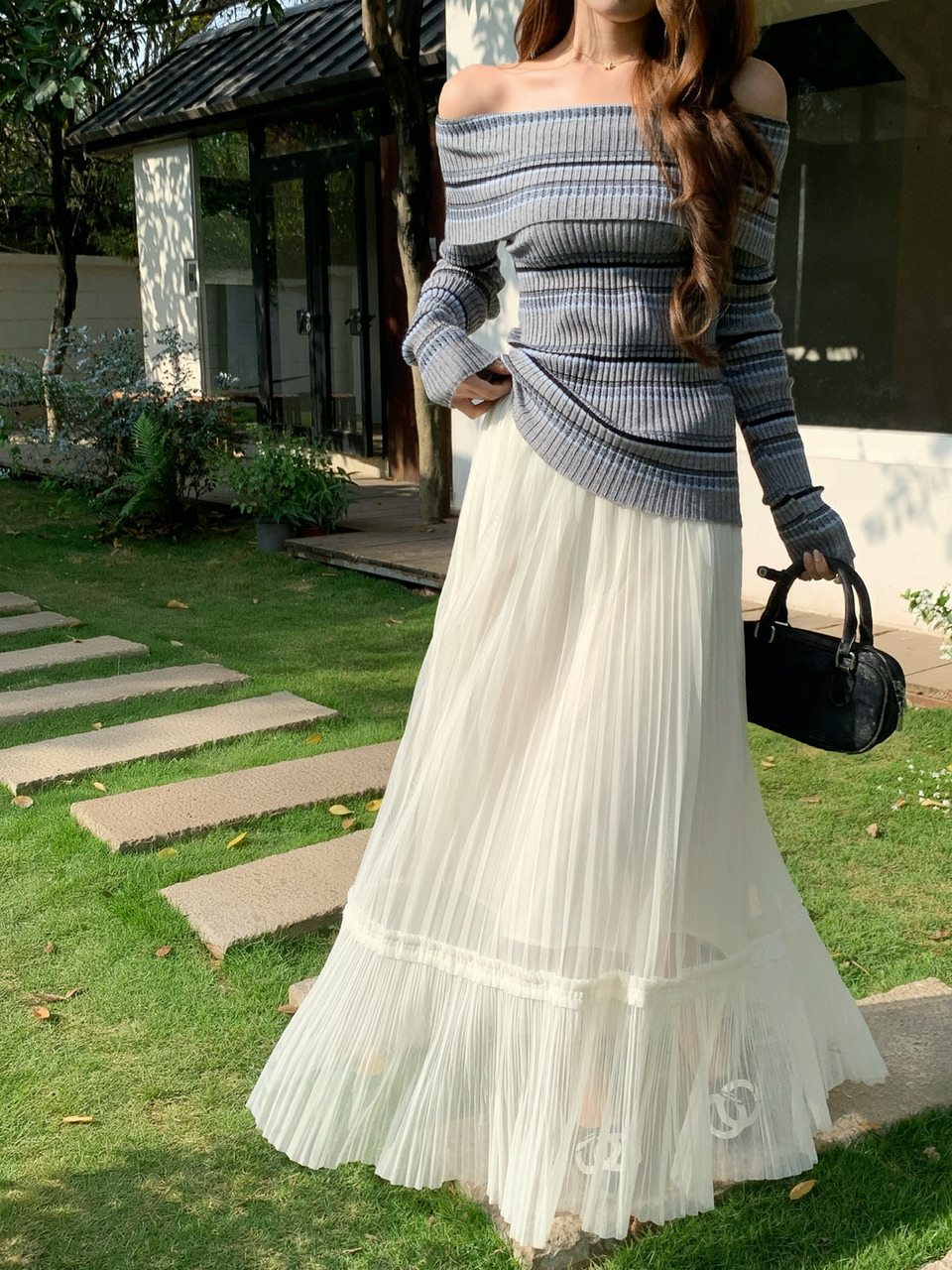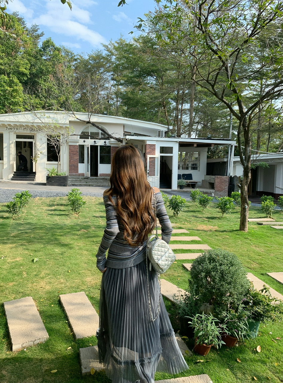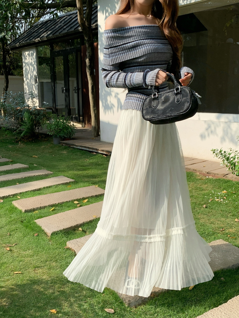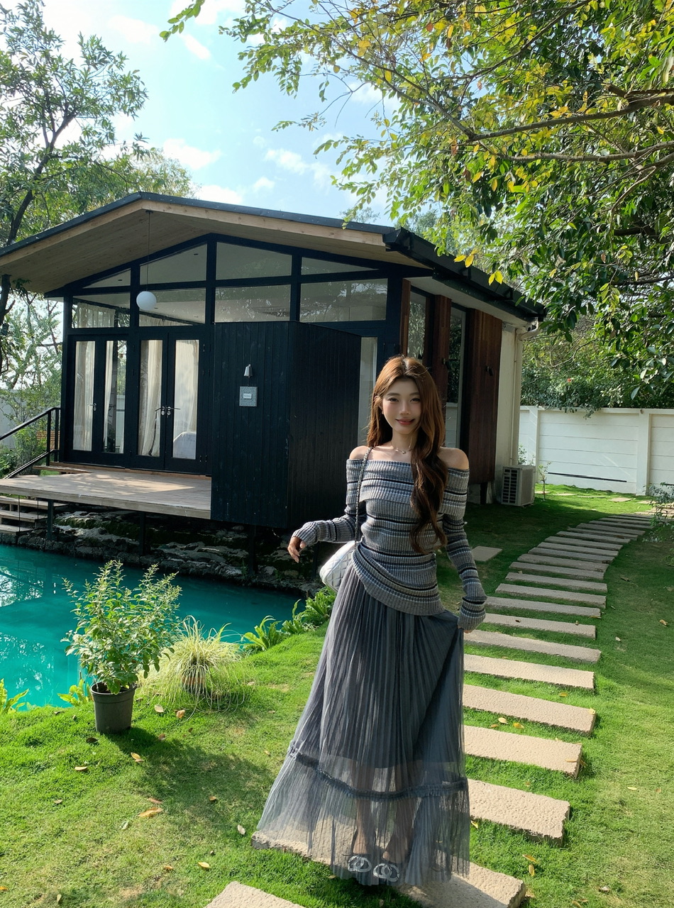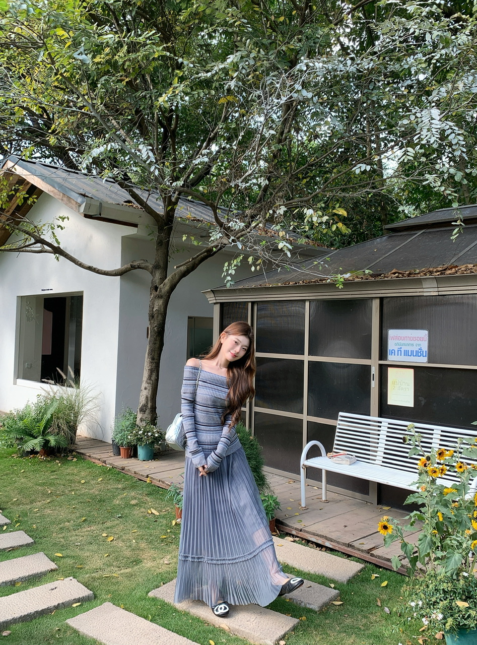 정가 실사 회색 스트라이프 오프숄더 니트 스웨터 여성 가을 하이웨이스트 플리츠 롱 스커트 부드러운 느긋한 바람 투피스 세트