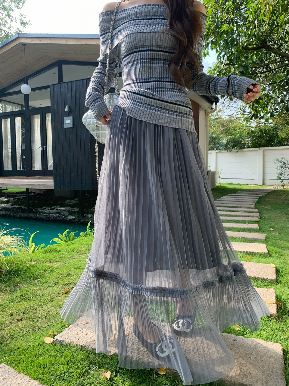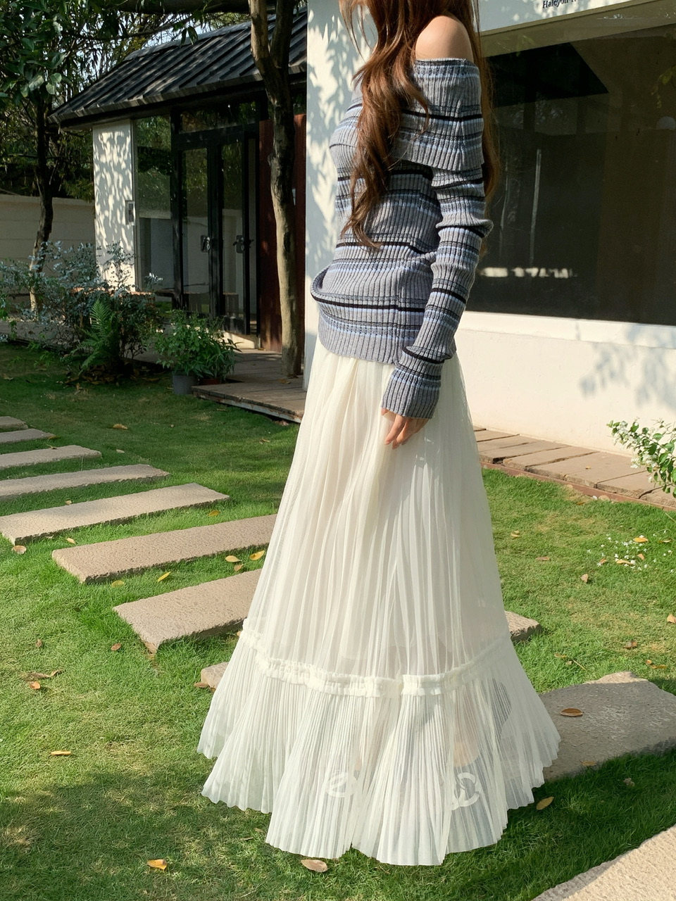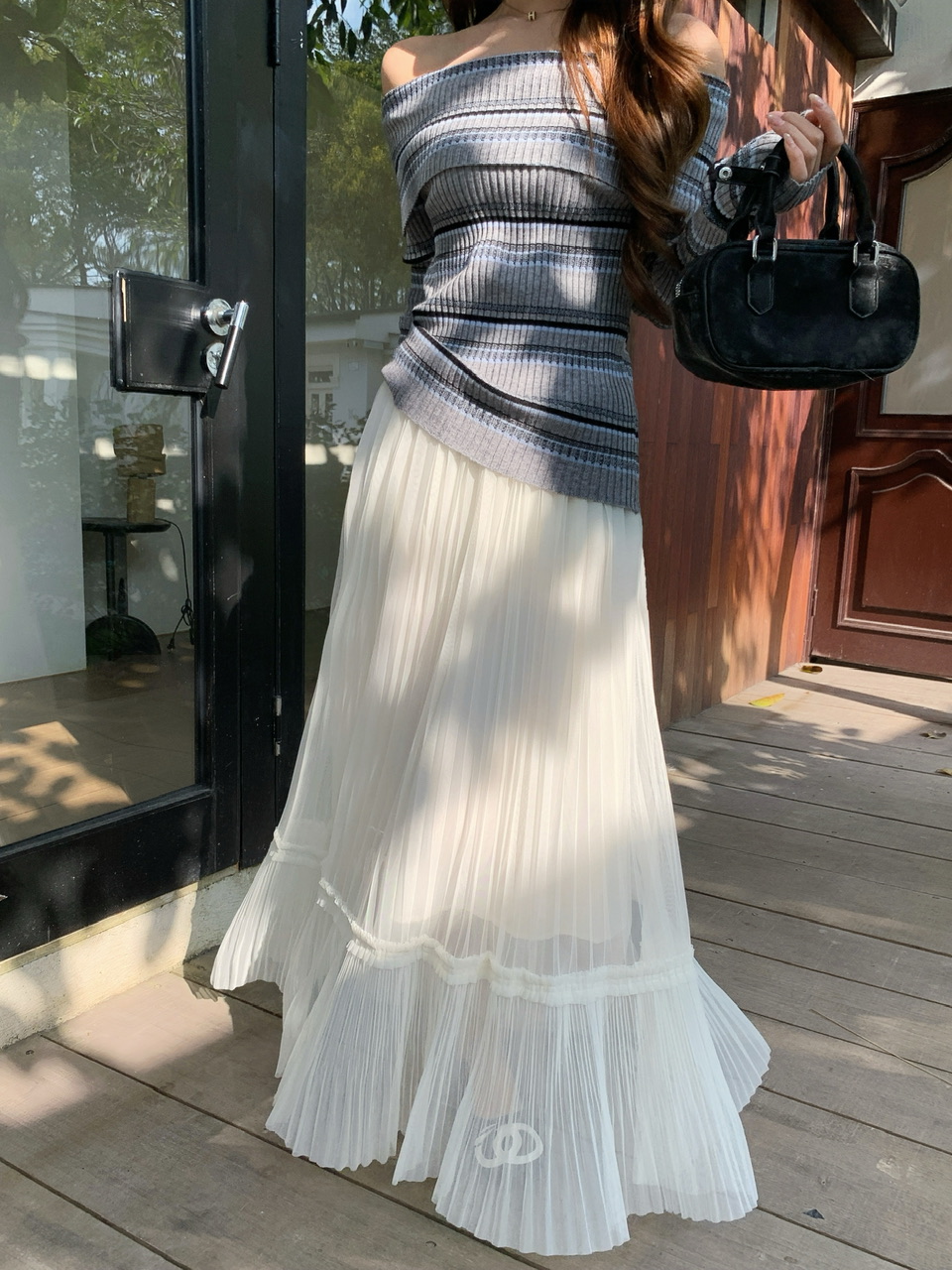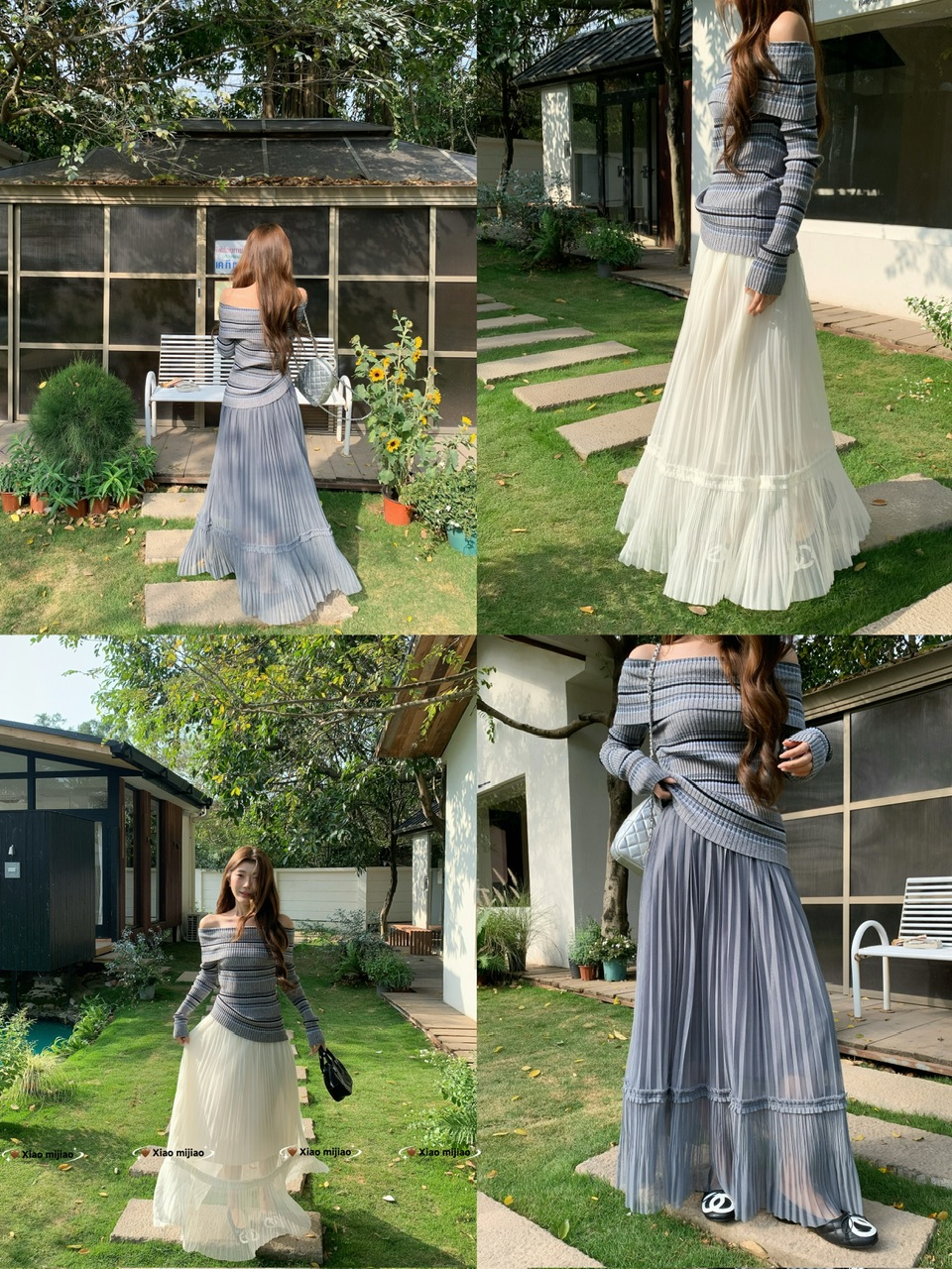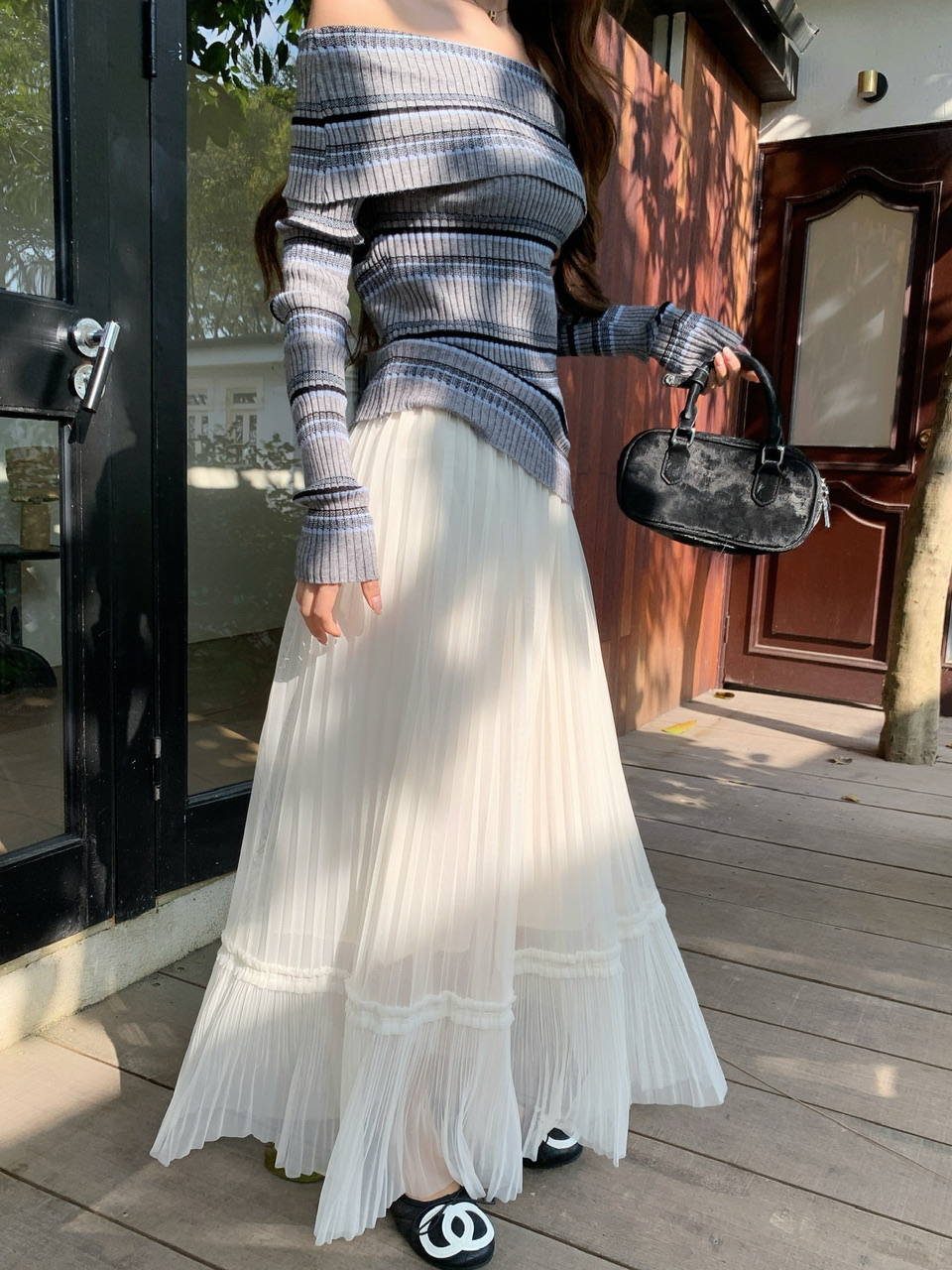정가 실사 회색 스트라이프 오프숄더 니트 스웨터 여성 가을 하이웨이스트 플리츠 롱 스커트 부드러운 느긋한 바람 투피스 세트
