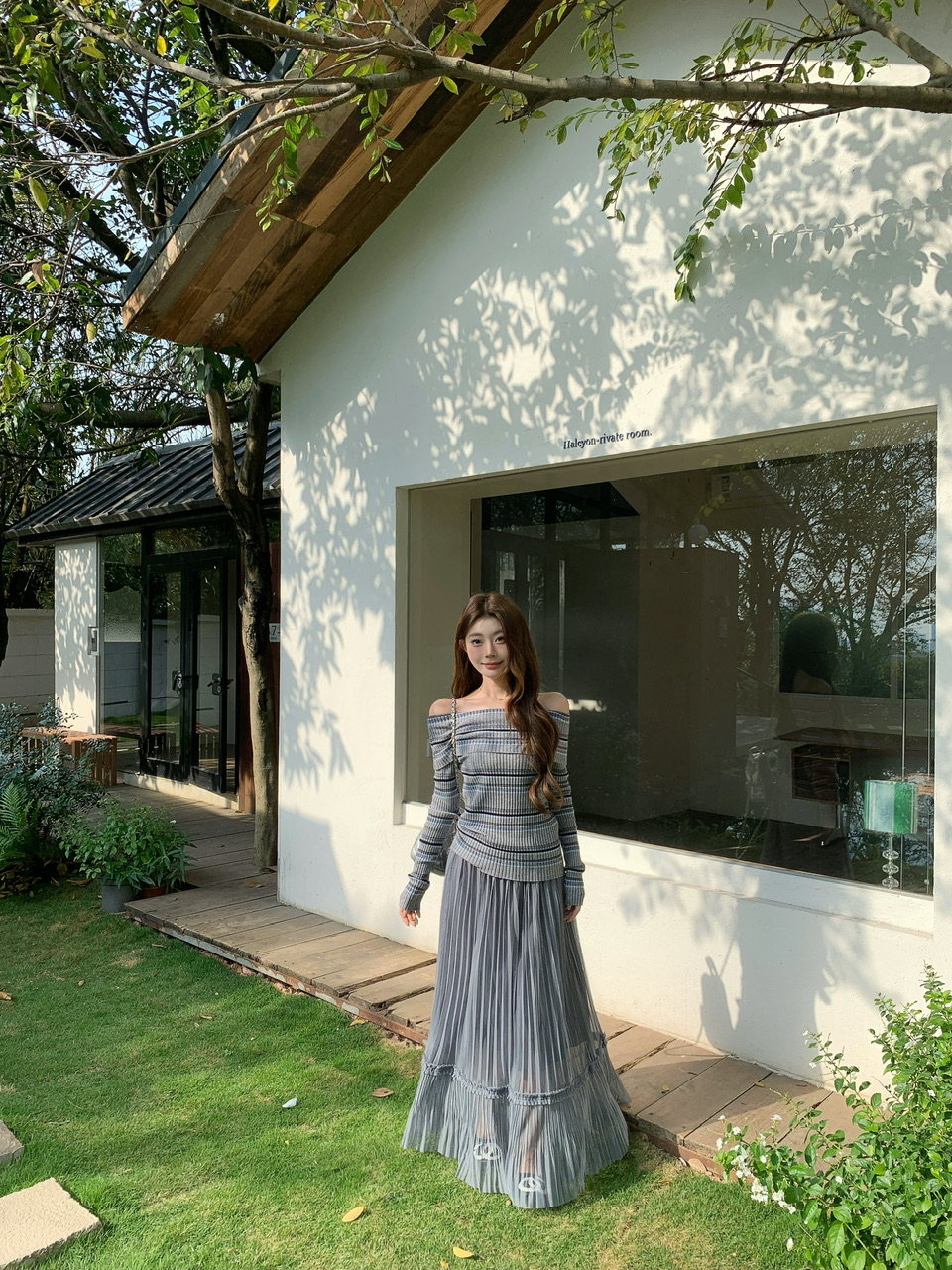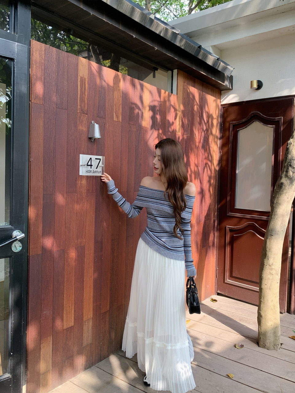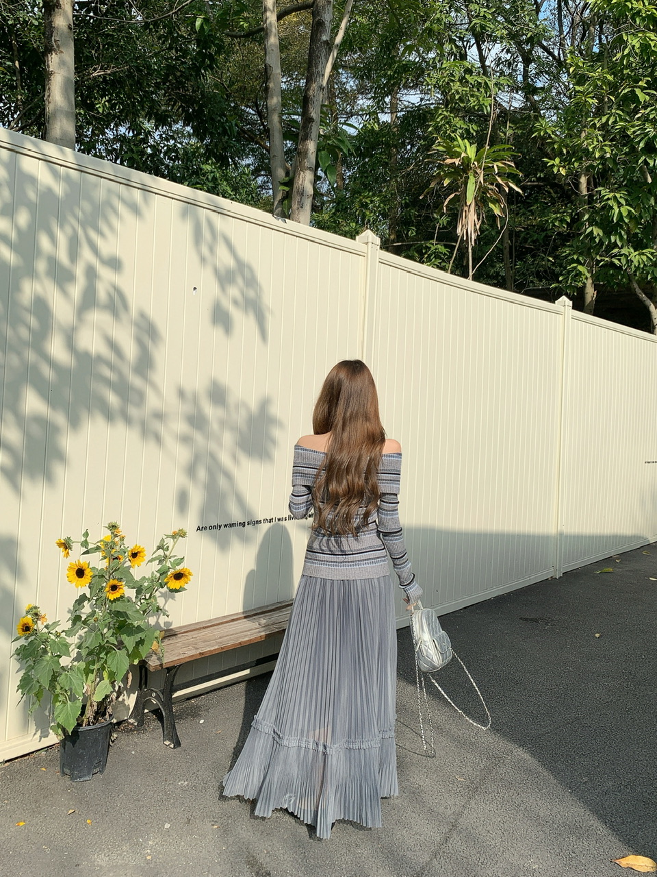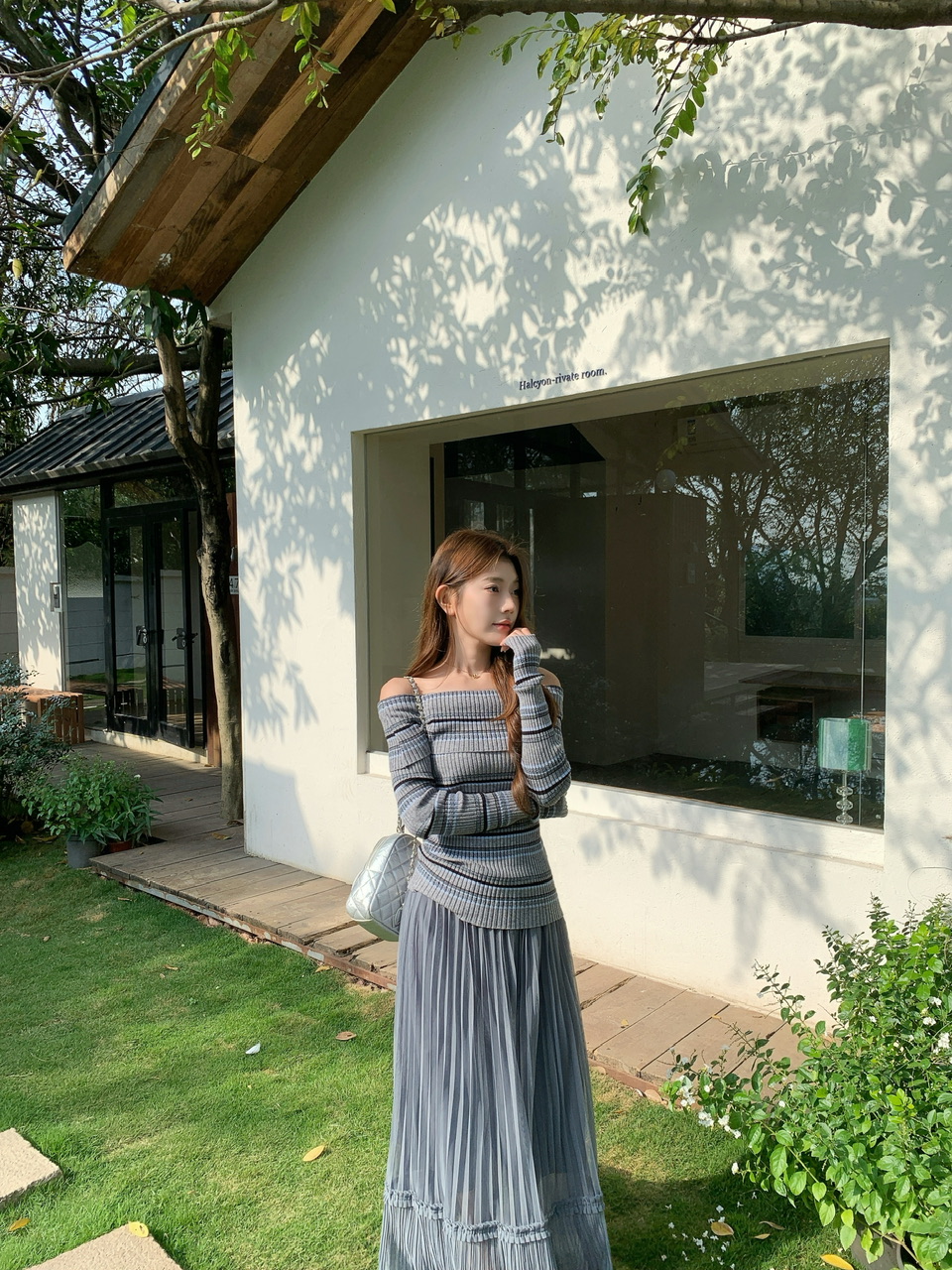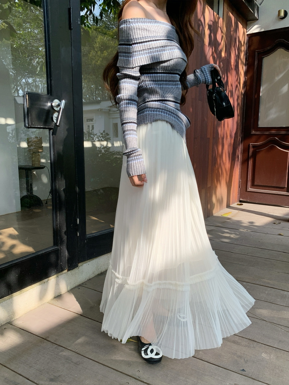 정가 실사 회색 스트라이프 오프숄더 니트 스웨터 여성 가을 하이웨이스트 플리츠 롱 스커트 부드러운 느긋한 바람 투피스 세트