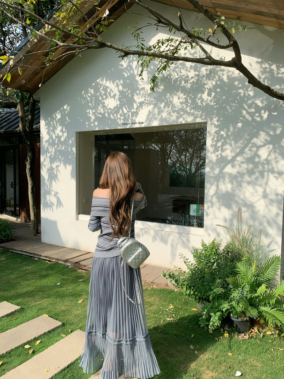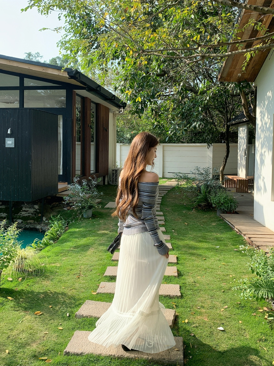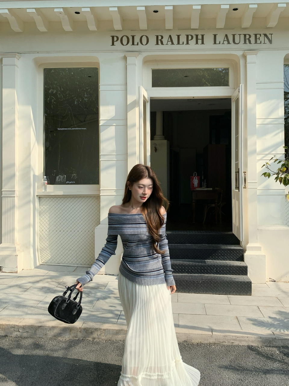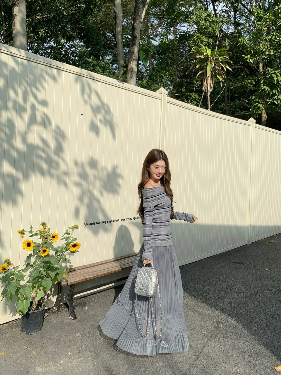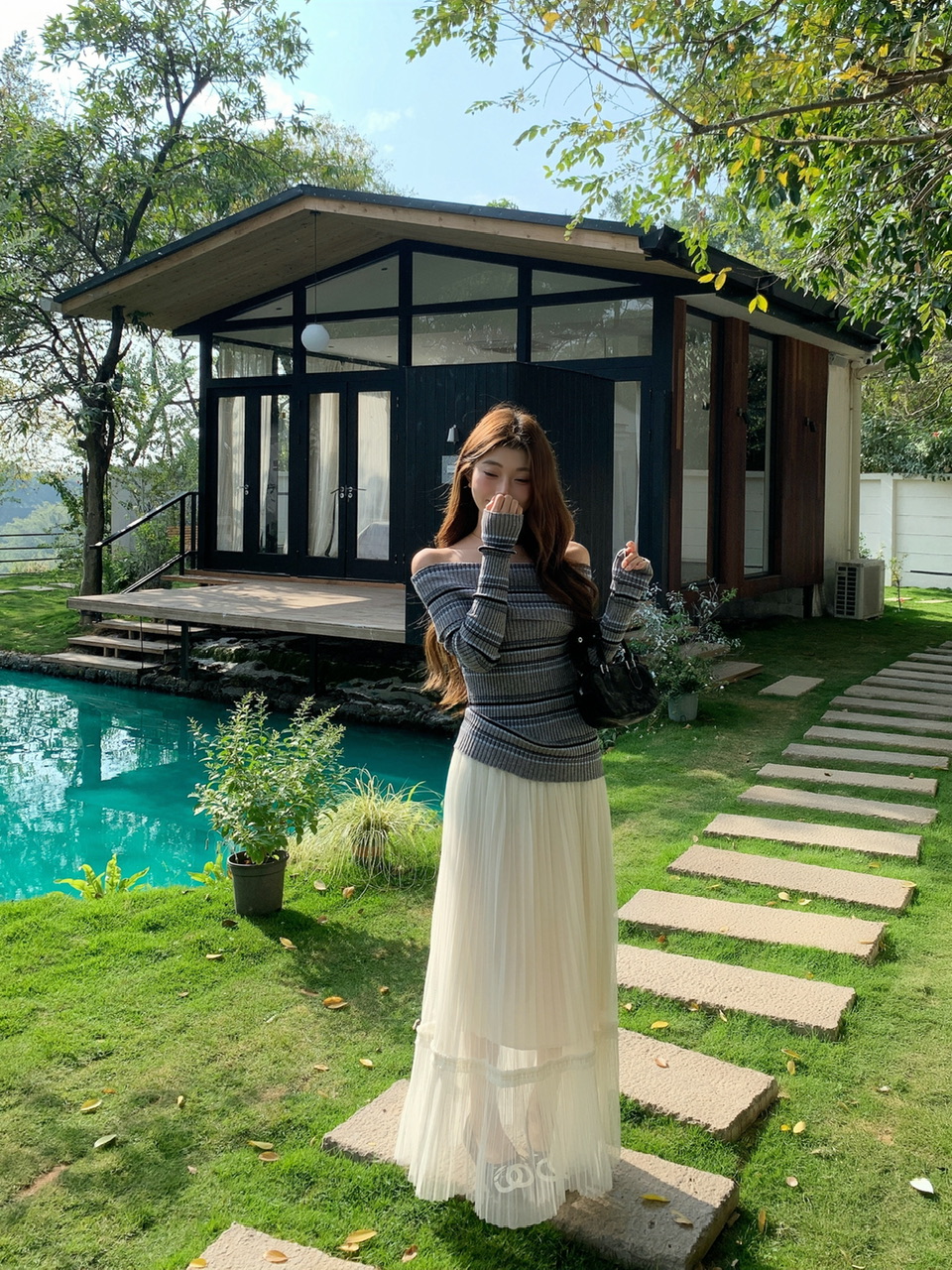 정가 실사 회색 스트라이프 오프숄더 니트 스웨터 여성 가을 하이웨이스트 플리츠 롱 스커트 부드러운 느긋한 바람 투피스 세트