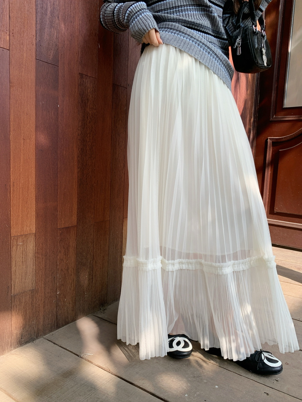 정가 실사 느긋한 몸매 가꾸기 대 u 칼라 기본 셔츠 하이웨이스트 슬림해 보이는 회색 보라색 프릴 반신 롱 스커트