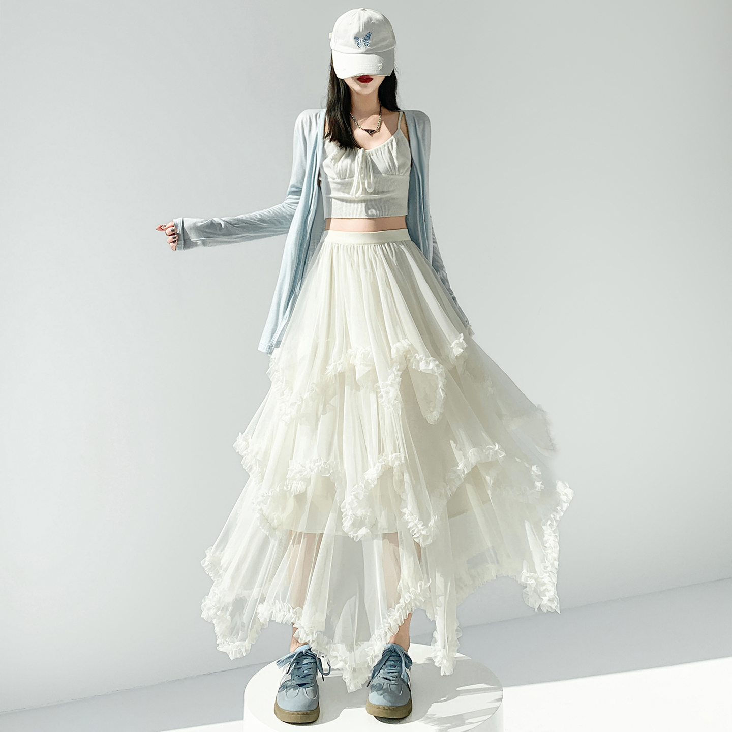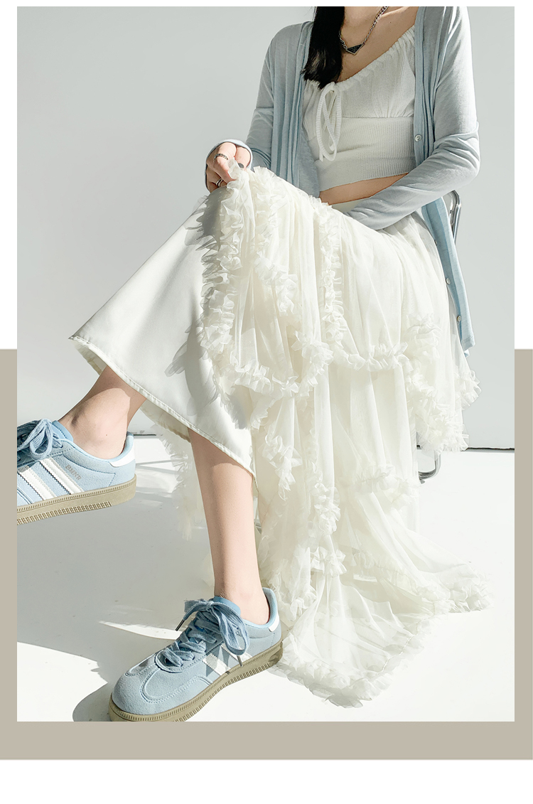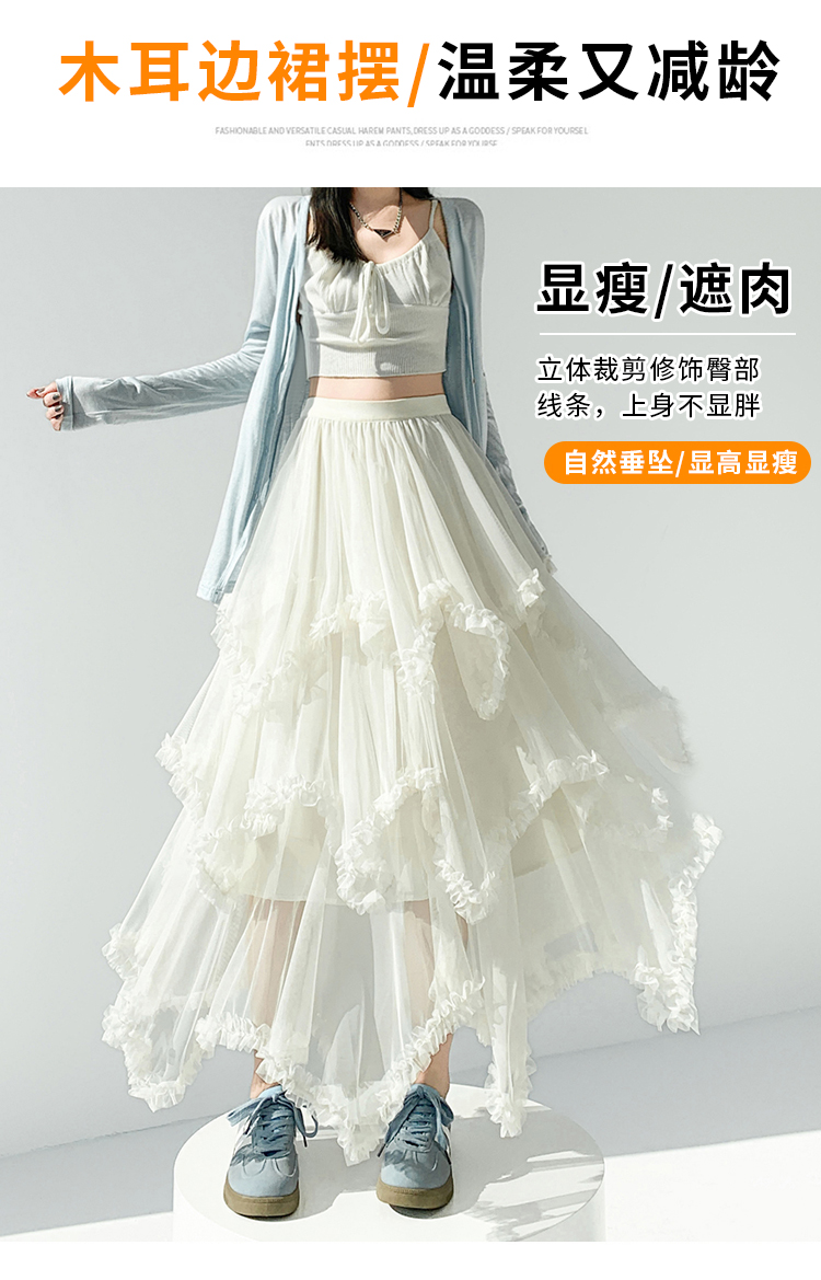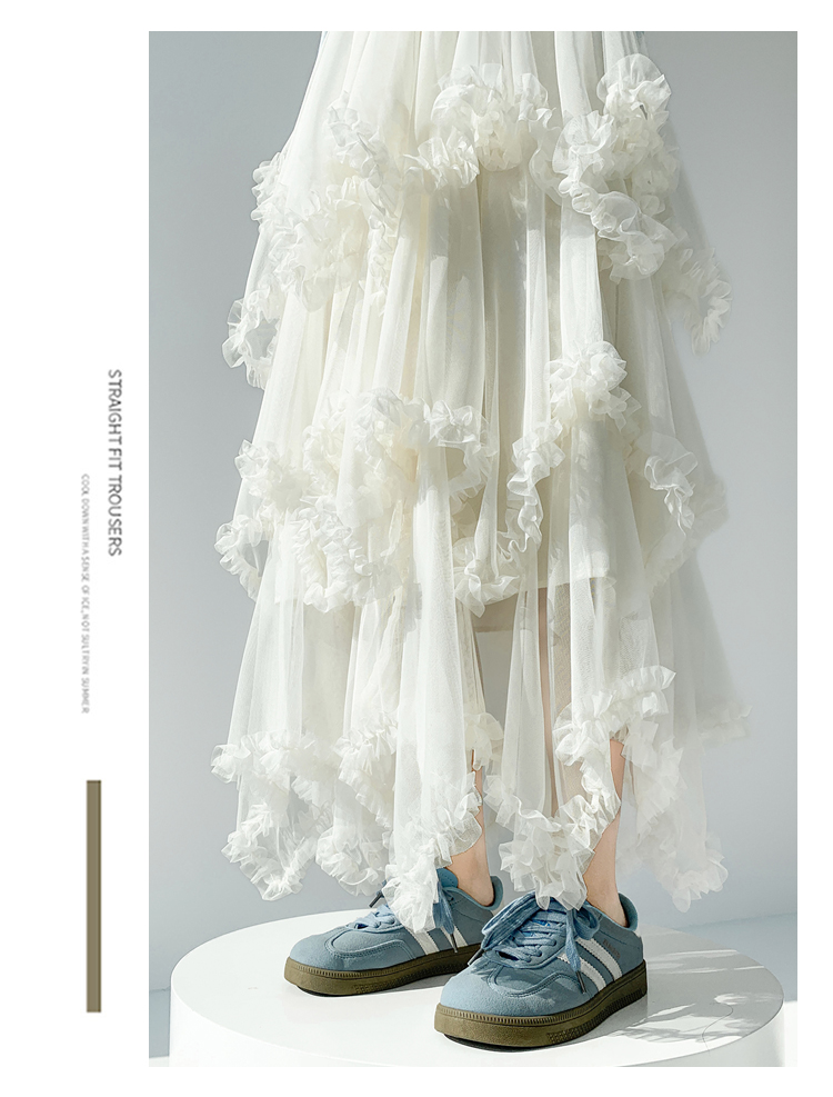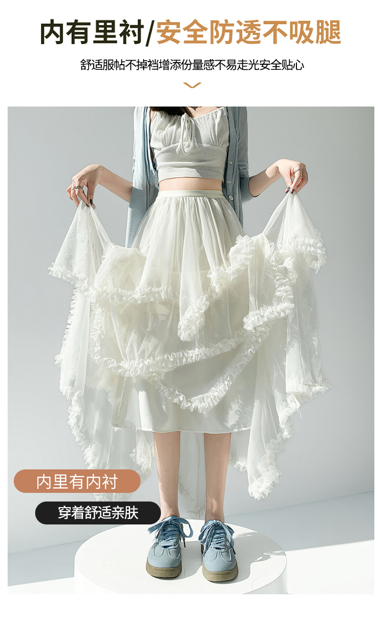 실사 화이트 프릴 불규칙 레이스 조각 쉬폰 반신 스커트 여성 여름 하이웨이스트 루즈핏 한 마디 롱 스커트