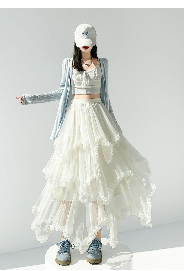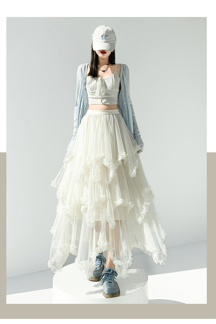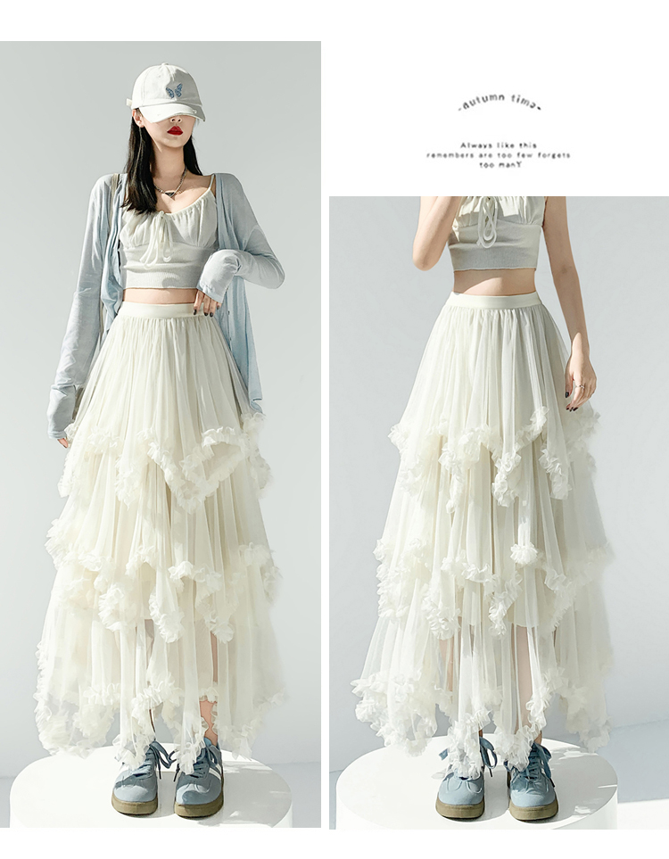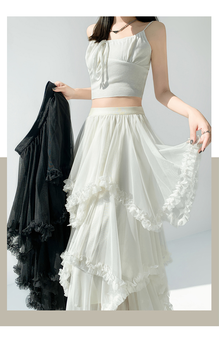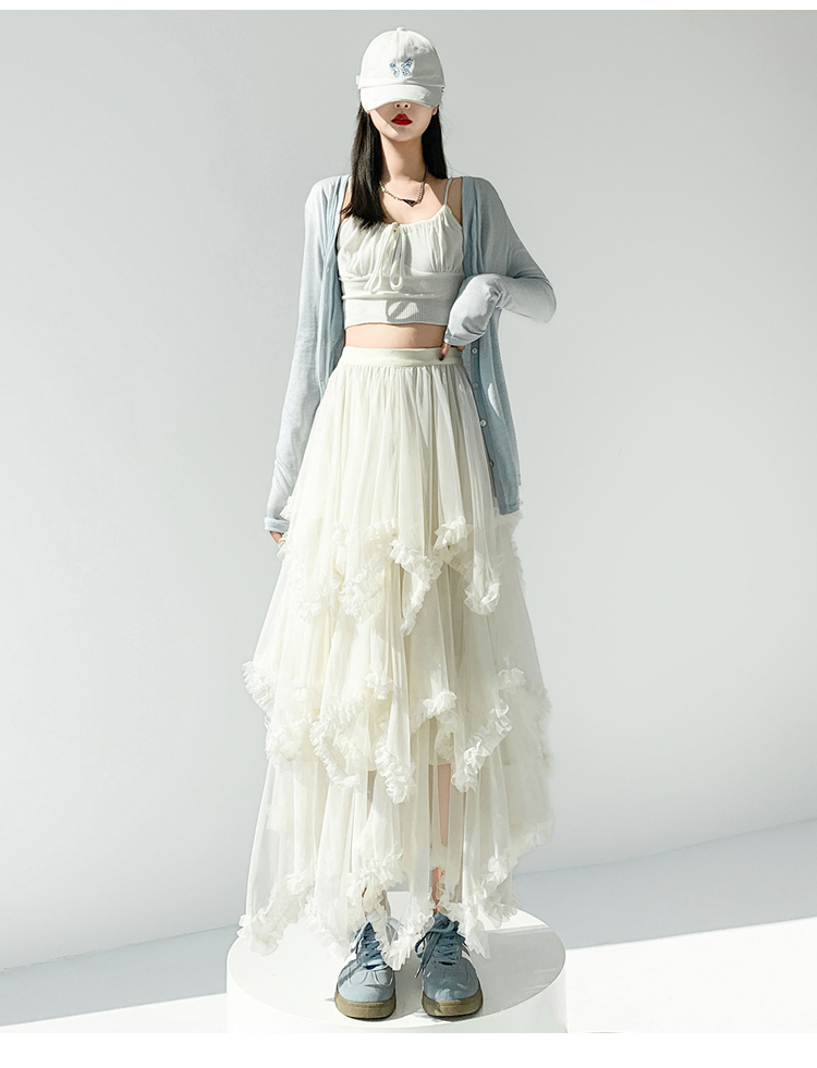 실사 화이트 프릴 불규칙 레이스 조각 쉬폰 반신 스커트 여성 여름 하이웨이스트 루즈핏 한 마디 롱 스커트