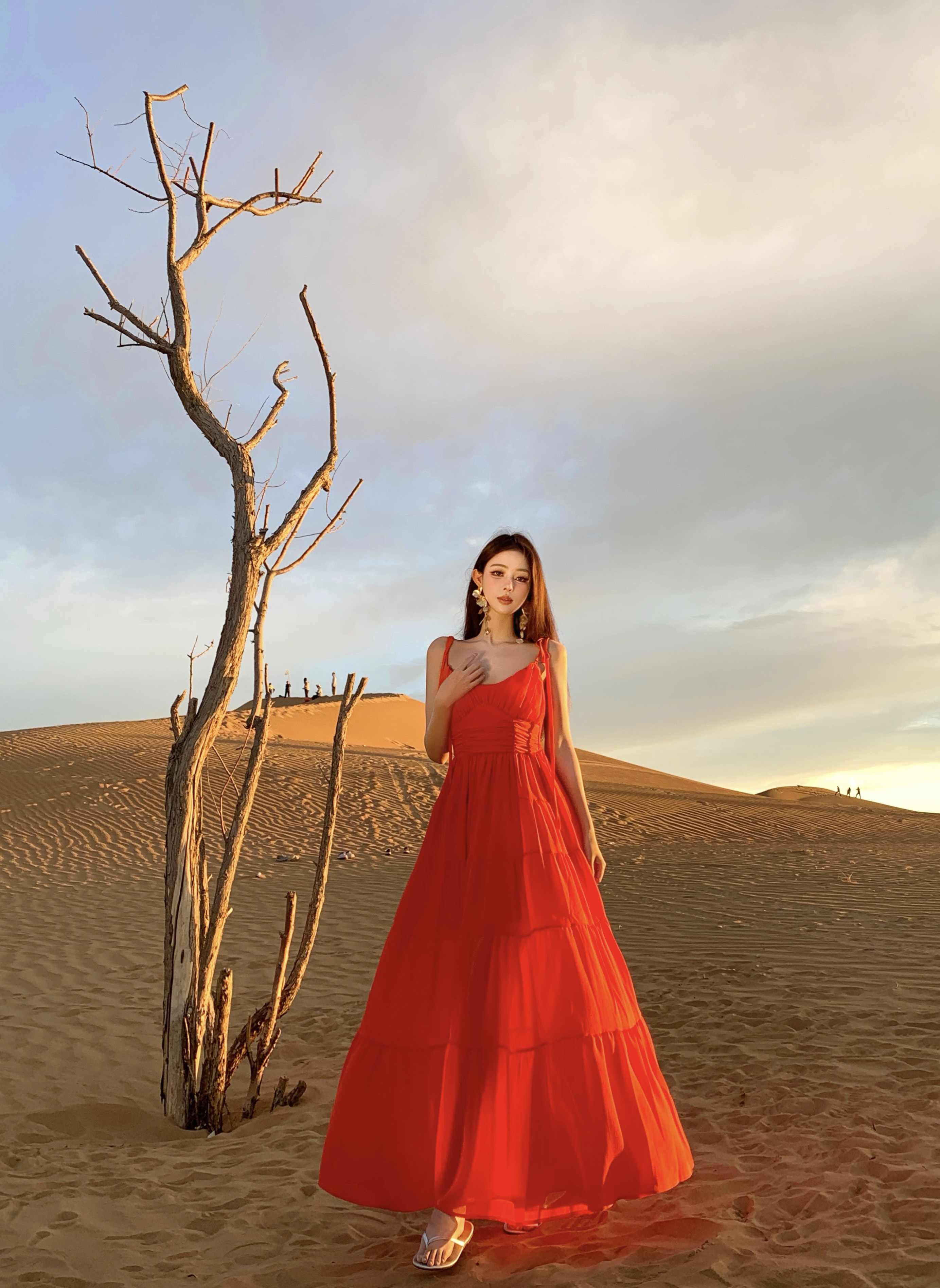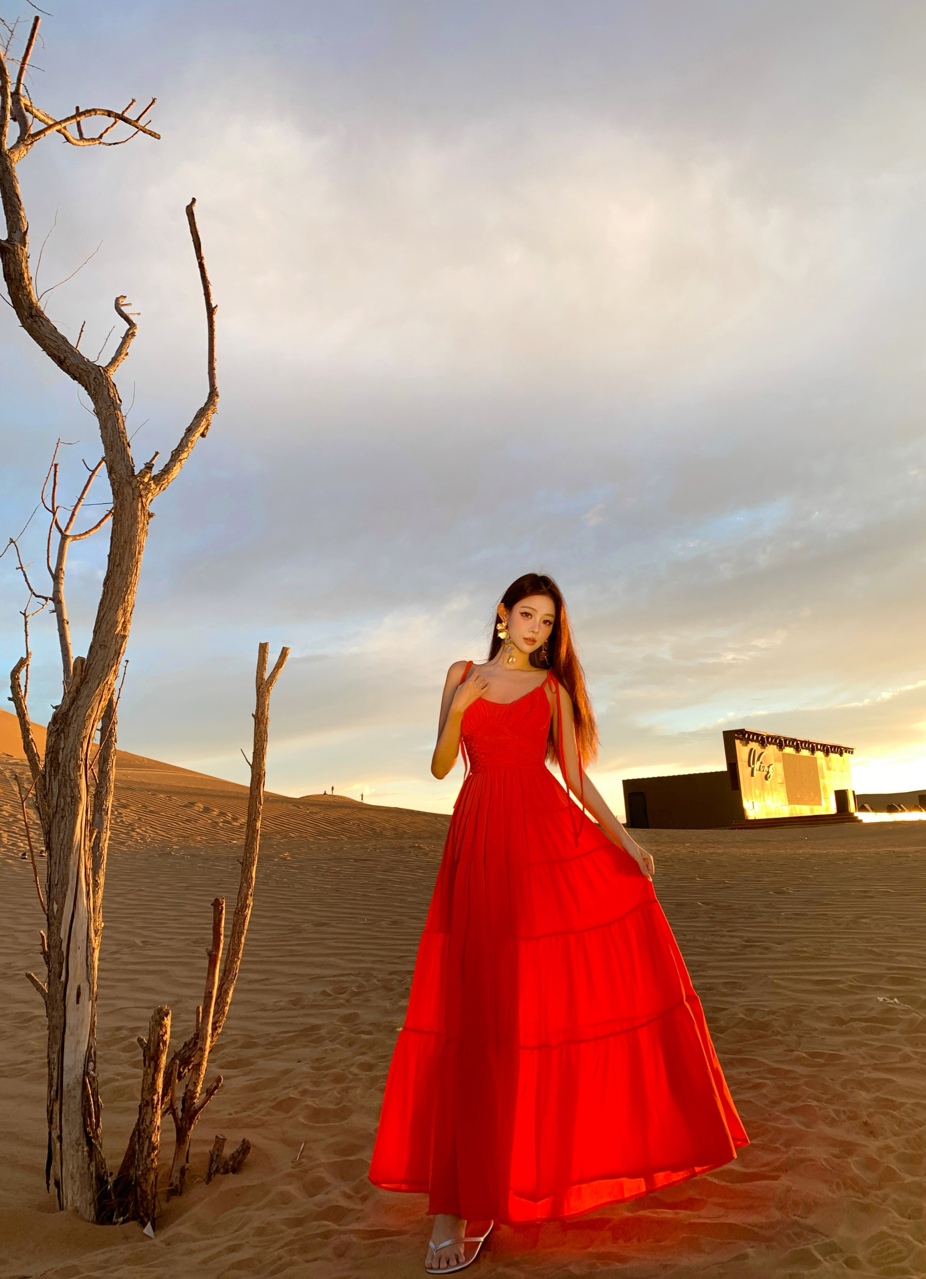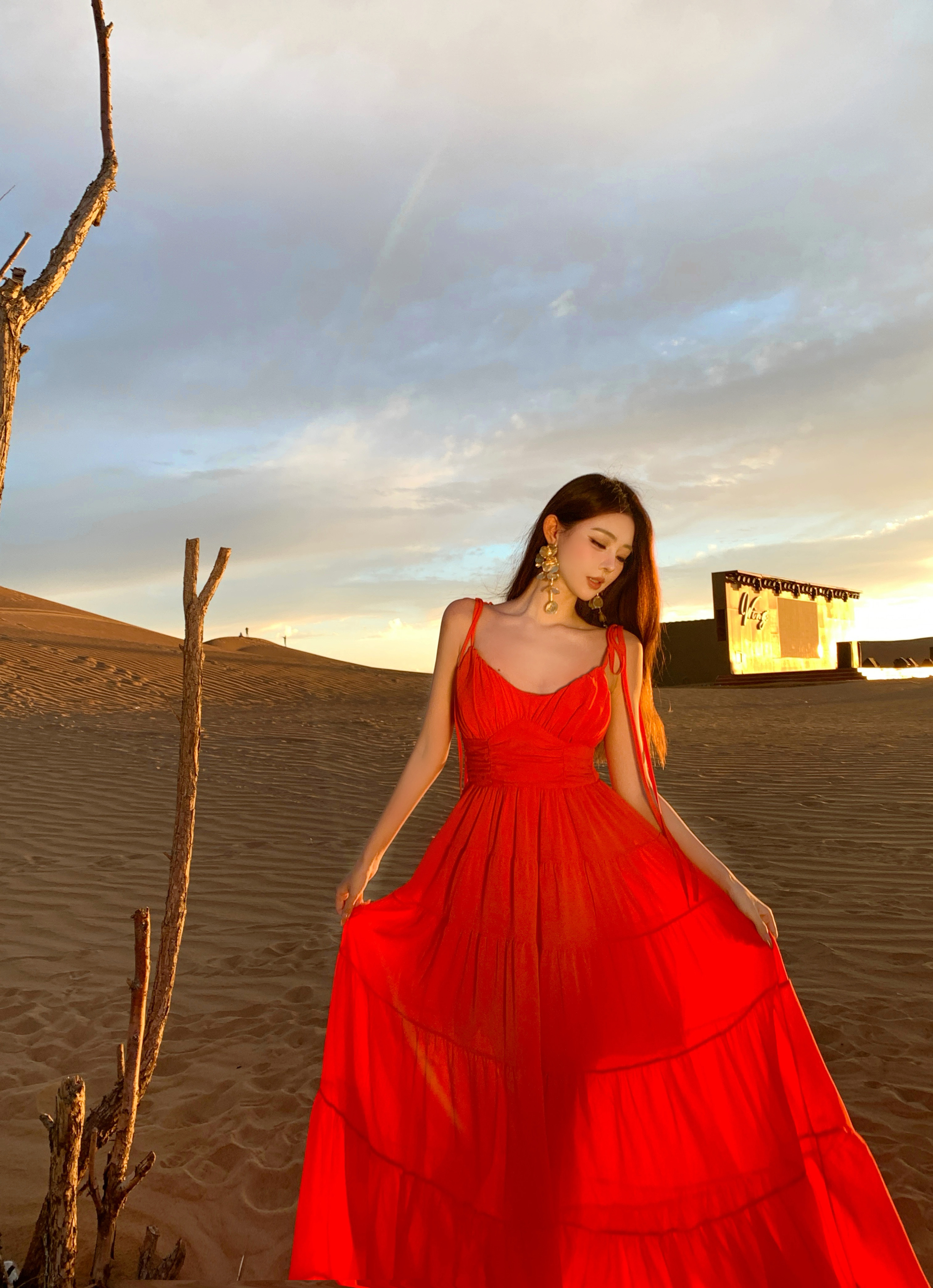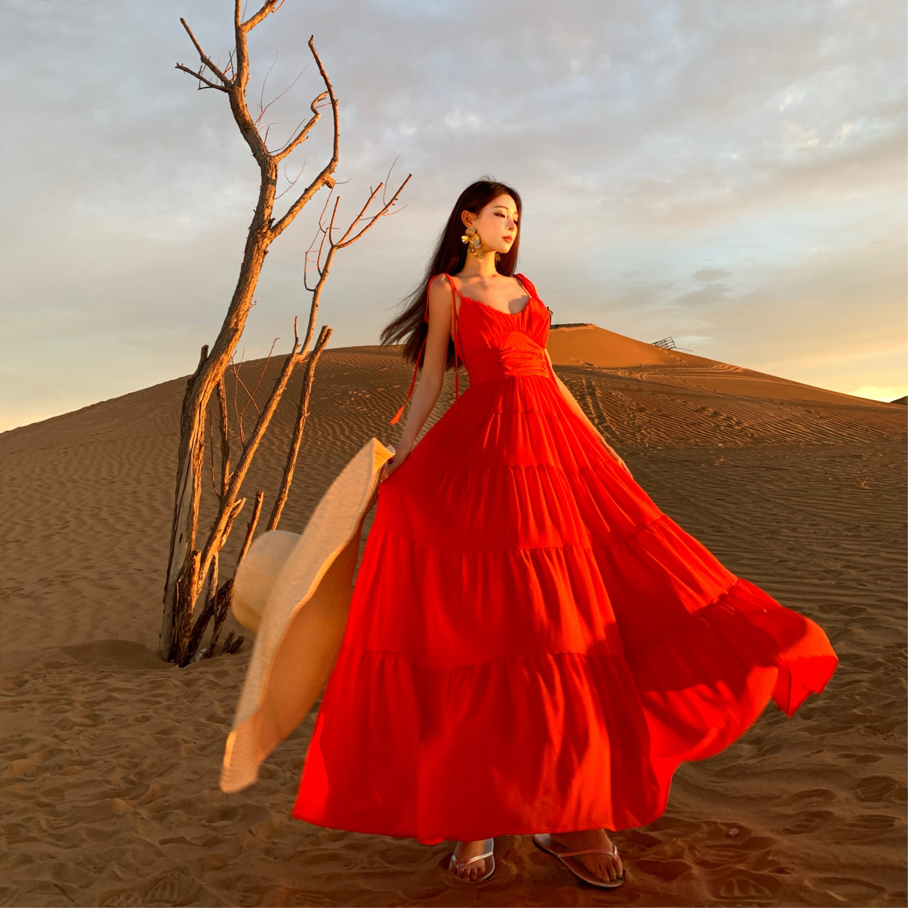 프랑스식 레트로 빨간색 V넥 슬립 드레스 아름다운 루즈핏 휴가 해변 드레스 섹시함 백리스 케이크 롱 스커트