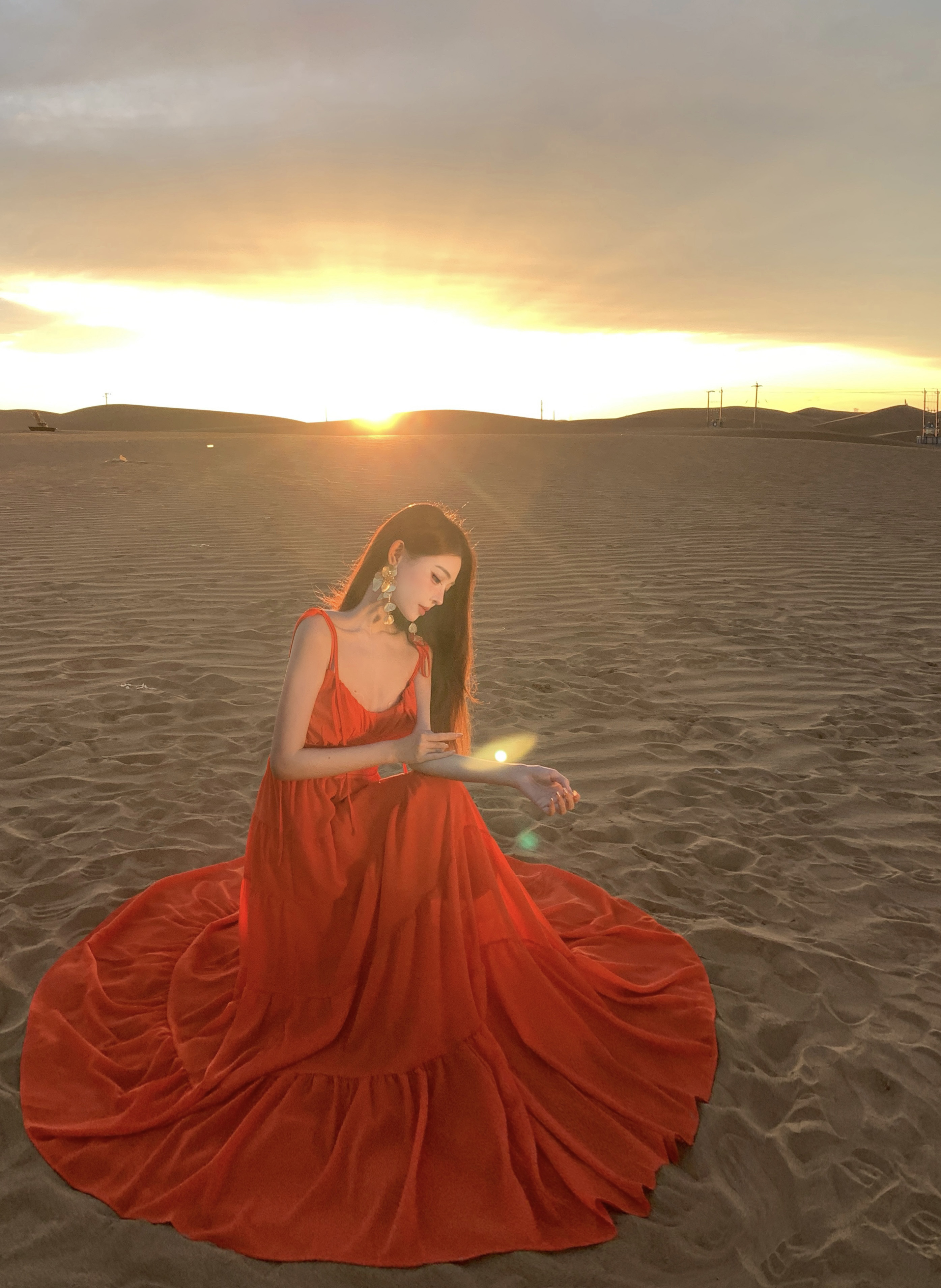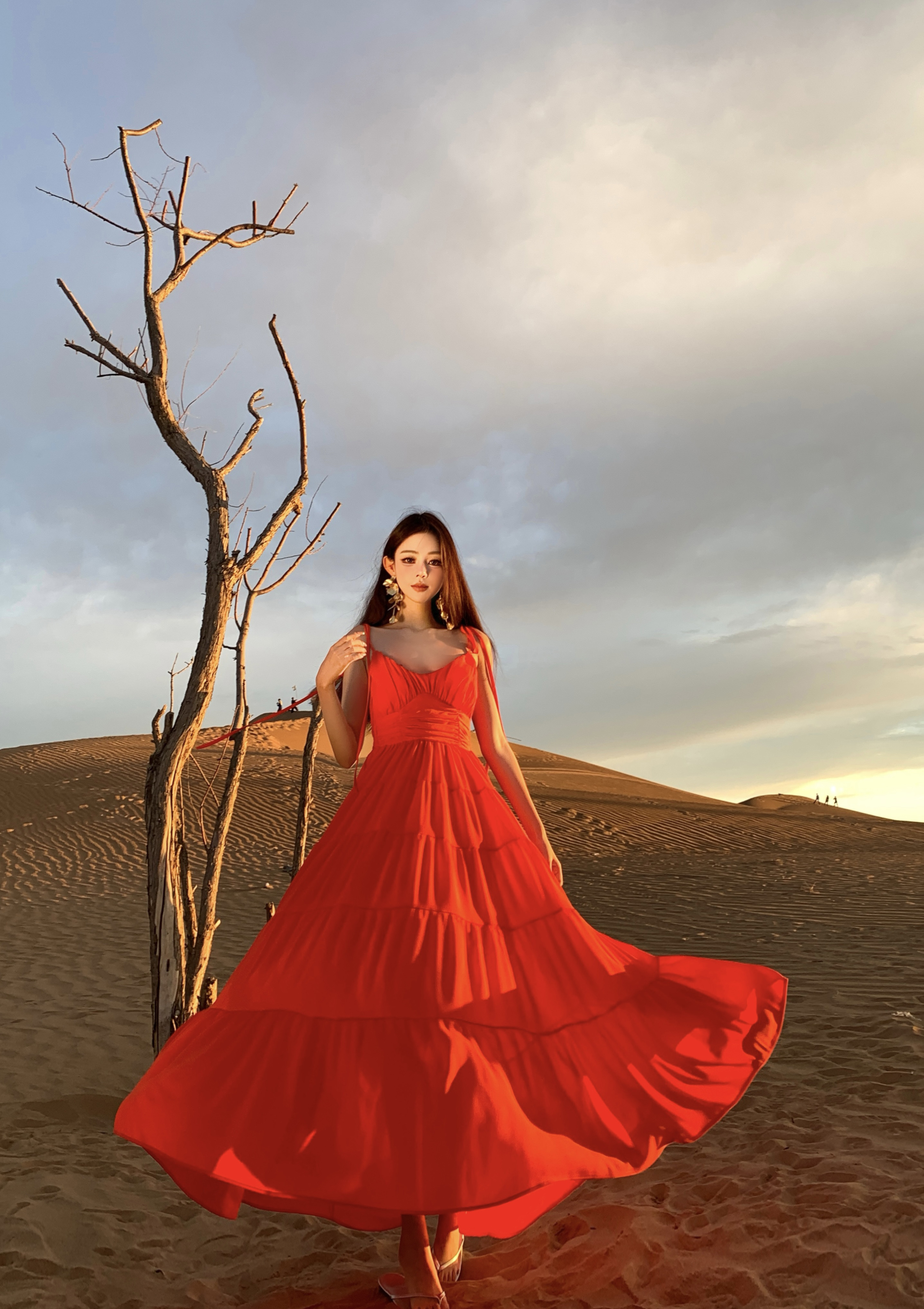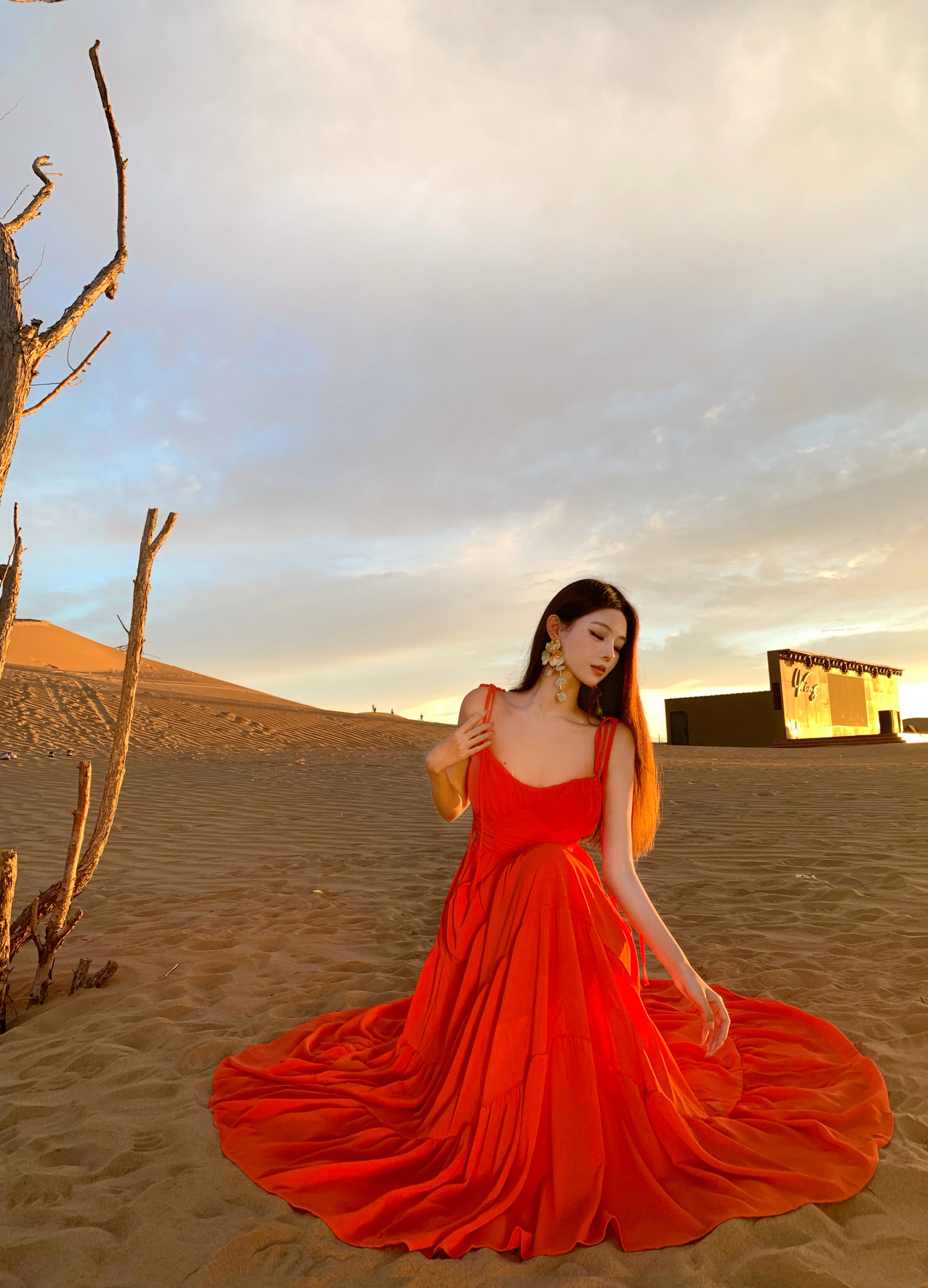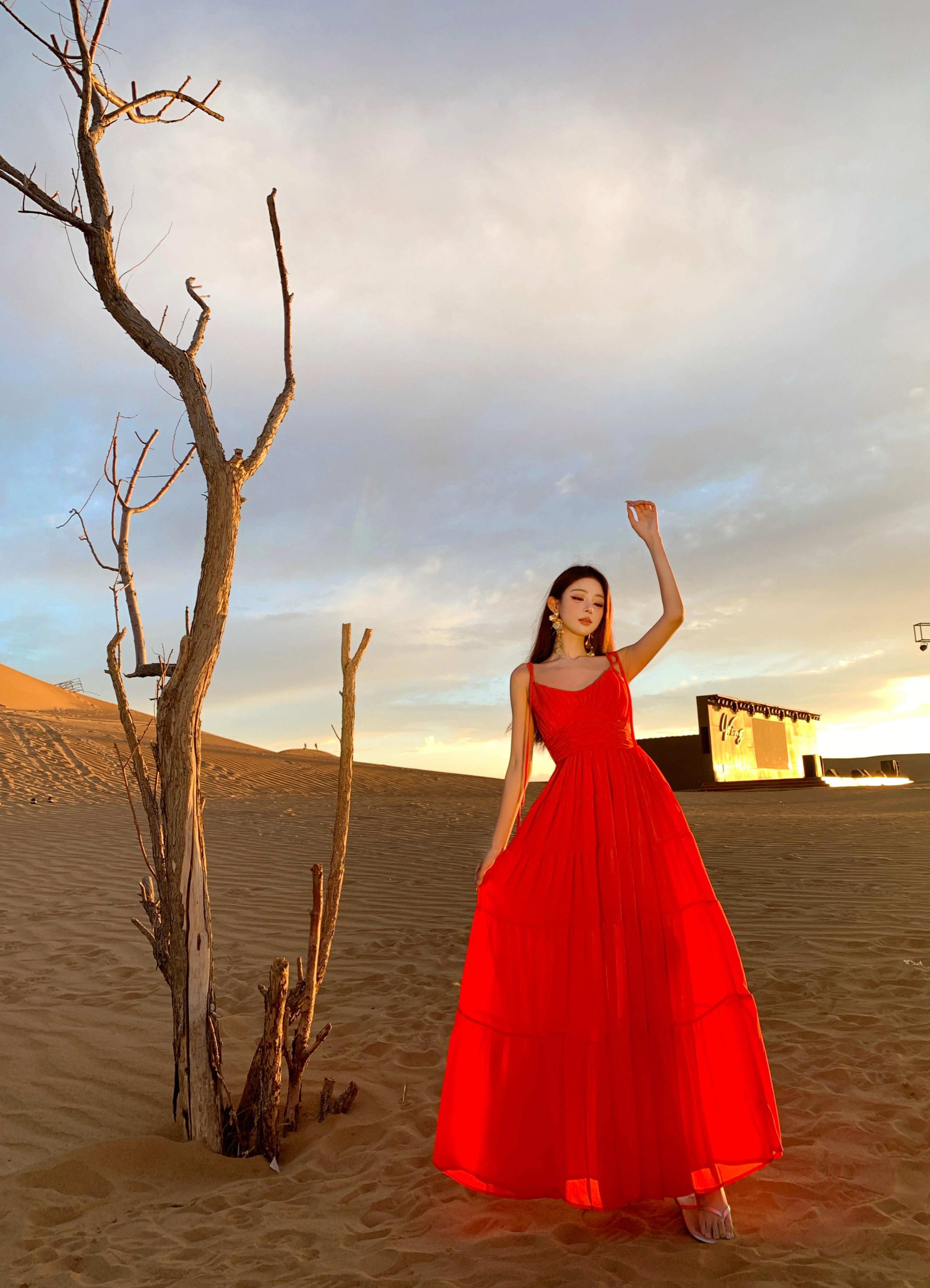 프랑스식 레트로 빨간색 V넥 슬립 드레스 아름다운 루즈핏 휴가 해변 드레스 섹시함 백리스 케이크 롱 스커트