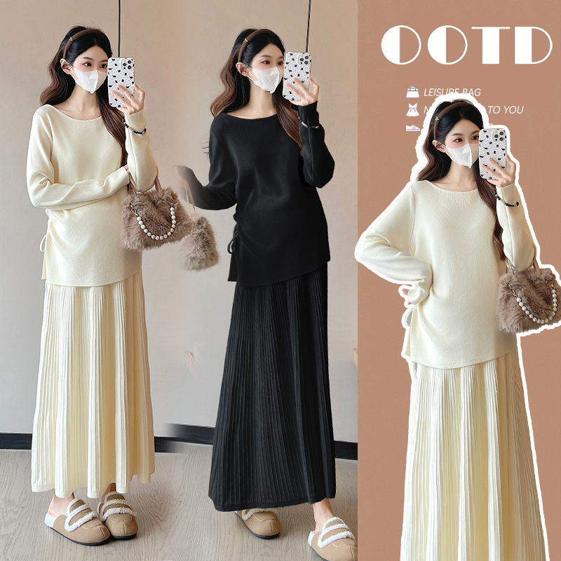 실사 지금 지금 한국 스타일 출산 착용 두꺼운 임산부 투피스 세트 펌프 로프 맨위 백 하프 치마 세트