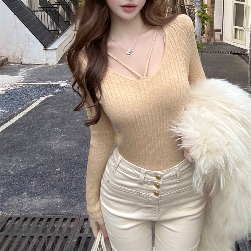 한국 신제품 빅 브이 넥 여성 구덩이 기사 니트 스웨터 여성 순수한 욕망 섹시함 몸매 가꾸기 풀오버 만나는 맨위