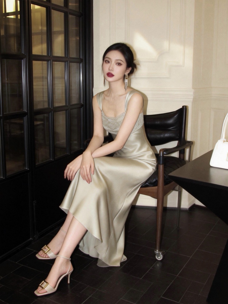 프랑스식 새틴 슬립 여성 드레스 고급 펌프 Pleat 디자인 허리 수축 슬림해 보이는 롱 스커트