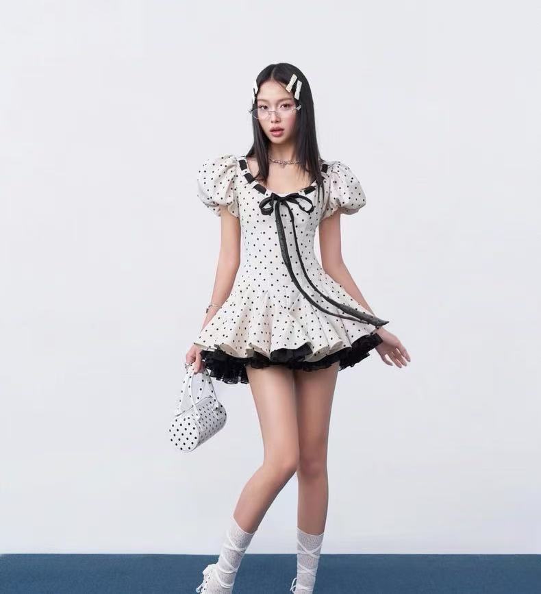 둘 착용 3 차원 프릴 오프숄더 레트로 도트 무늬 여성 드레스 허리 수축 롱 스커트
