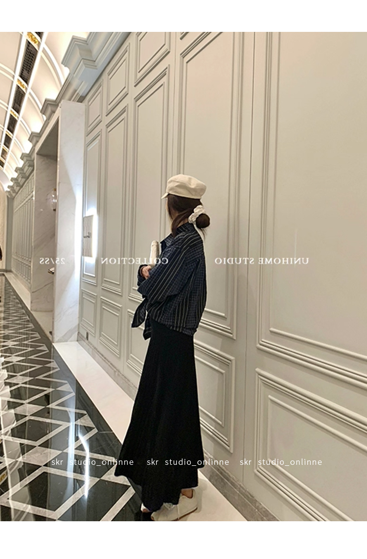 레트로 느긋한 스트라이프 니트 반신 스커트 여성 가을 겨울 롱 코트 하이웨이스트 슬림해 보이는 타이트 스커트 A라인 스커트 양모 니트 원피스