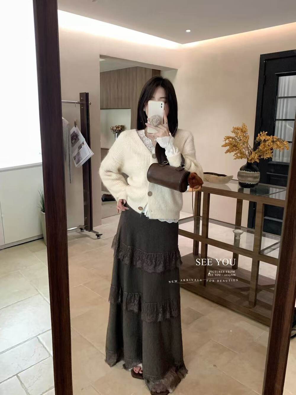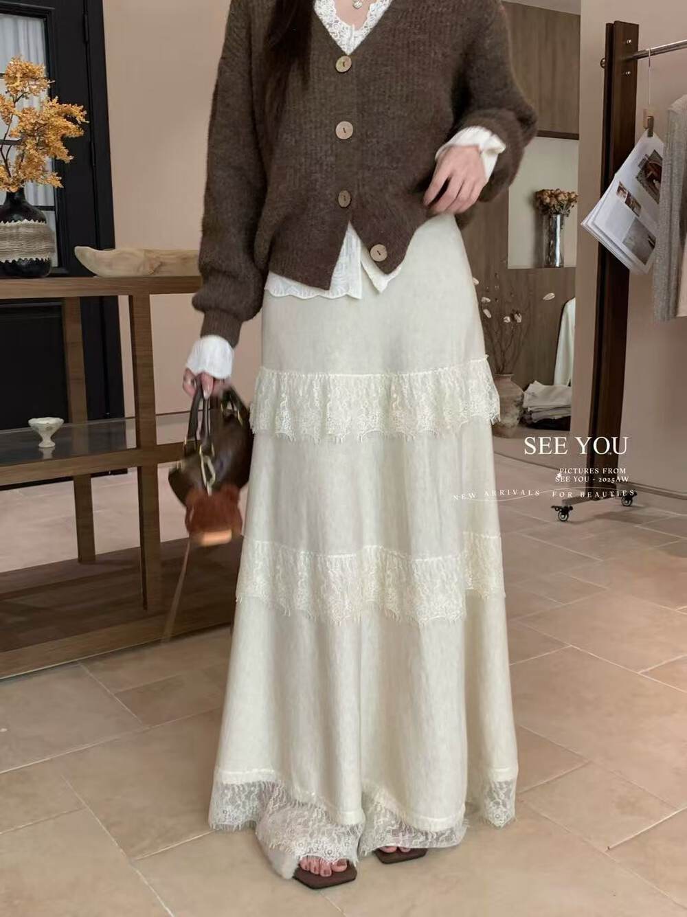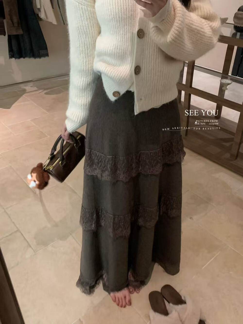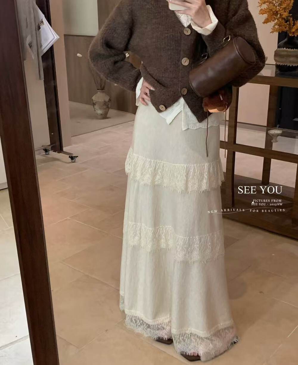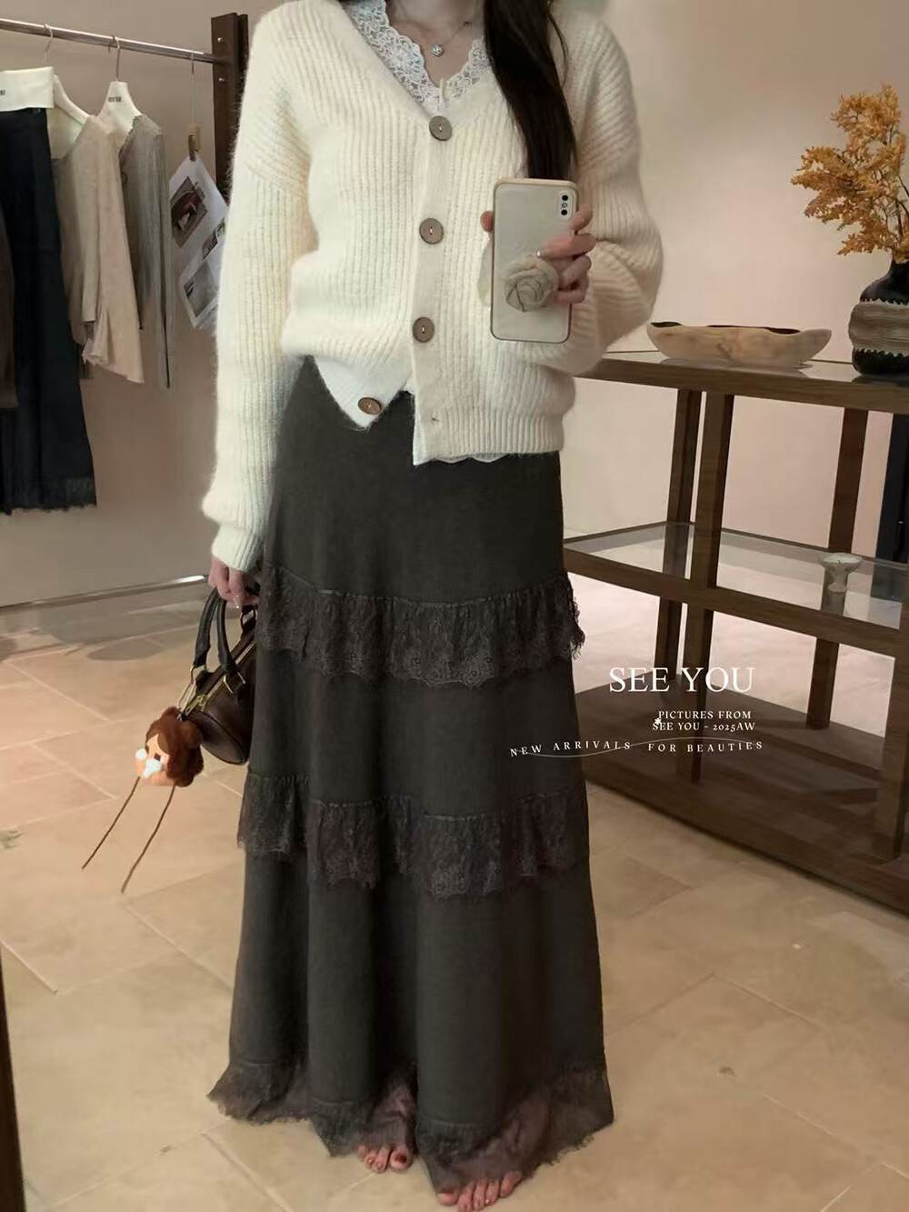 hers 미니멀리즘 절묘한 품격 레이스 조각 니트 반신 스커트 2025 가을 겨울 다용도 슬림해 보이는 중간 길이 스커트 아이들