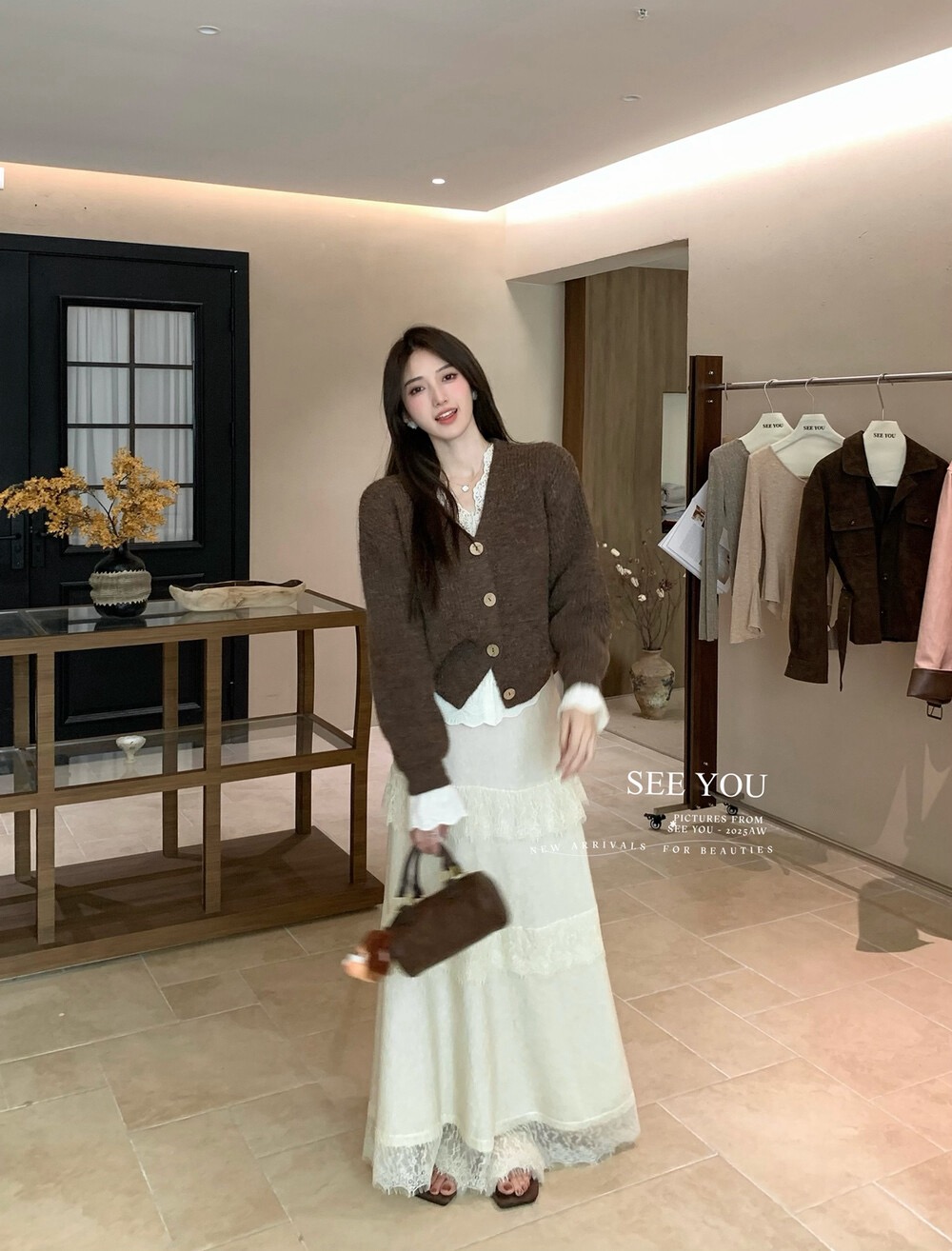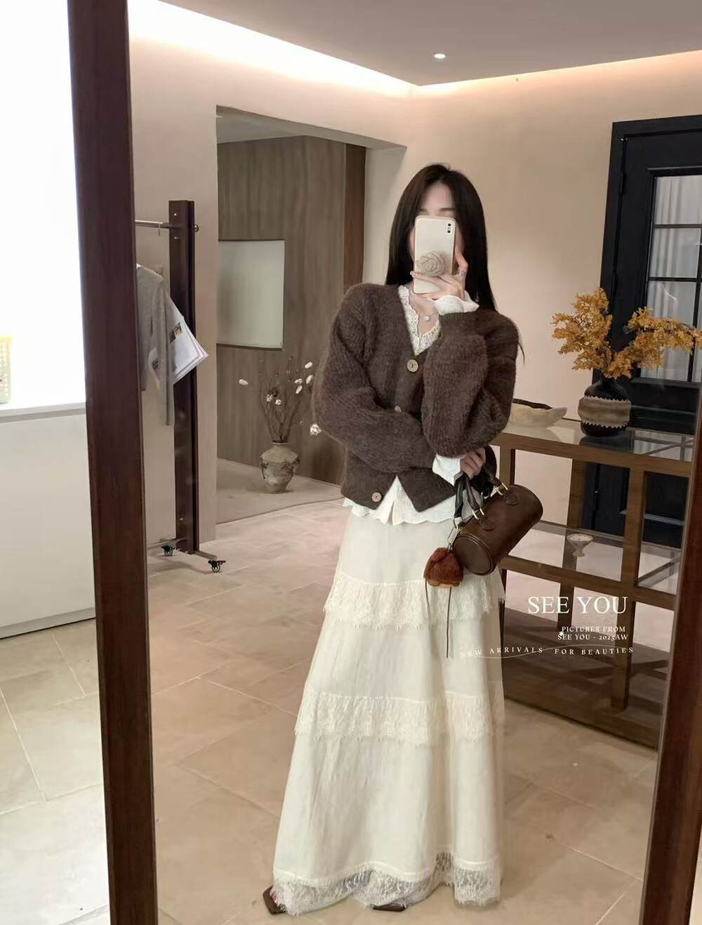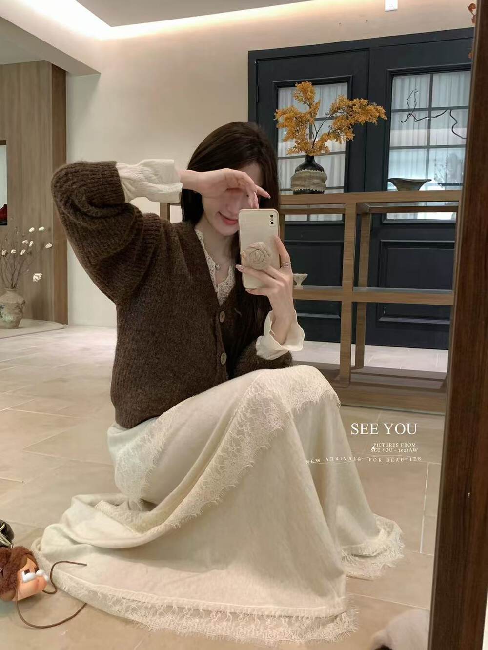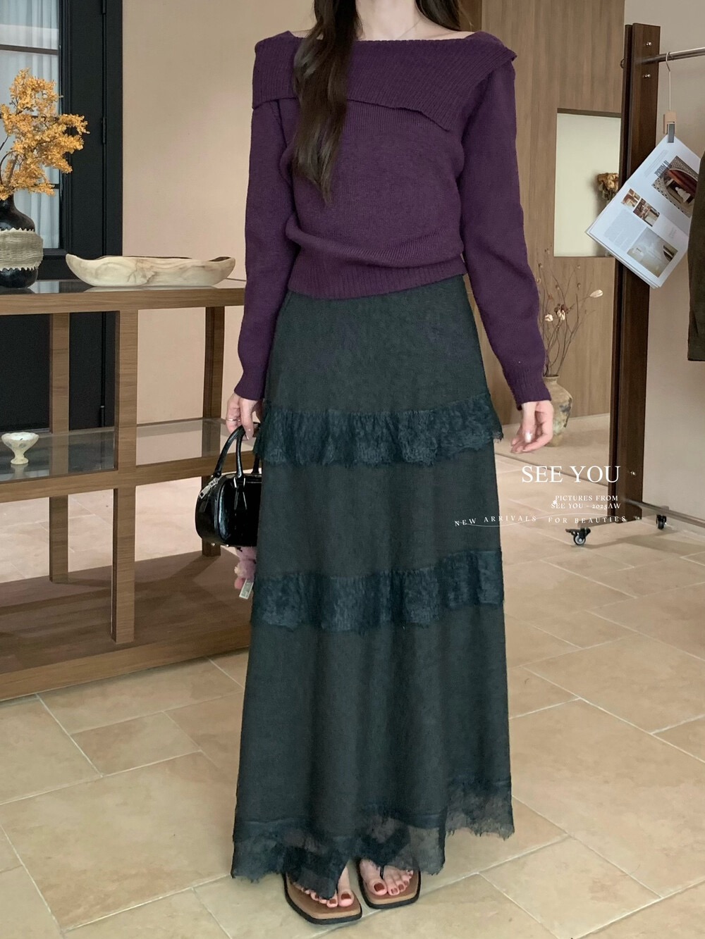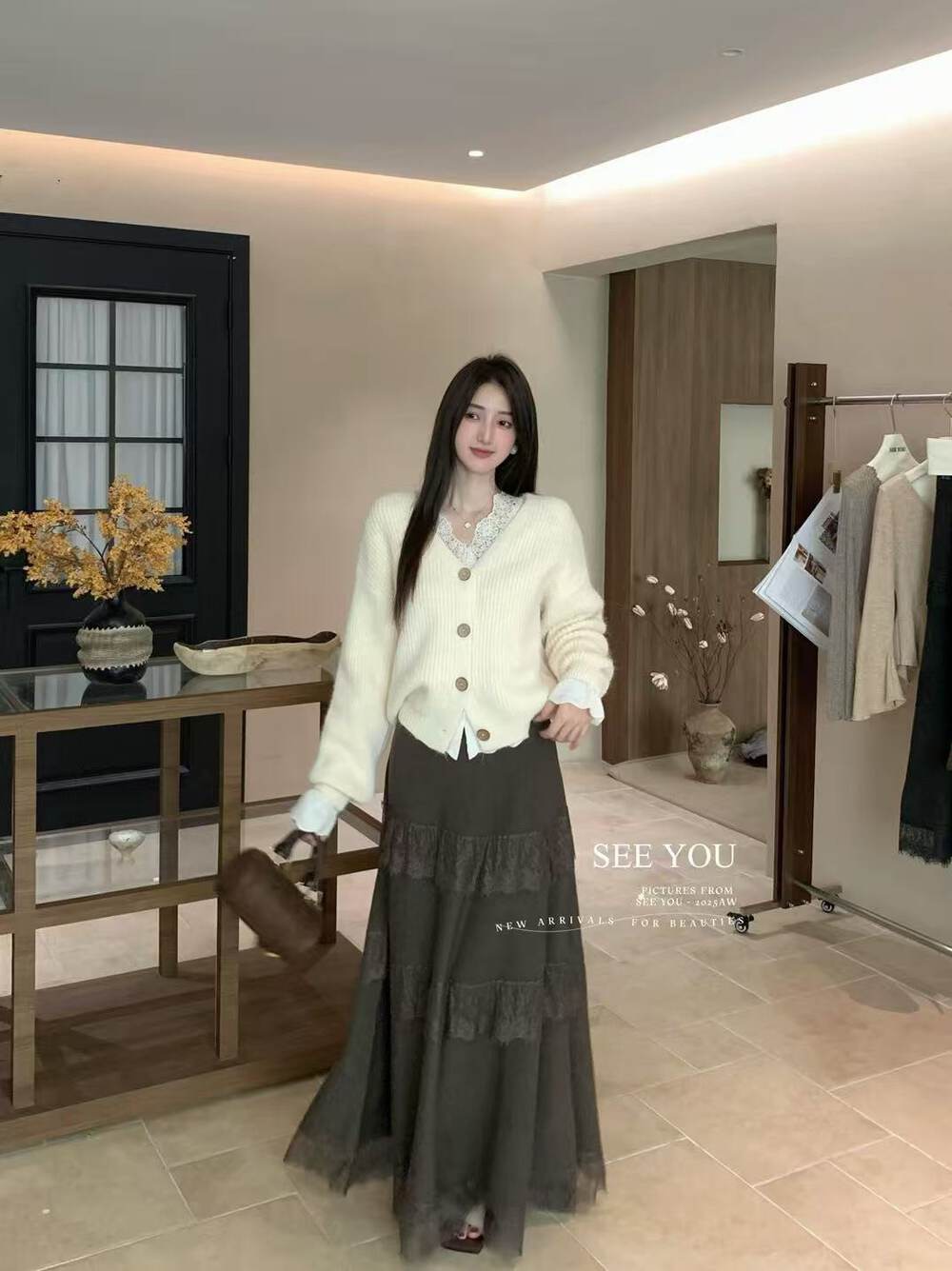 hers 미니멀리즘 절묘한 품격 레이스 조각 니트 반신 스커트 2025 가을 겨울 다용도 슬림해 보이는 중간 길이 스커트 아이들