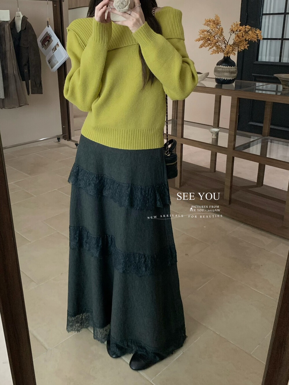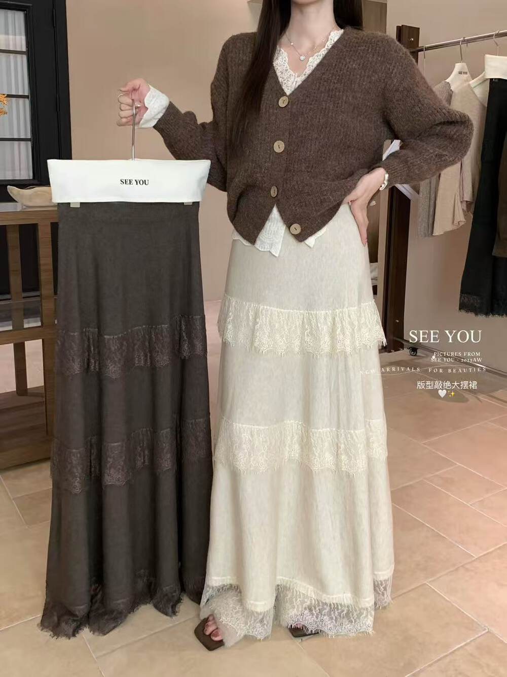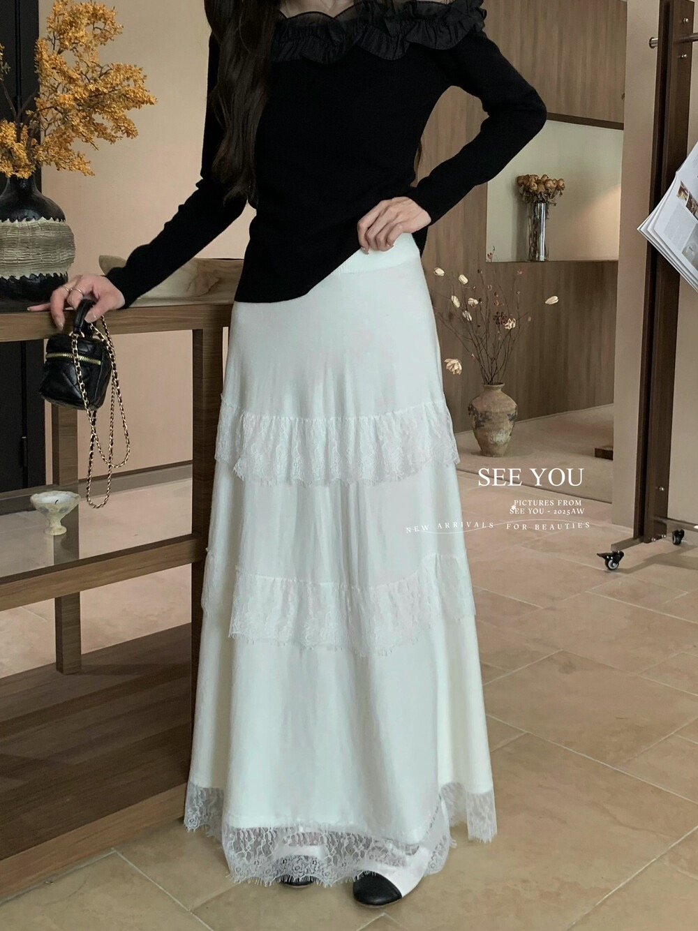 가을 겨울 새로운 한국 스타일 패션 다용도 하이웨이스트 슬림해 보이는 A라인 스커트 목이버섯 레이스 반신 스커트 니트 중간 길이 치마