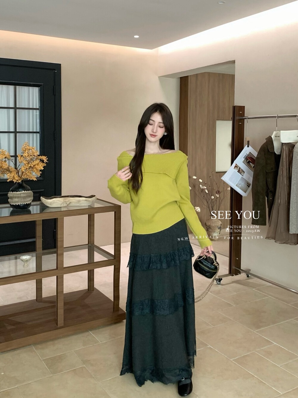 새로운 2025 가을 겨울 품격 우아함 부드러운 부서 도루 센스 다용도 슬림해 보이는 털실 니트 반신 스커트 여성