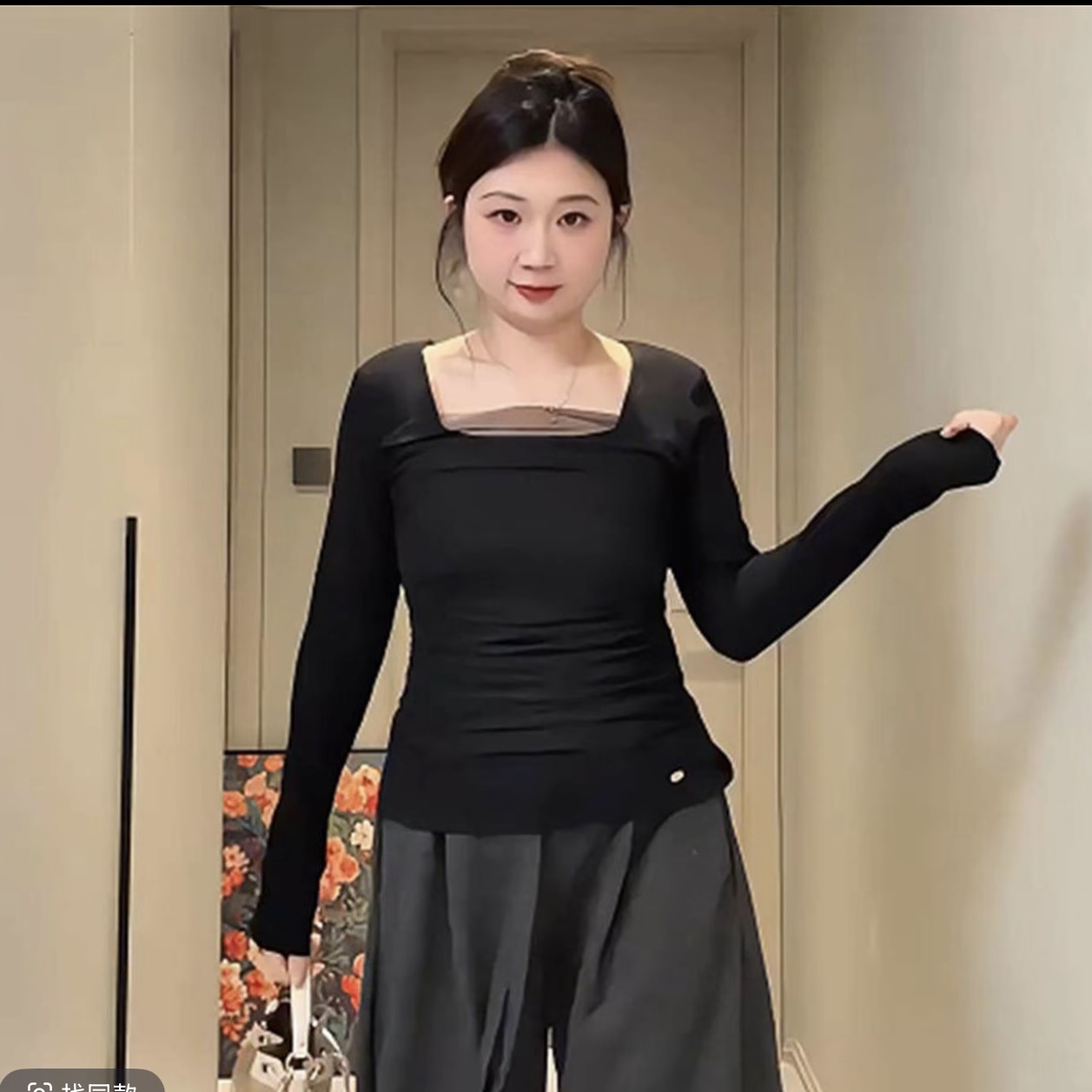 검정색 폴로 칼라 자수 꽃 여성 의류 봄 가을 2026 새로운 세련된 연령 감소 패션 미니멀리즘 맨위 만나는 몸매 가꾸기