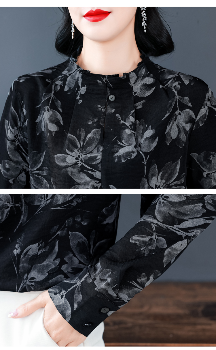 실사 프린트 체크무늬 뽕나무 누에 실크 긴팔 봄 프릴 스탠드 칼라 여성 셔츠 외국 가스 다용도 긴팔 맨위