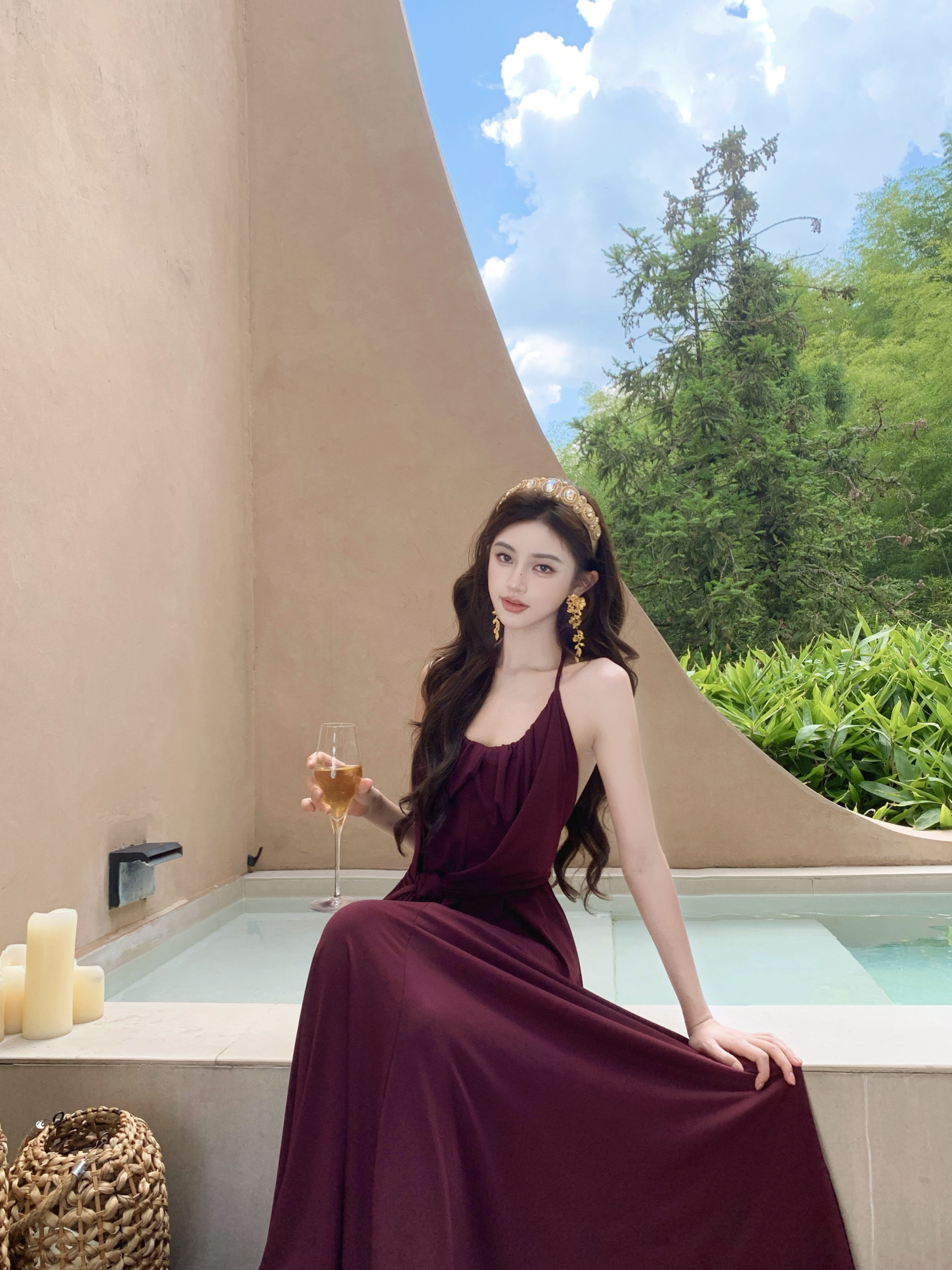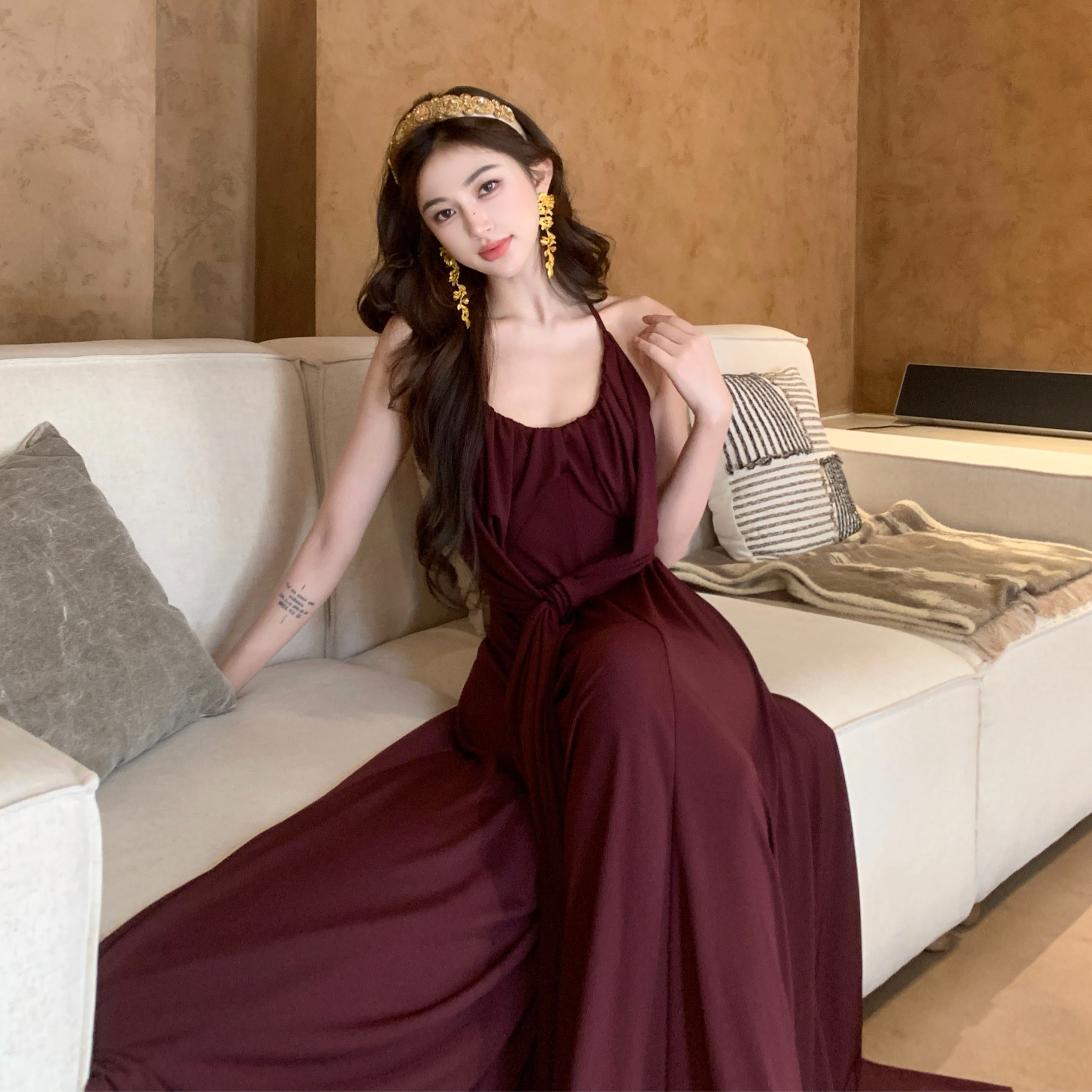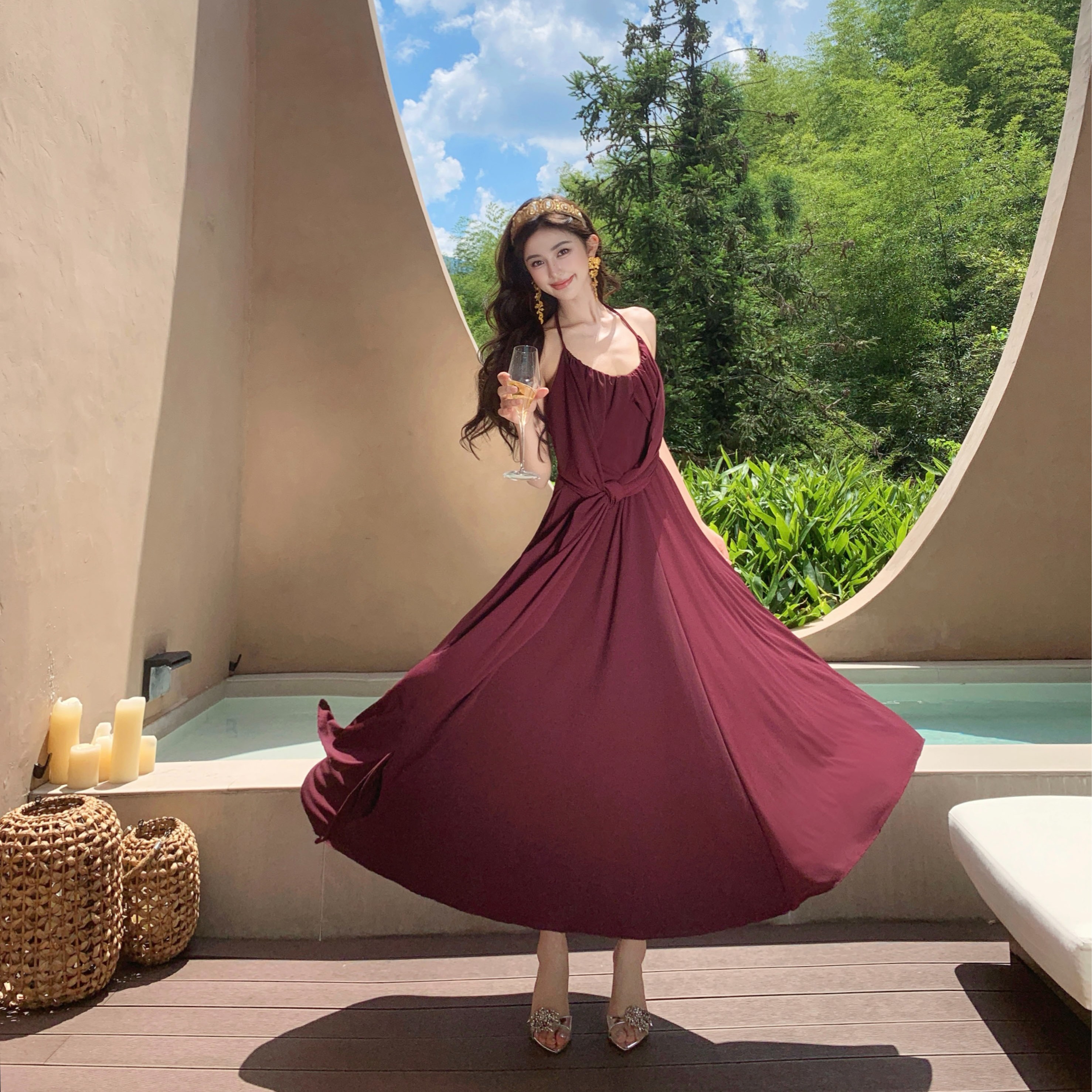 프랑스식 핫걸 순수한 욕망 바람 센스 백리스 슬립 여성 드레스 여름 새로운 품격 허리 수축 슬림해 보이는 큰 진자 롱 스커트