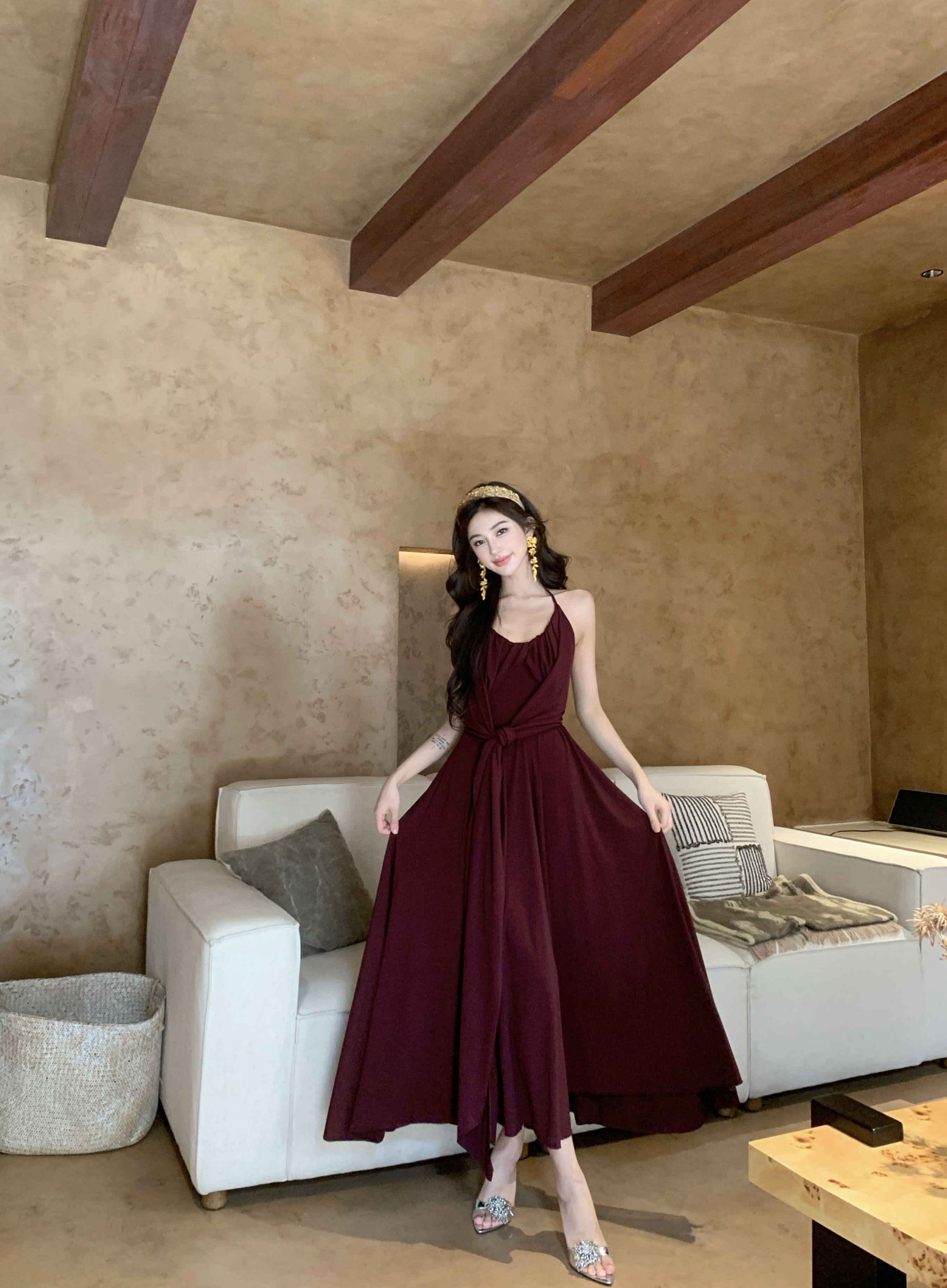 빨간색 롱 코트 V넥 오프숄더 허리 수축 행침 목 슬립 여성 드레스 여름 프랑스식 품격 섹시함 치마