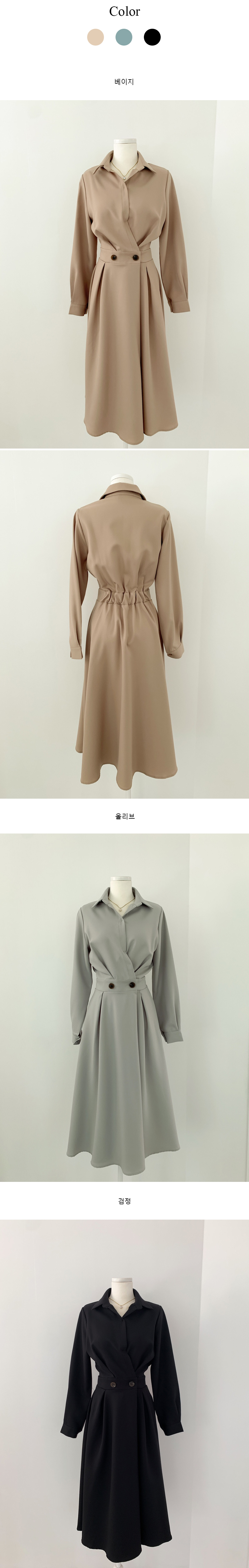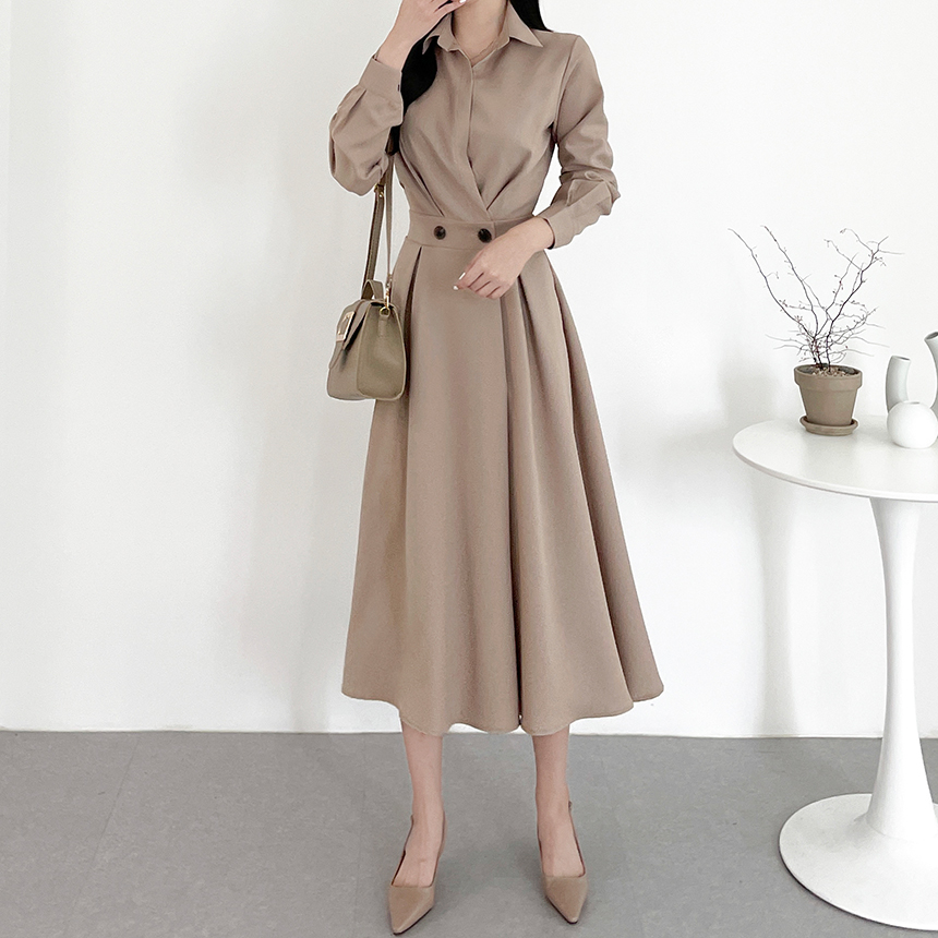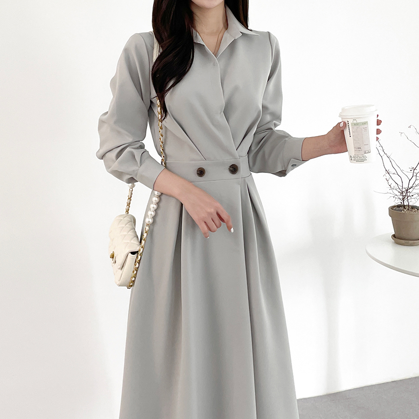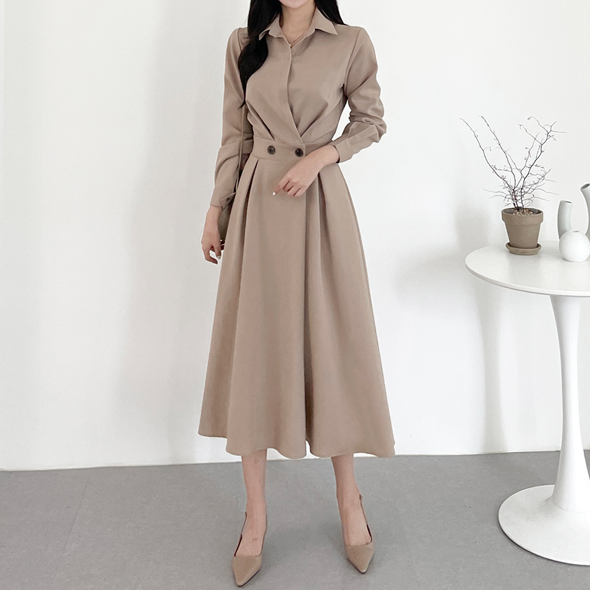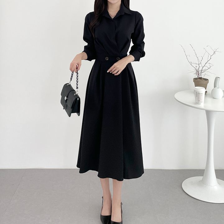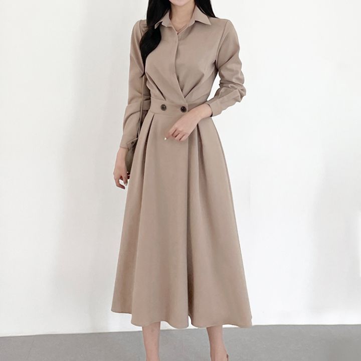 크기 업데이트 한국 chic 프랑스어 틈새 시장 디자인 허리 슬림 긴 소매 부서 버클 드레스