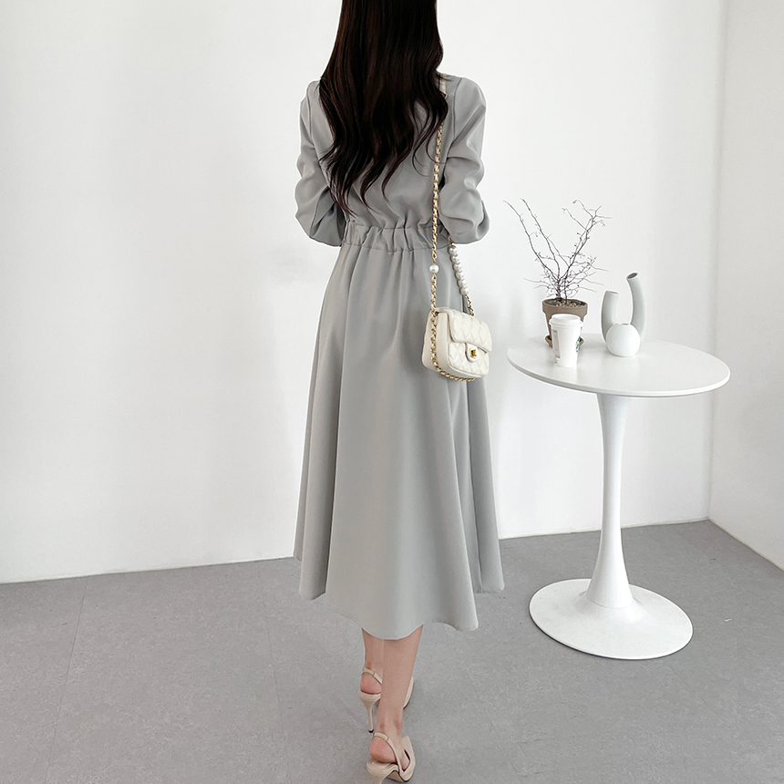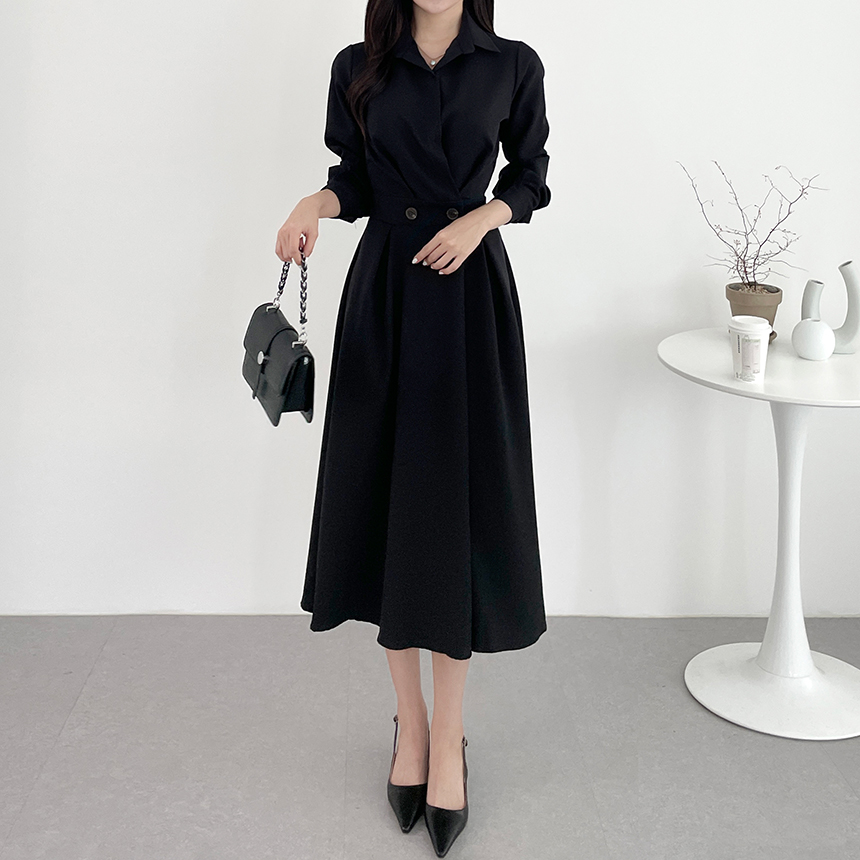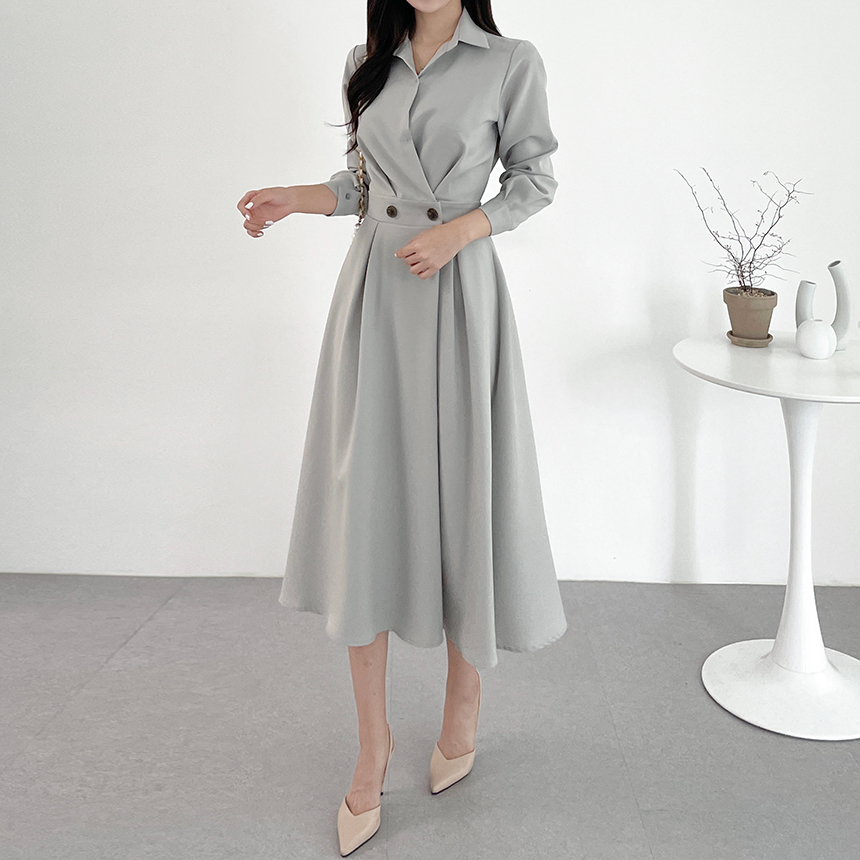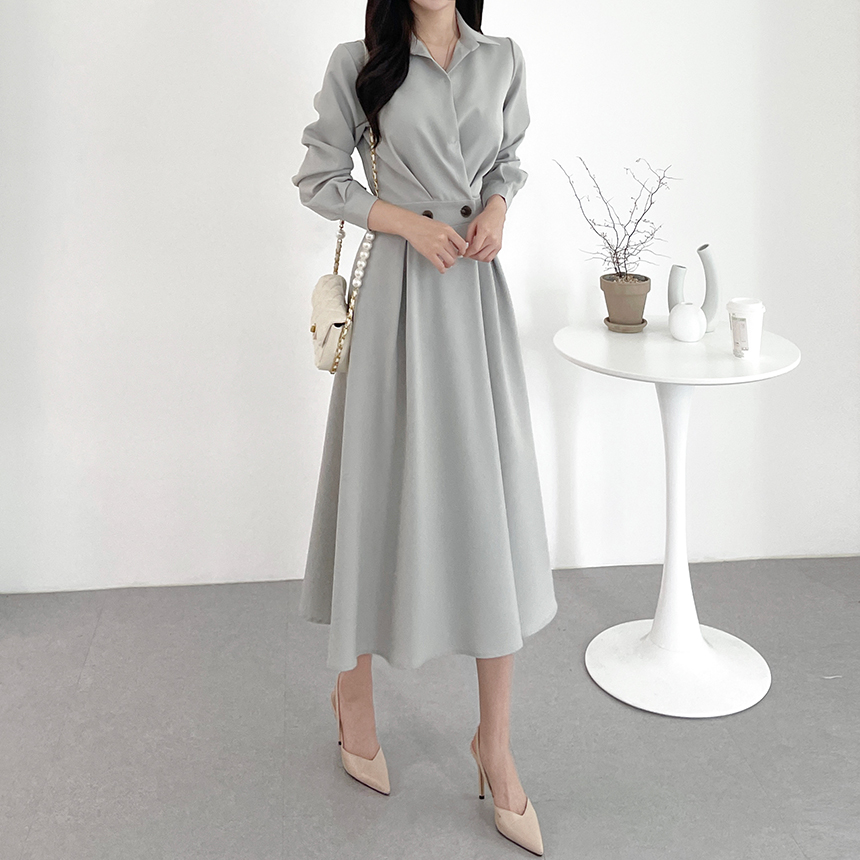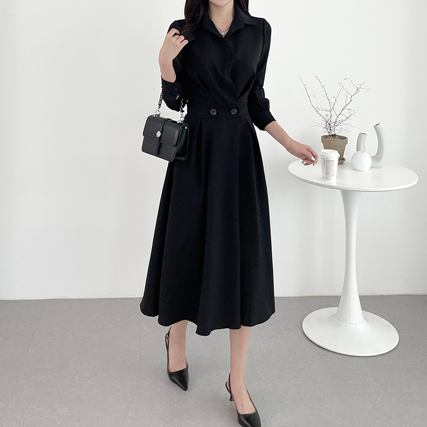 크기 업데이트 한국 chic 프랑스어 틈새 시장 디자인 허리 슬림 긴 소매 부서 버클 드레스