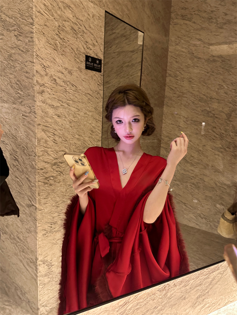 실사 프랑스식 민소매 레트로 V넥 행침 목 빨간색 점프 슈트 치마 계절 아름다운 해변가 휴가 허리 수축 한 마디 롱 스커트