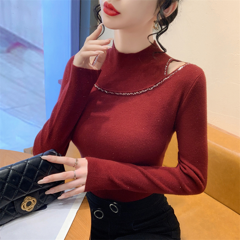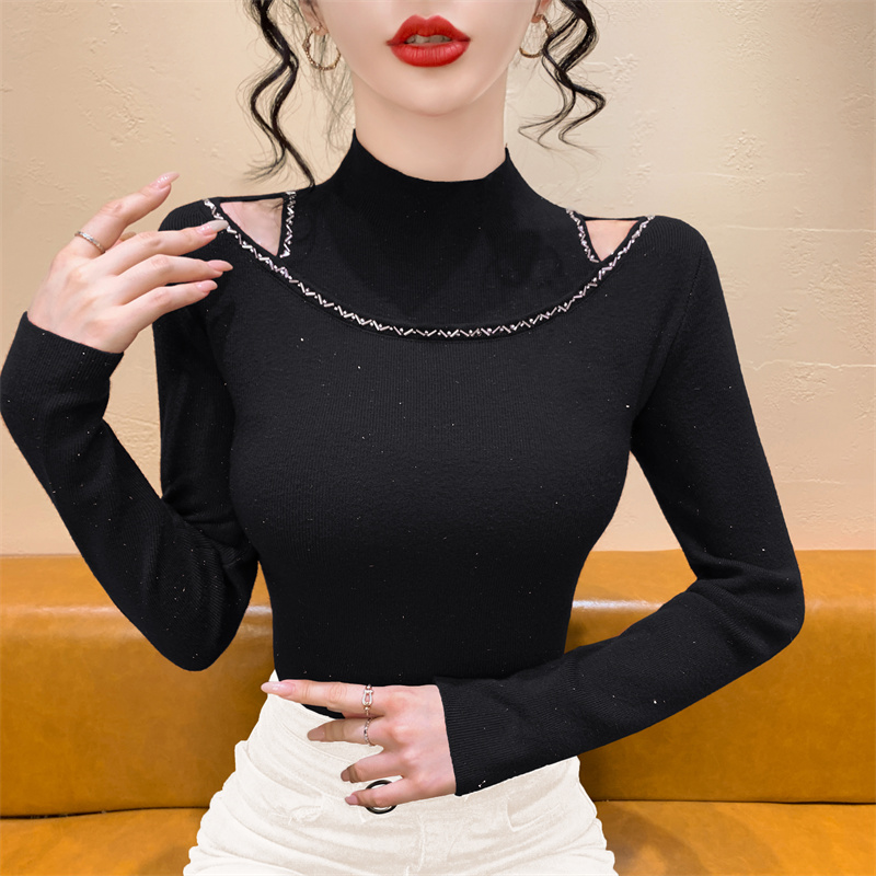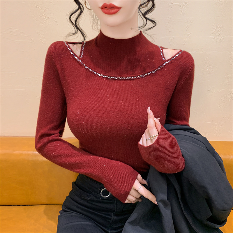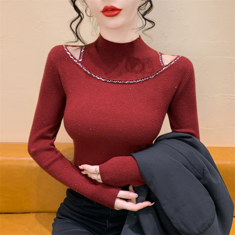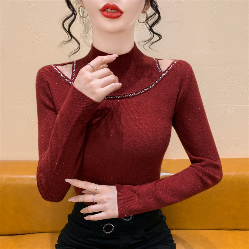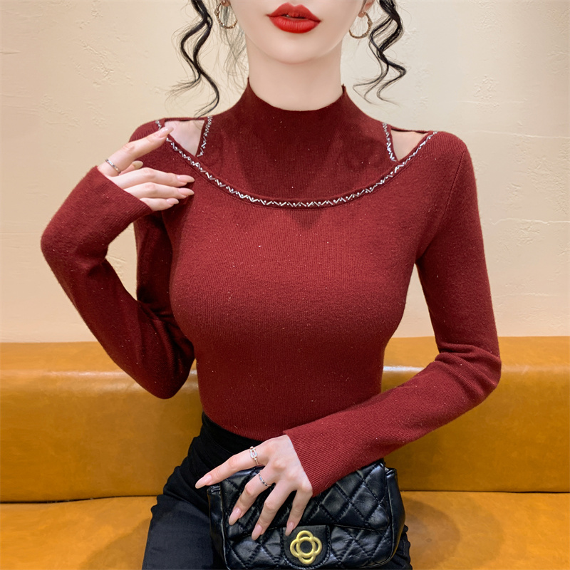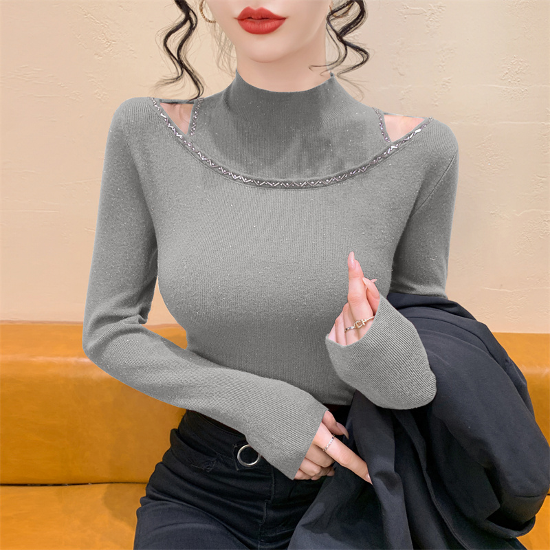 실사 가을 겨울 새로운 프랑스식 샤오시엔 인터넷 오프숄더 주문 훈련 니트 스웨터 작은 대중 슬림해 보이는 기본 셔츠 스웨터