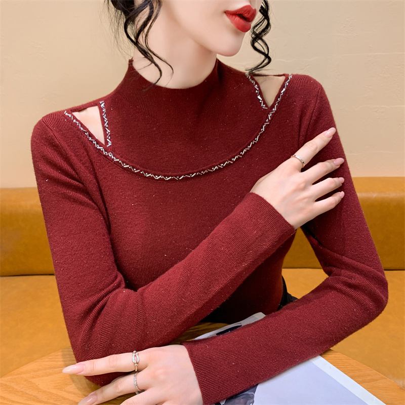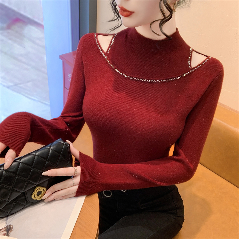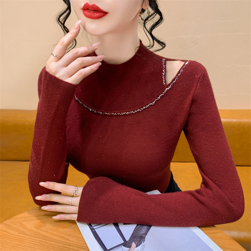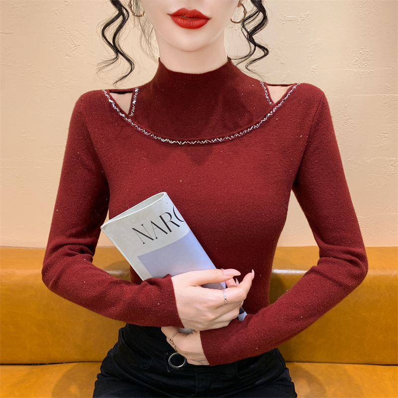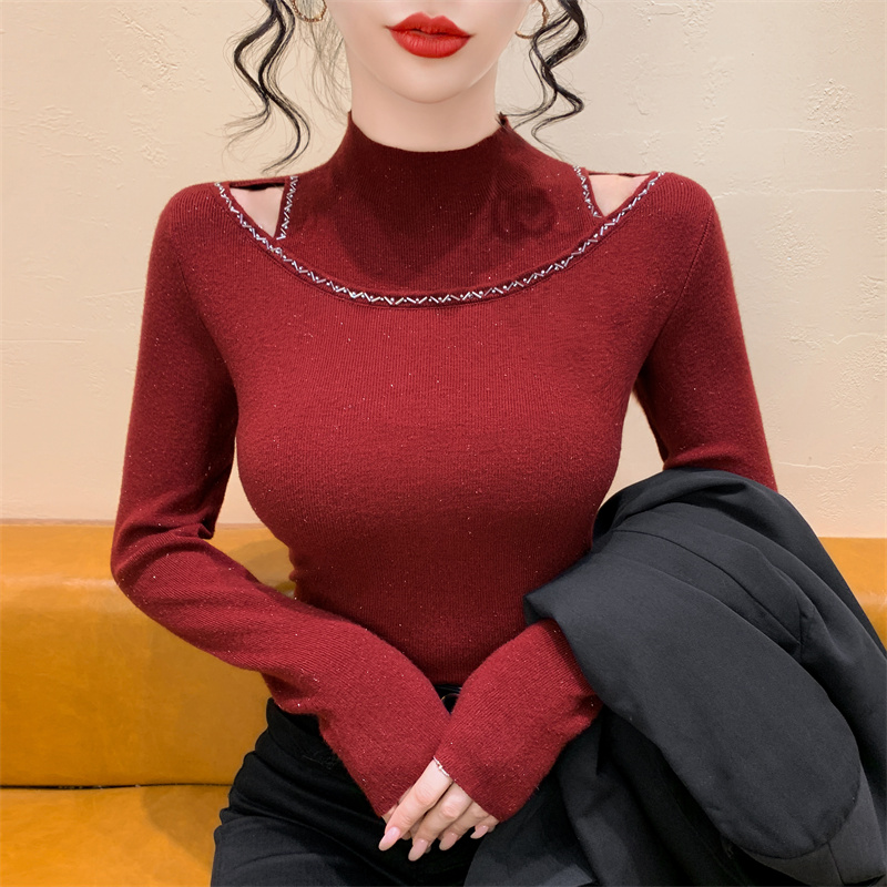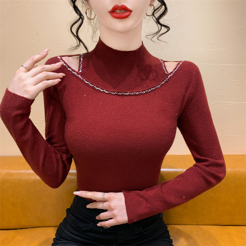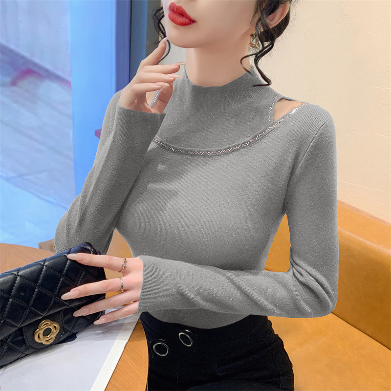 실사 가을 겨울 새로운 프랑스식 샤오시엔 인터넷 오프숄더 주문 훈련 니트 스웨터 작은 대중 슬림해 보이는 기본 셔츠 스웨터
