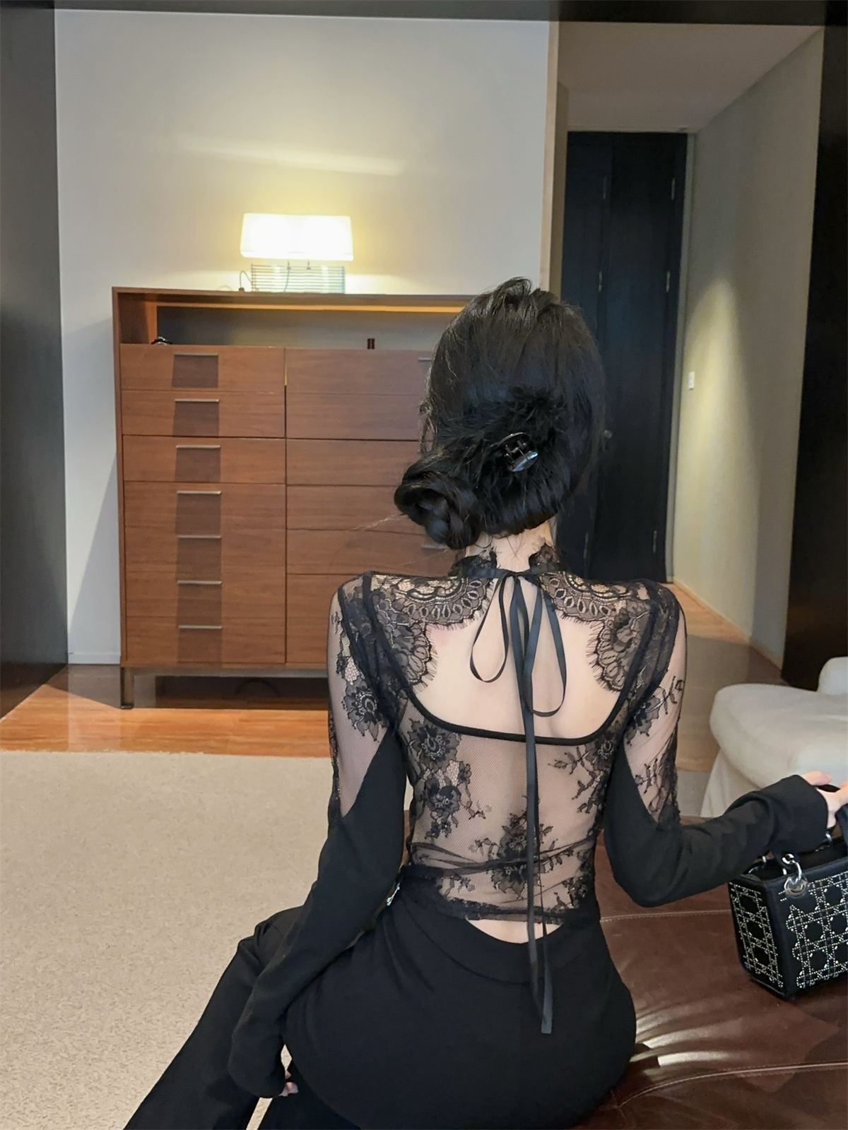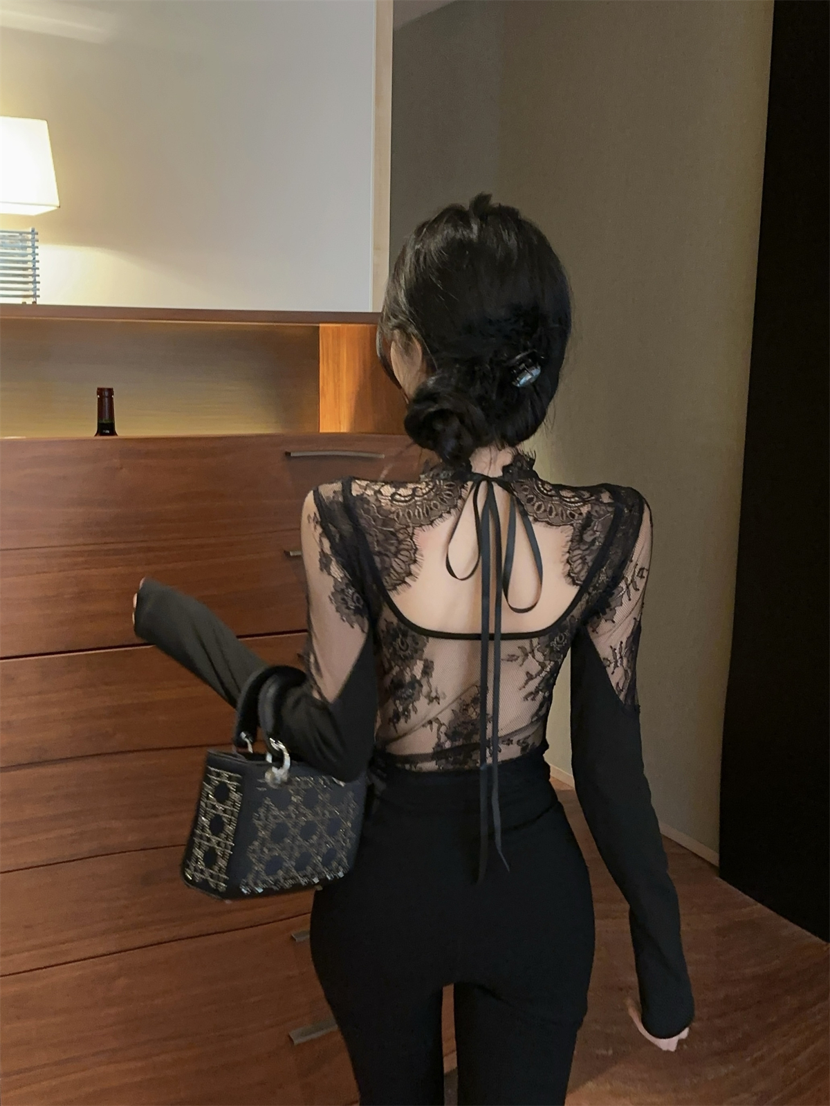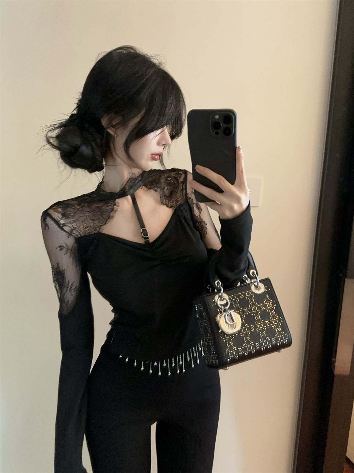 실제 촬영 정가 순수한 욕망 레이스 셔츠 빈 다시 열기 긴 소매 맨위 여자 봄 레이스 디자인 뜨거운 소녀 t