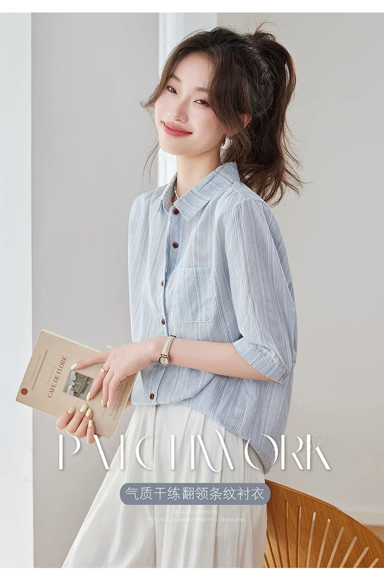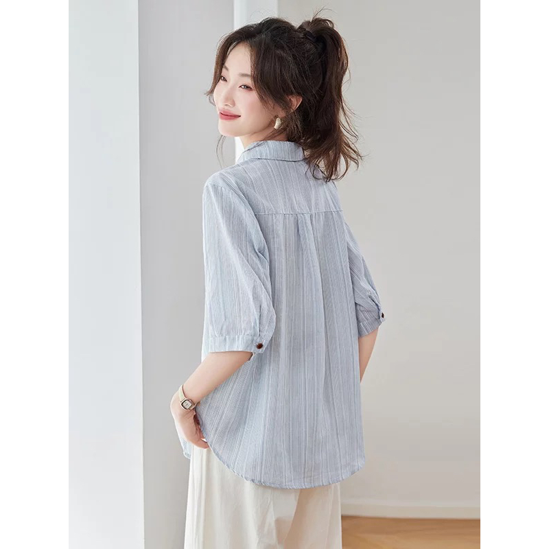 순면 스트라이프 반팔 셔츠 여성 2026 새로운 여름 루즈핏 표지 고기 셔츠 중간 소매 맨위 작은 셔츠