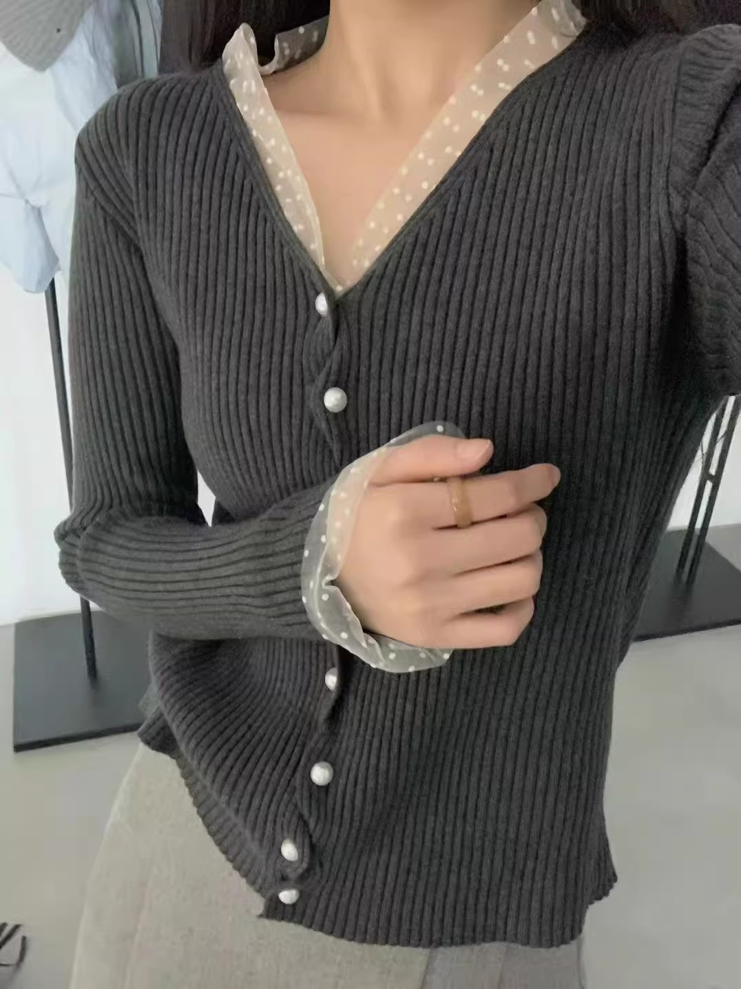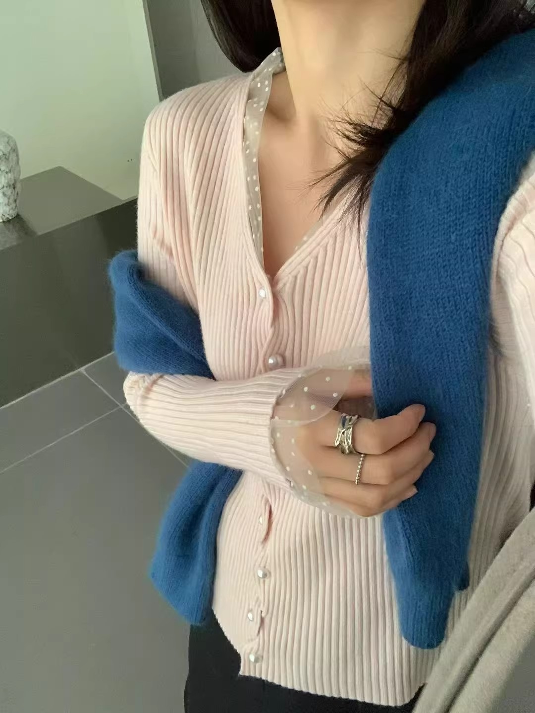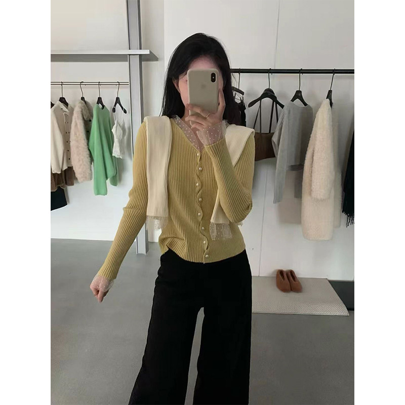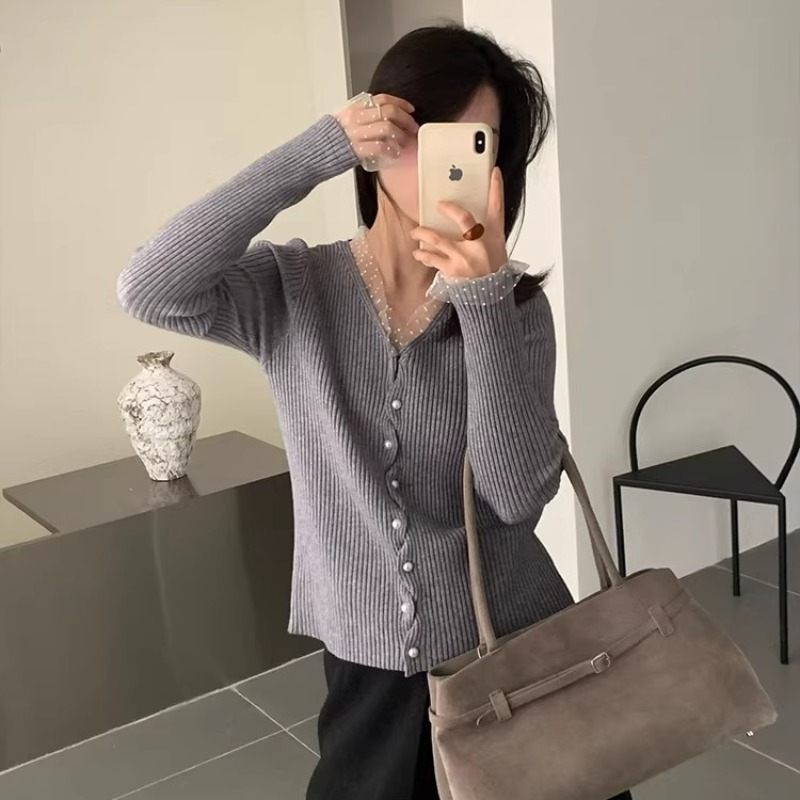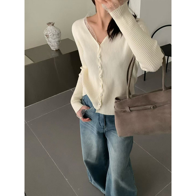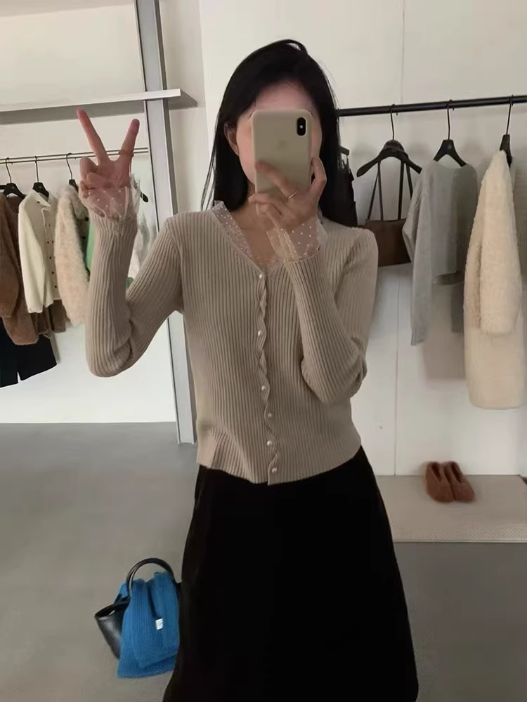 한 부서 고유 한 아름다운 핑크색 진주 버클 니트 오픈 가디건 여성 코트 이른 봄 부드러운 다용도 쇼트 스타일 긴팔 맨위