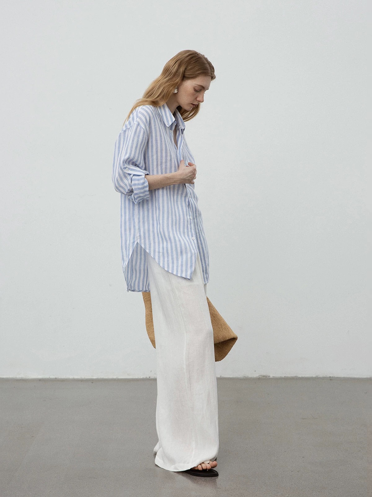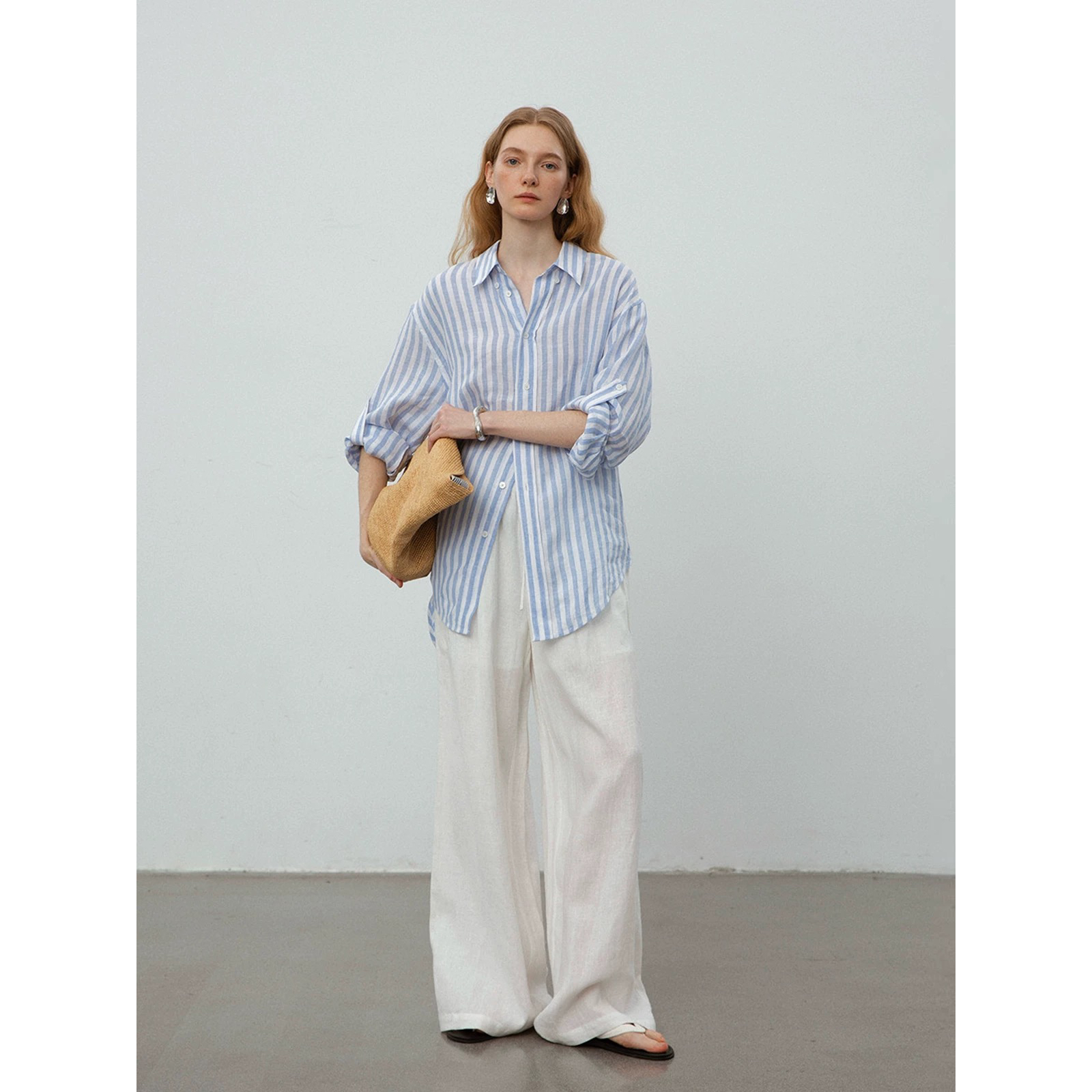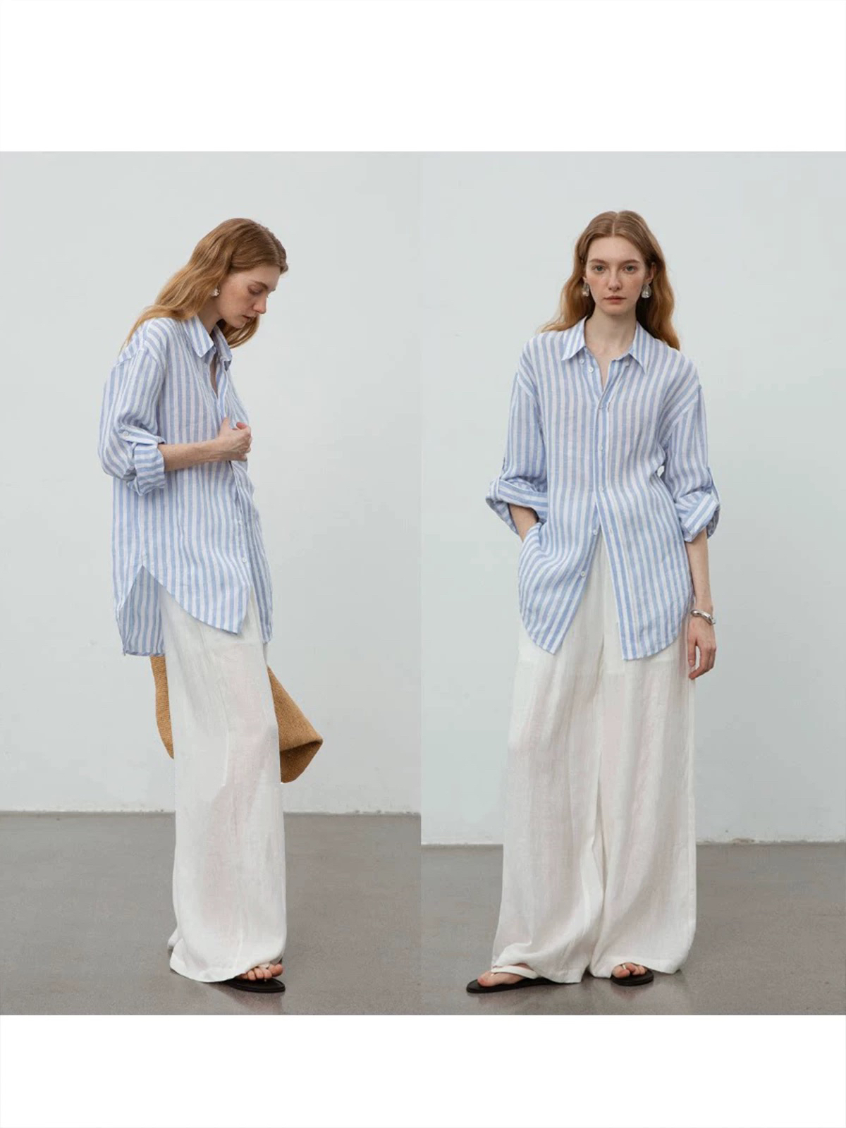 블루 화이트 스트라이프 얇은 스타일 POLO 칼라 자외선 차단 여성 셔츠 봄 여름 휴가 바람 착용 가져 가라. 긴팔 아마 셔츠 재킷