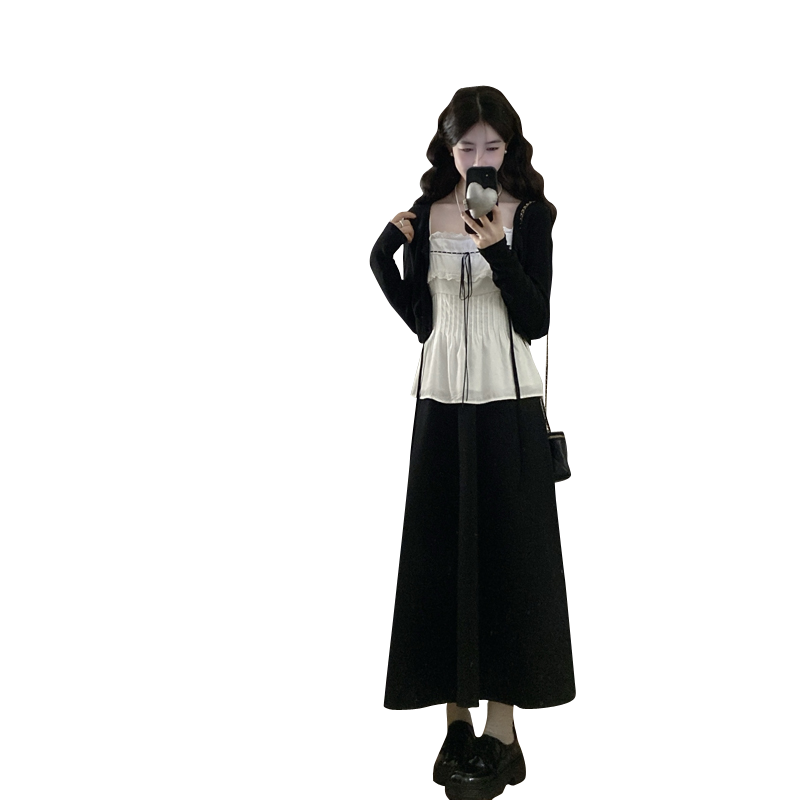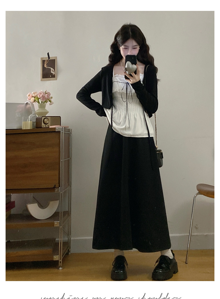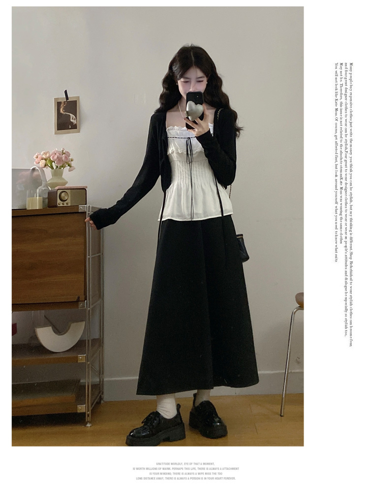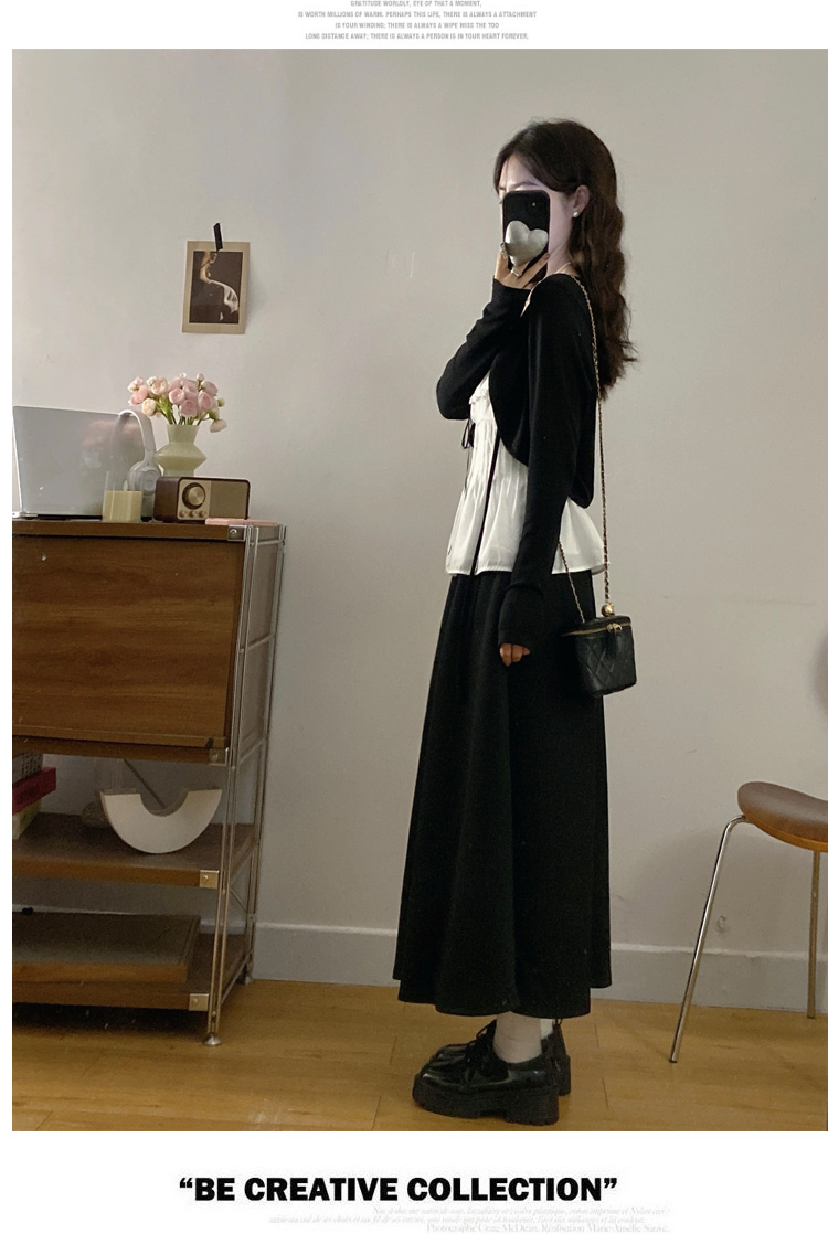 실사 빅 사이즈 여성 의류 슬림해 보이는 3종 세트 디자인 센스 품격 슬립 맨위 오픈 가디건 투피스 세트 반신 스커트