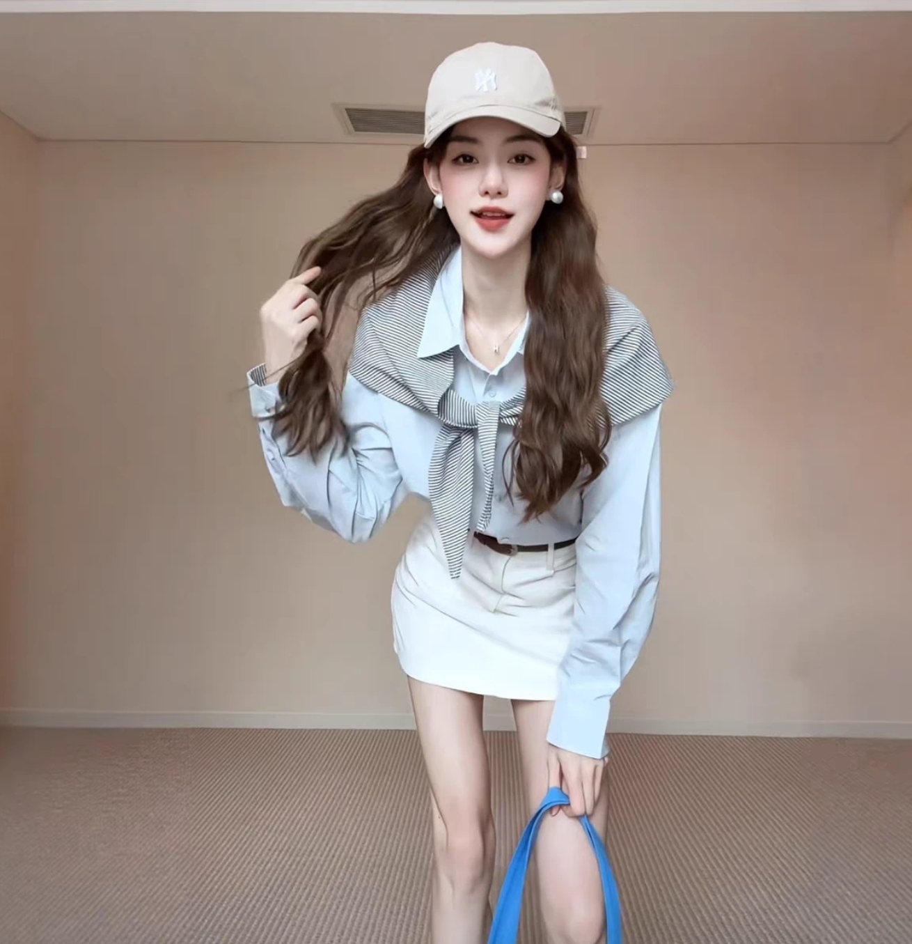 2026 새로운 봄 긴팔 셔츠 숄 품격 루즈핏 캐주얼 맨위 패션 하이웨이스트 반신 치마 세트 여성