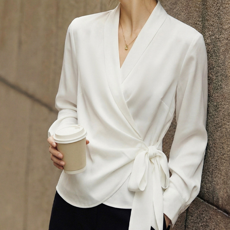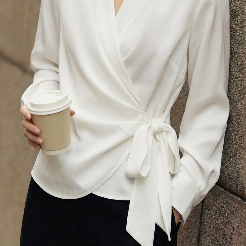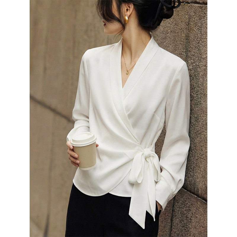 품격 빛 럭셔리 리본 카키 색 여성 셔츠 봄 2026 년 새로운 아름다운 다용도 작은 셔츠 슈퍼 잘 생긴 셔츠