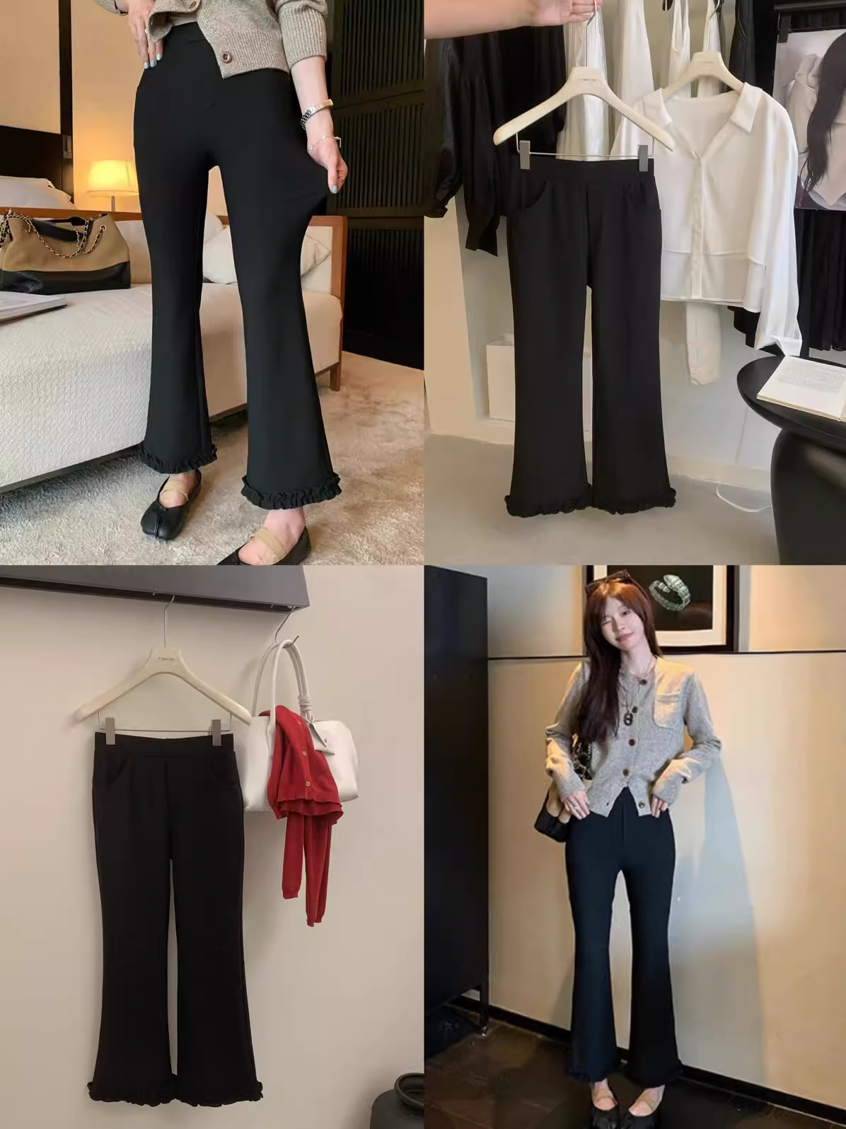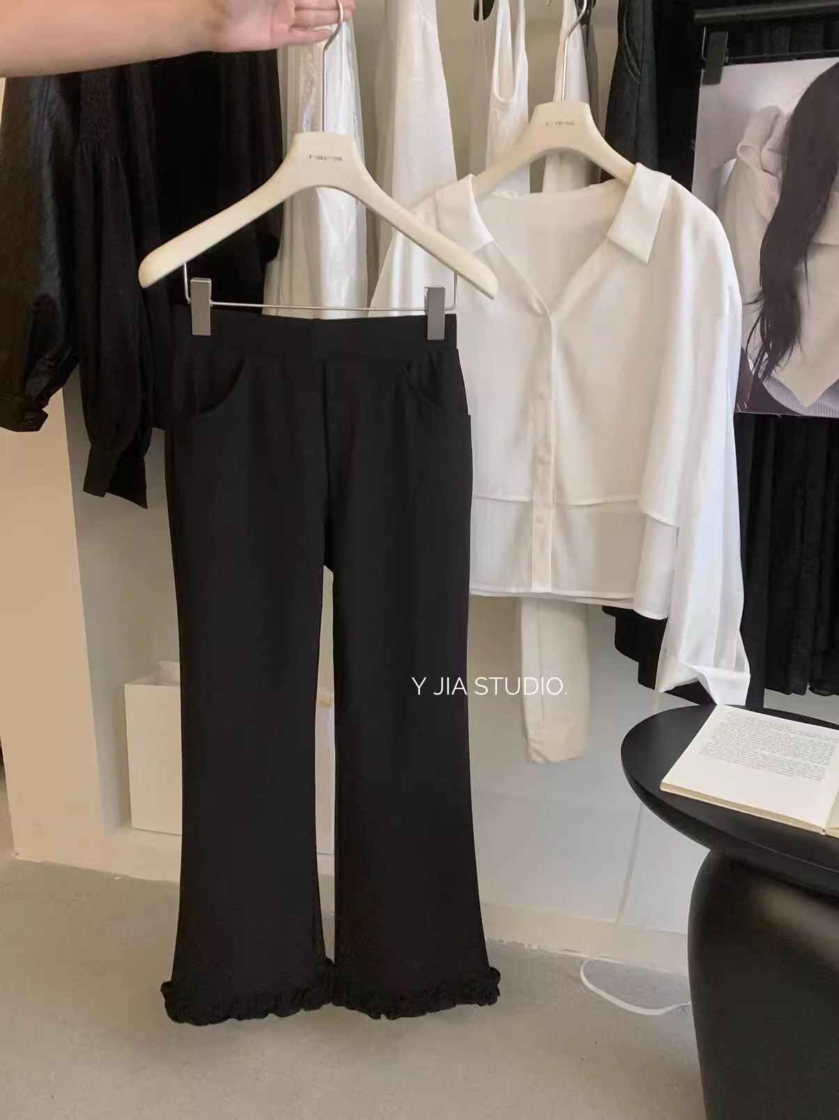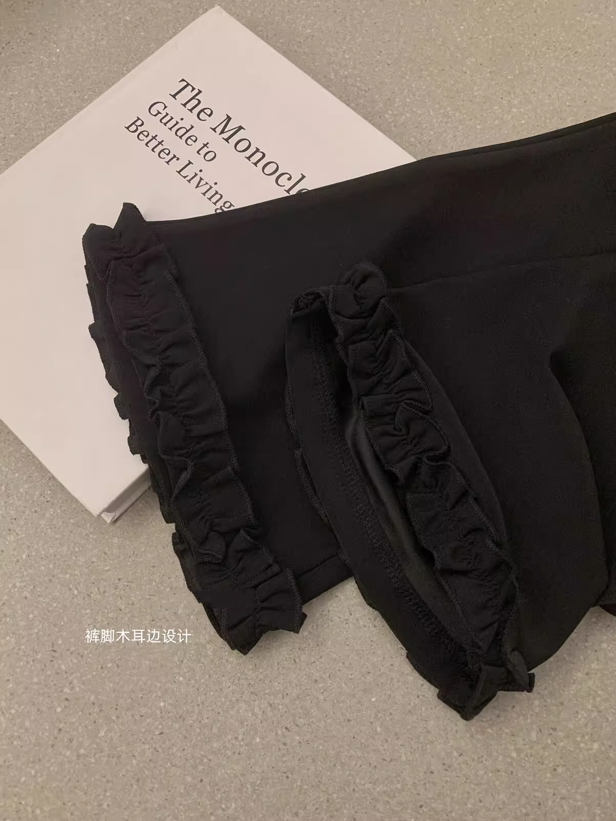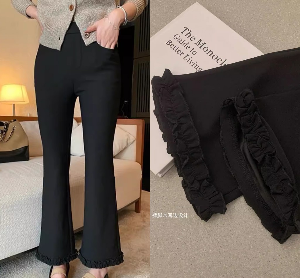 이른 봄 2026 하이웨이스트 슬림해 보이는 검정색 캐주얼 바지 작은 키 프릴 슬림해 보이는 9 포인트 부츠컷 바지