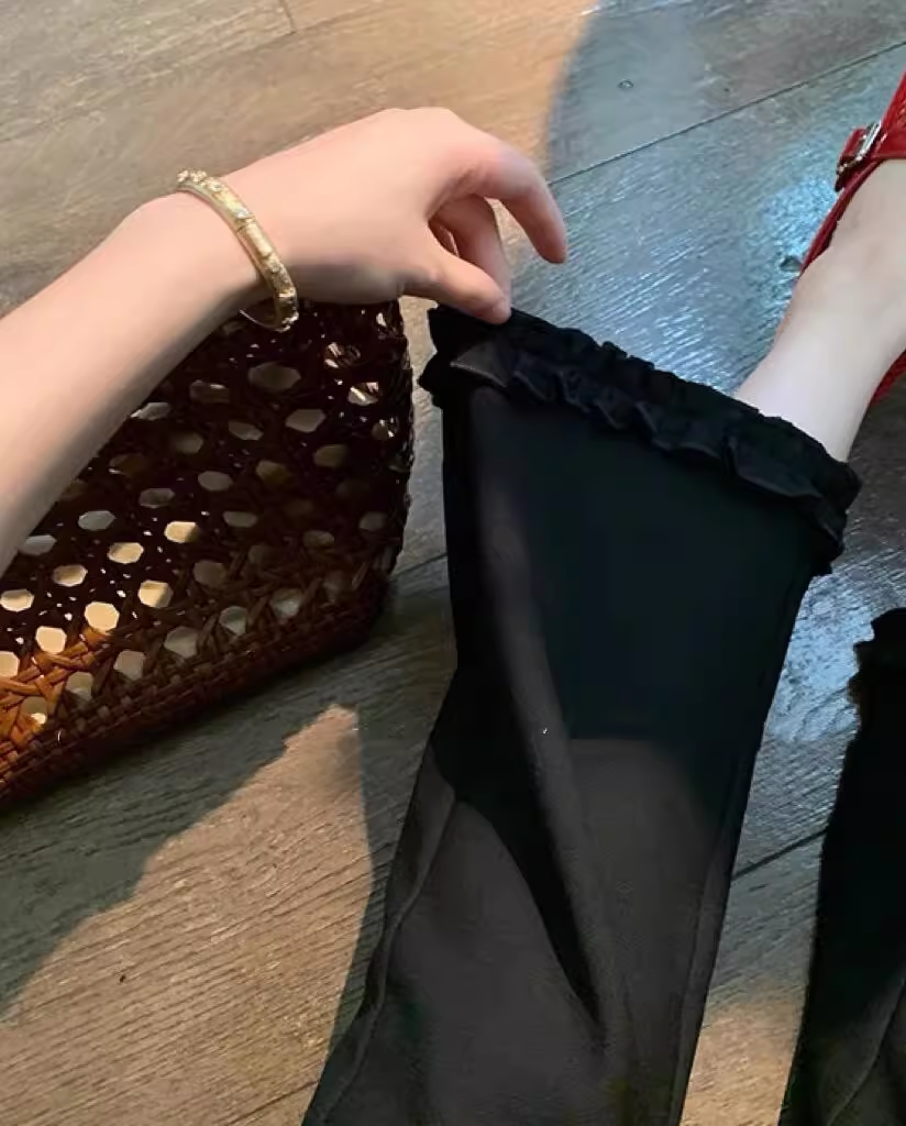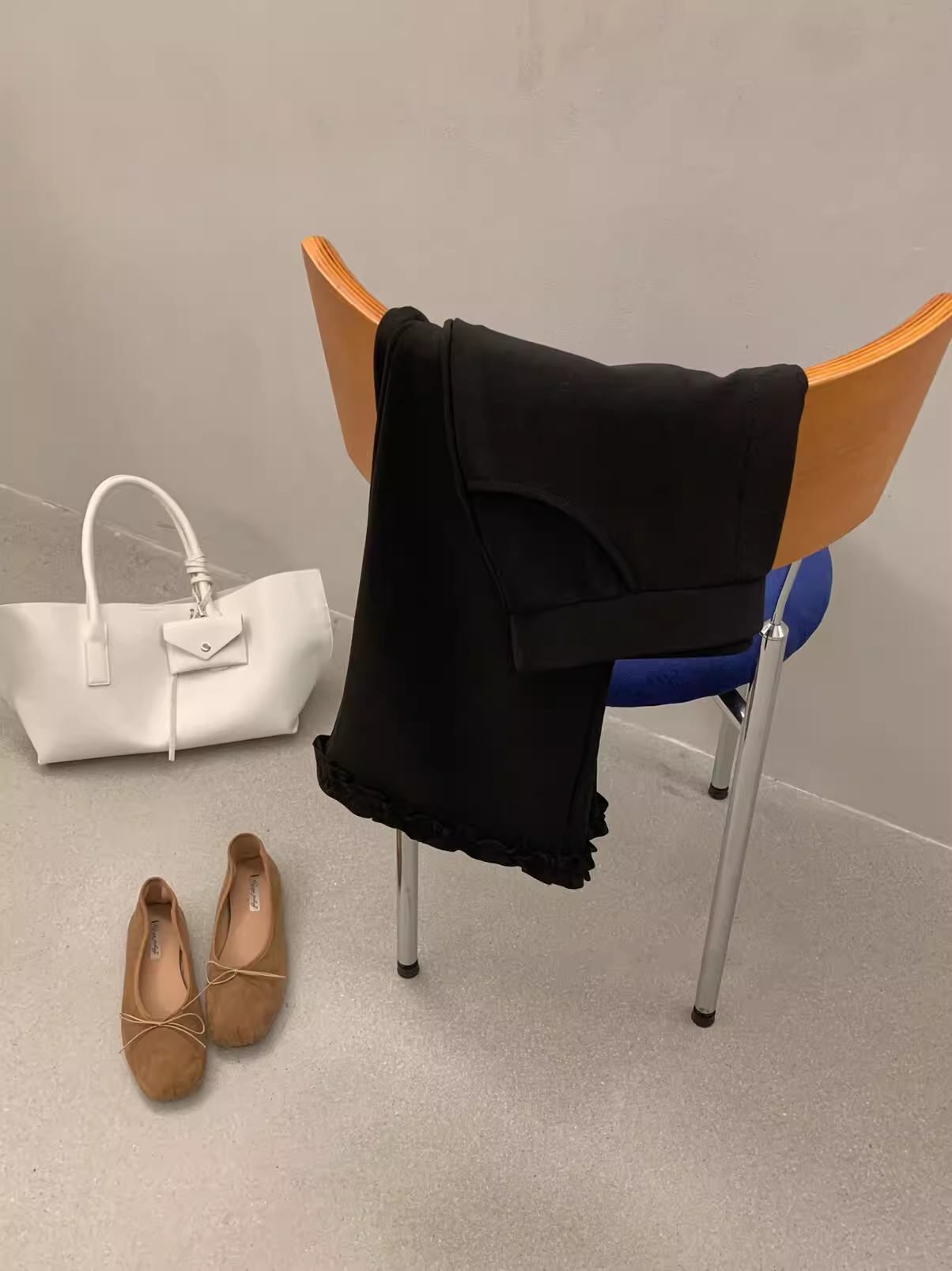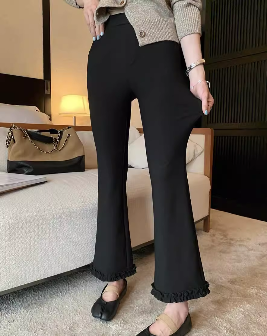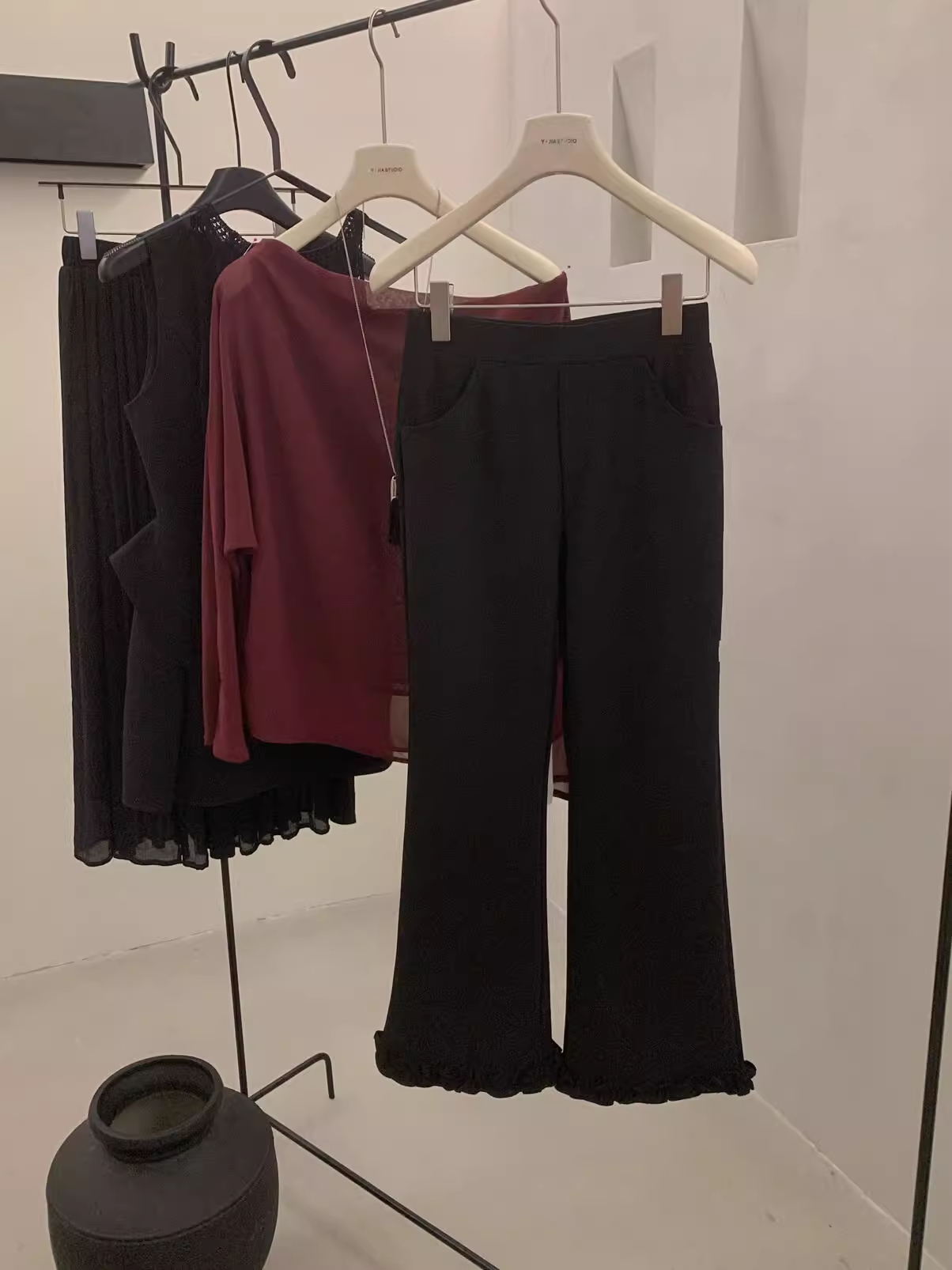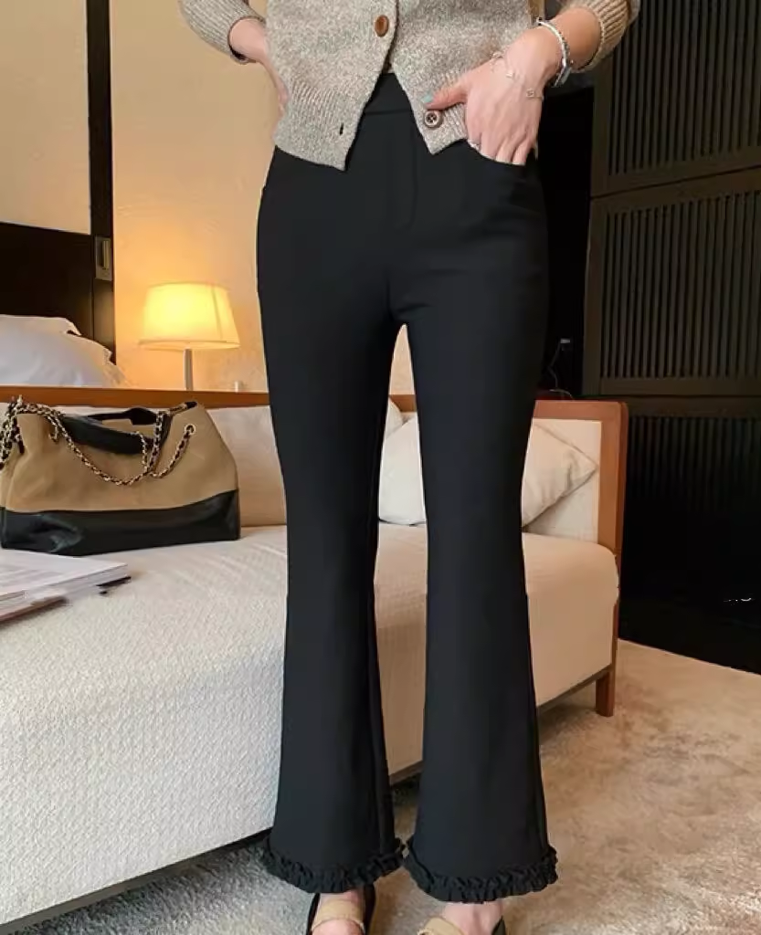이른 봄 2026 하이웨이스트 슬림해 보이는 검정색 캐주얼 바지 작은 키 프릴 슬림해 보이는 9 포인트 부츠컷 바지