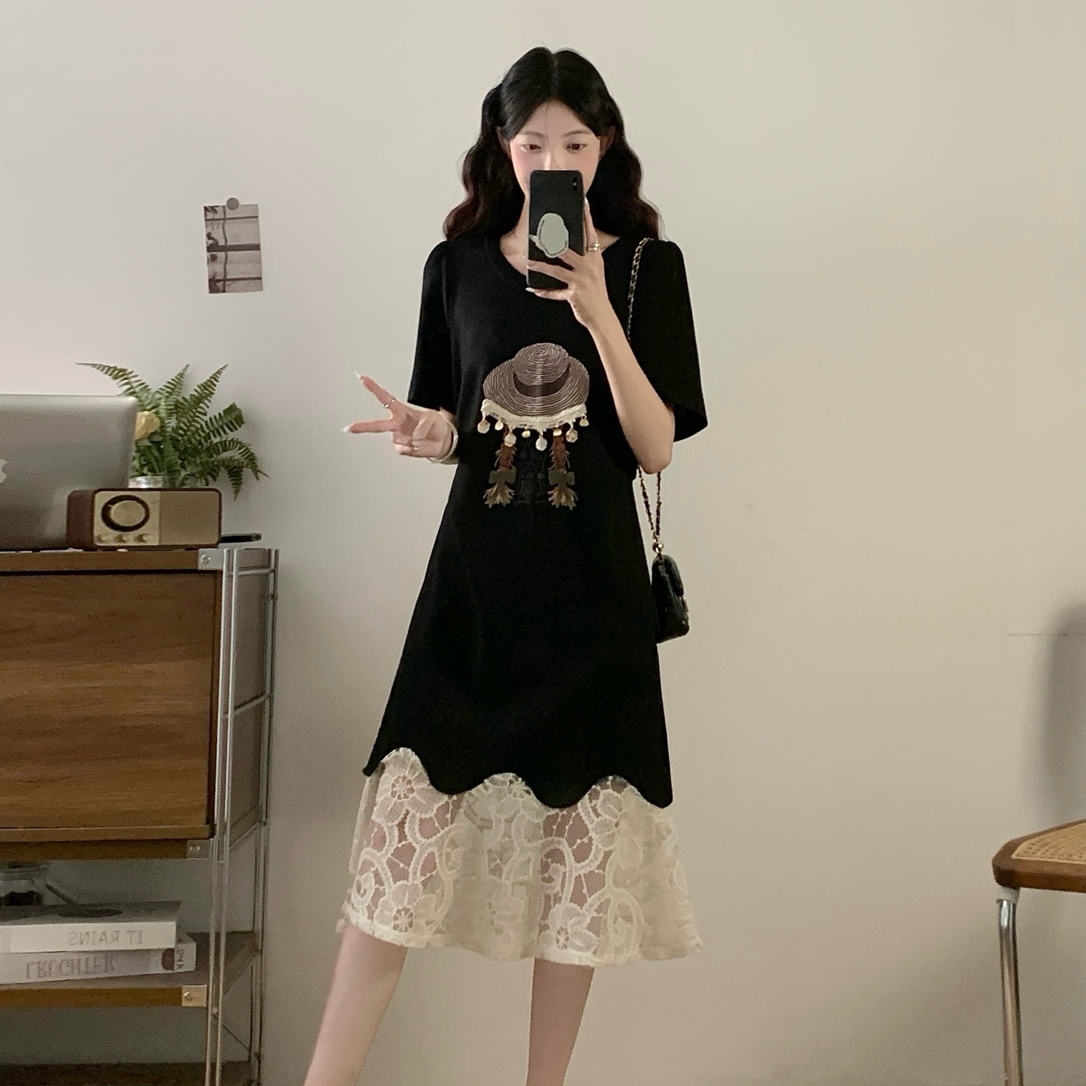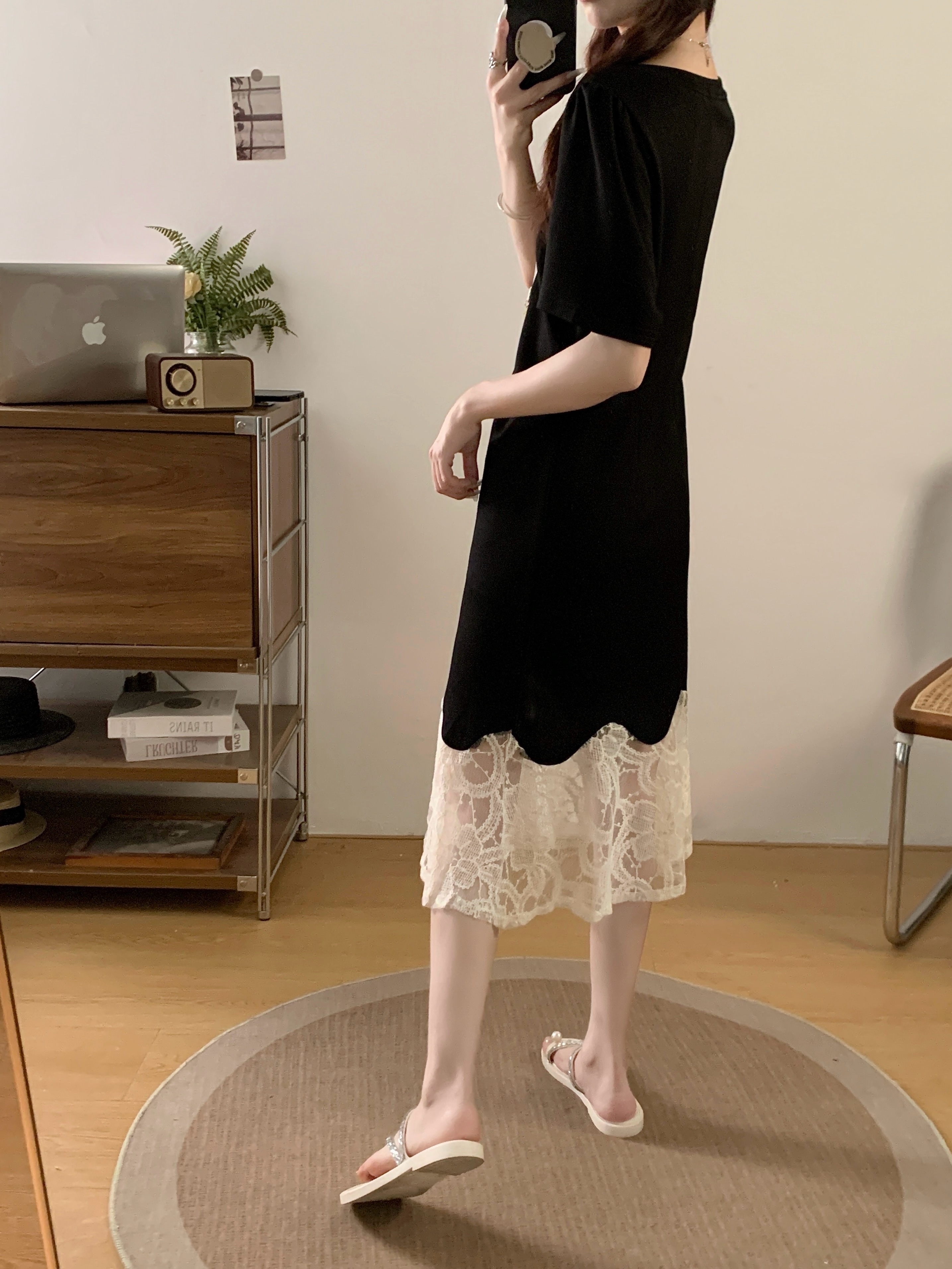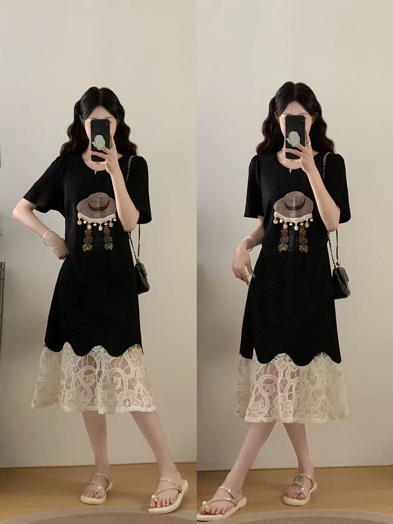 실사 빅 사이즈 여성 의류 2026 여름 프랑스식 패션 캐주얼 레이스 조각 페이크 레이어드 슬림해 보이는 반팔 드레스
