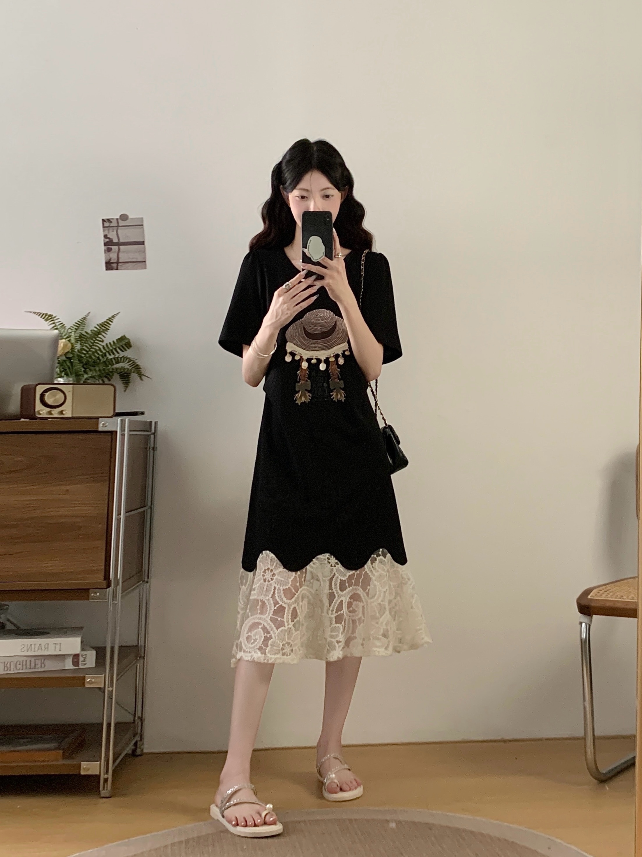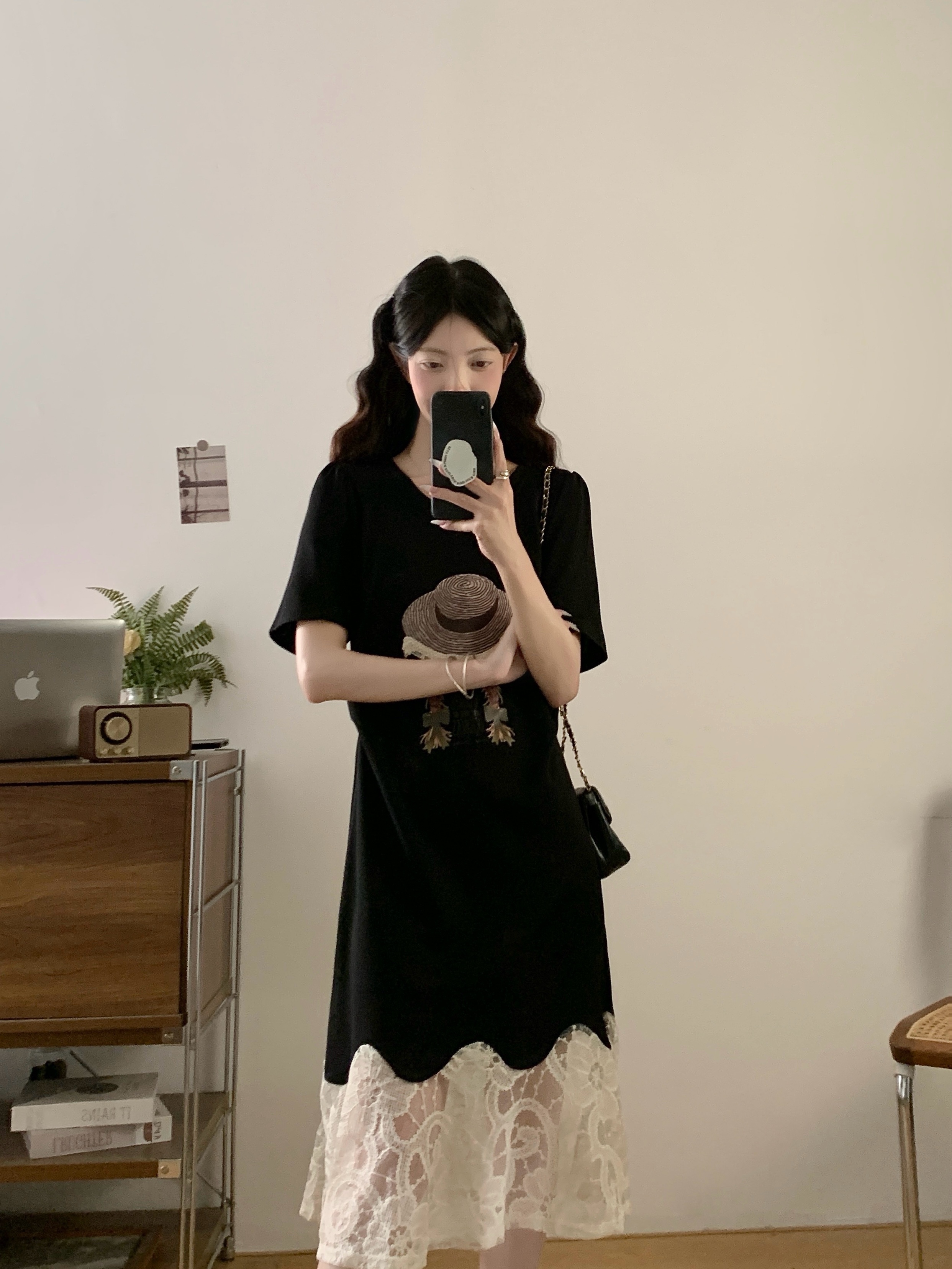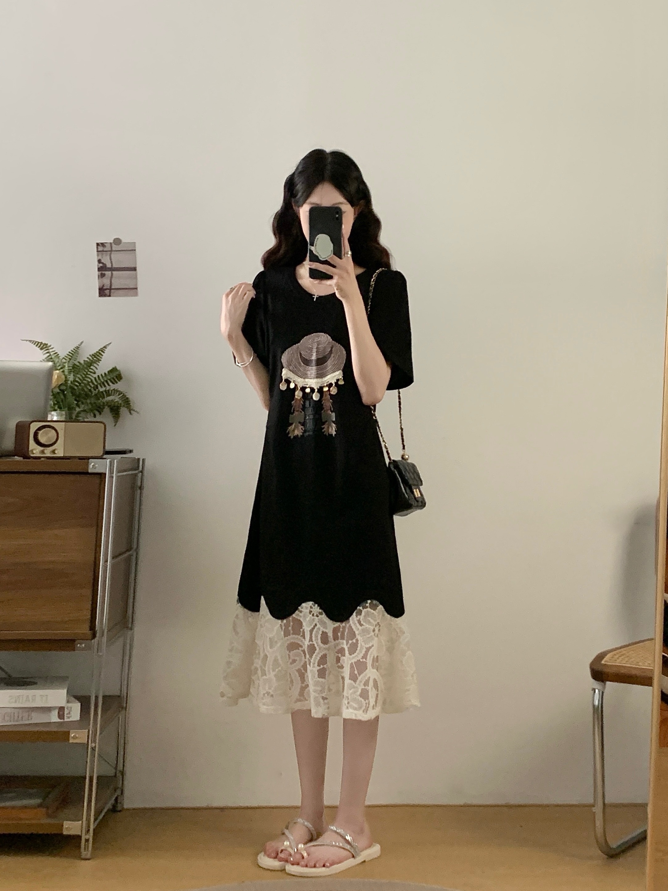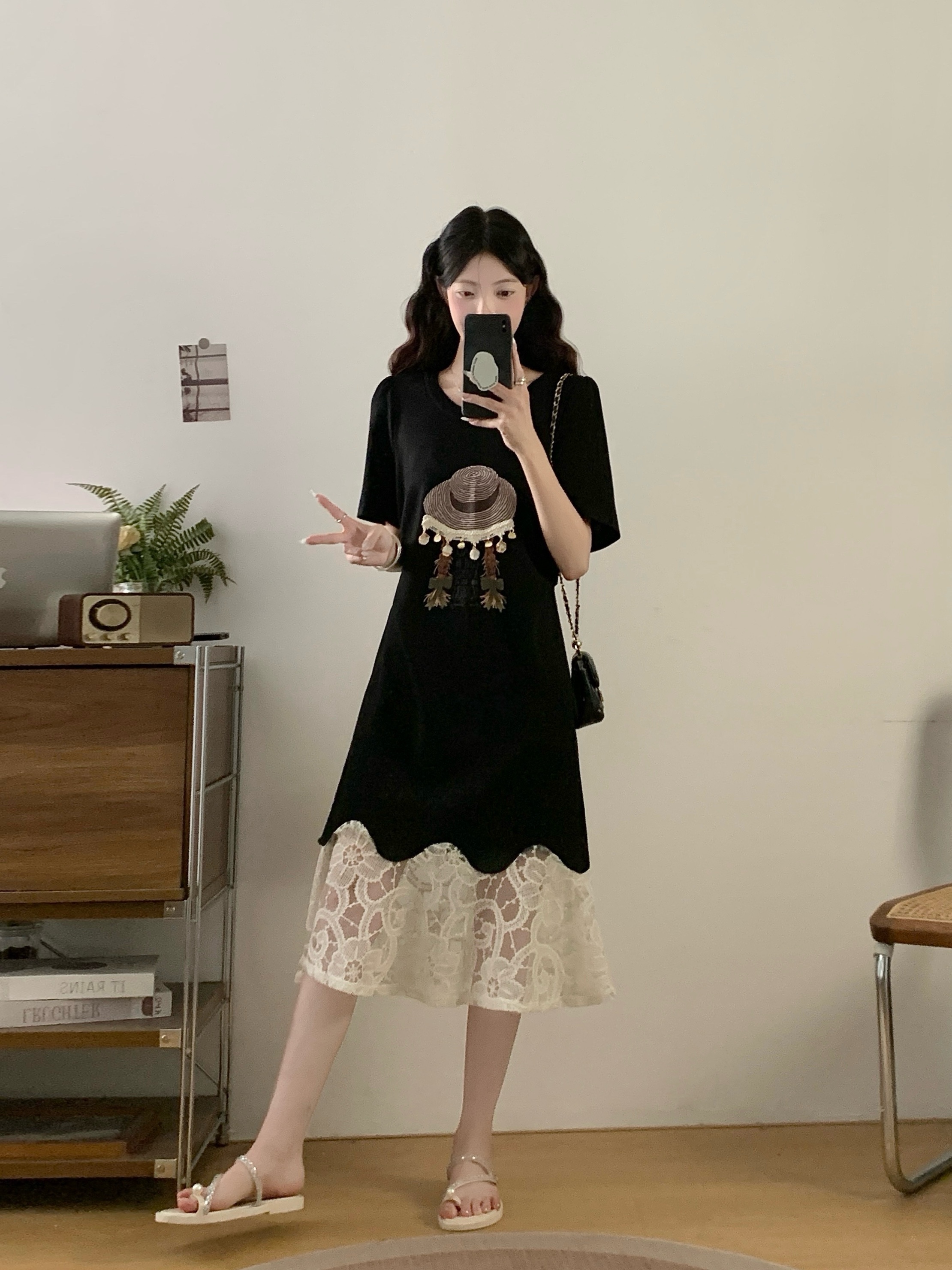 실사 빅 사이즈 여성 의류 2026 여름 프랑스식 패션 캐주얼 레이스 조각 페이크 레이어드 슬림해 보이는 반팔 드레스