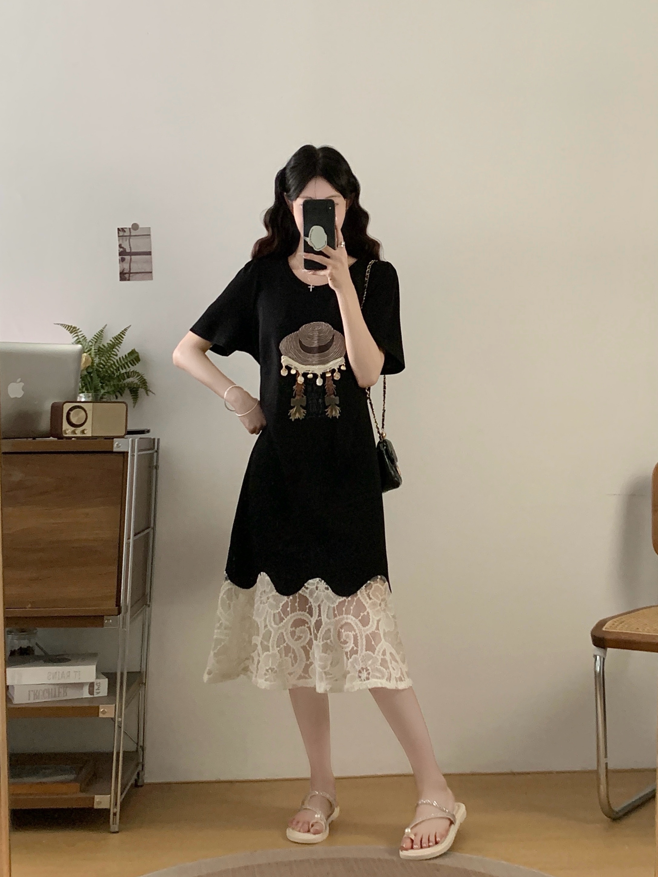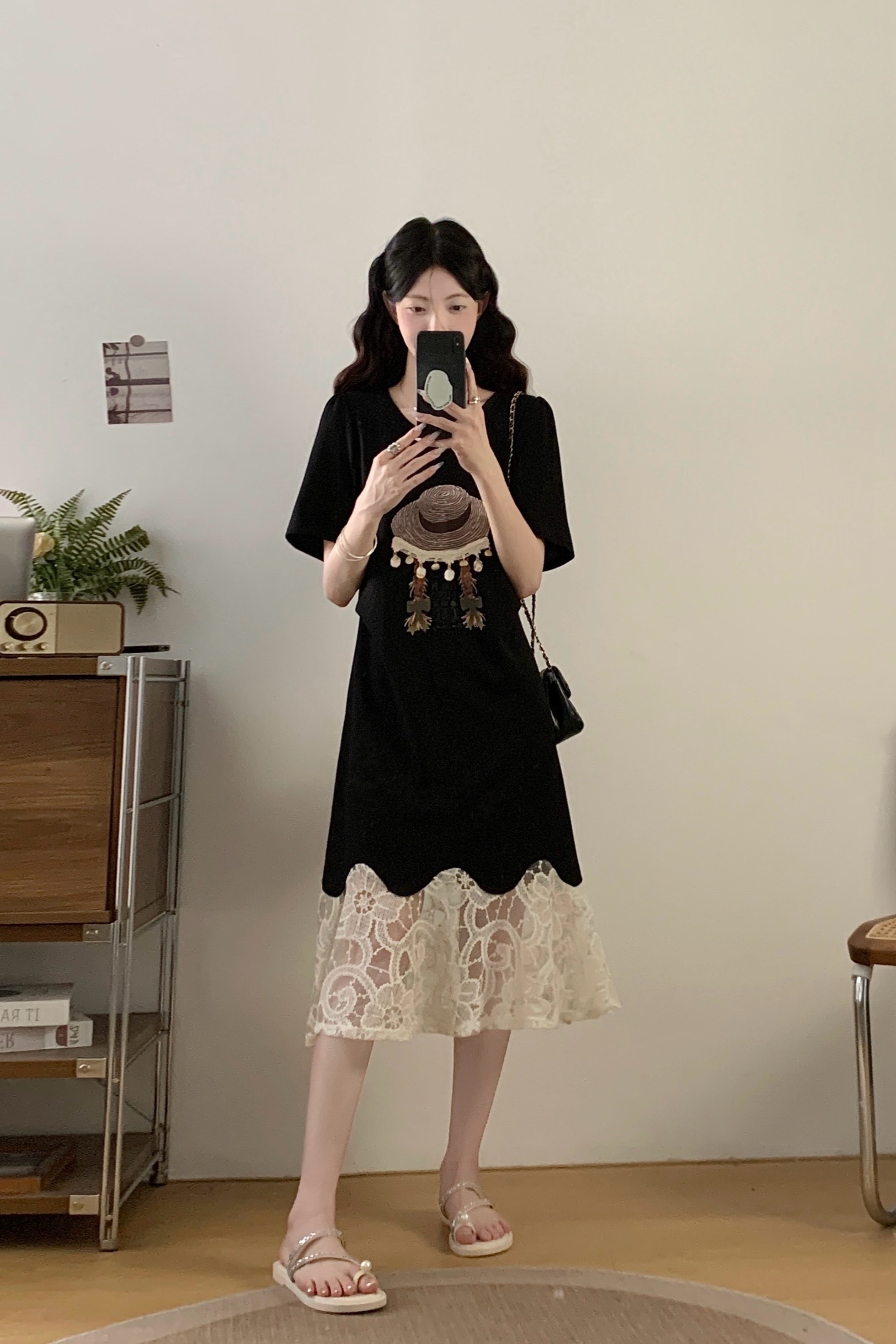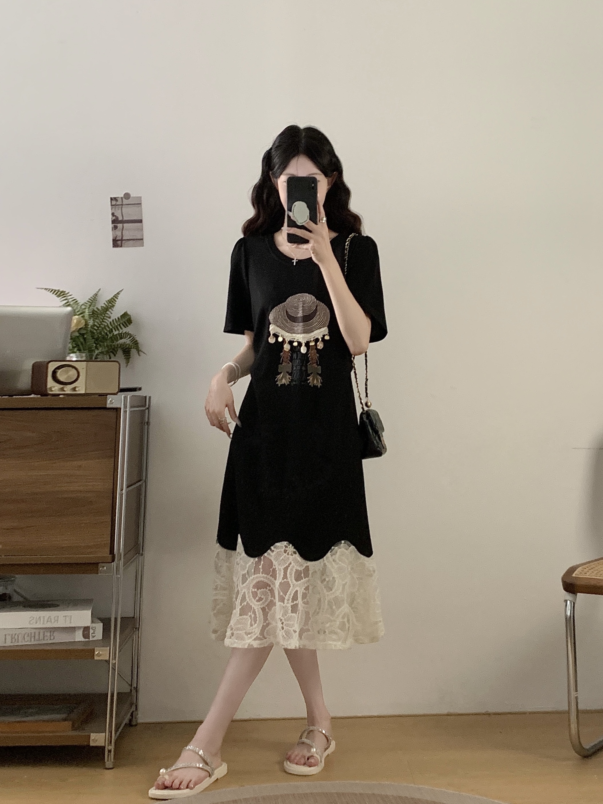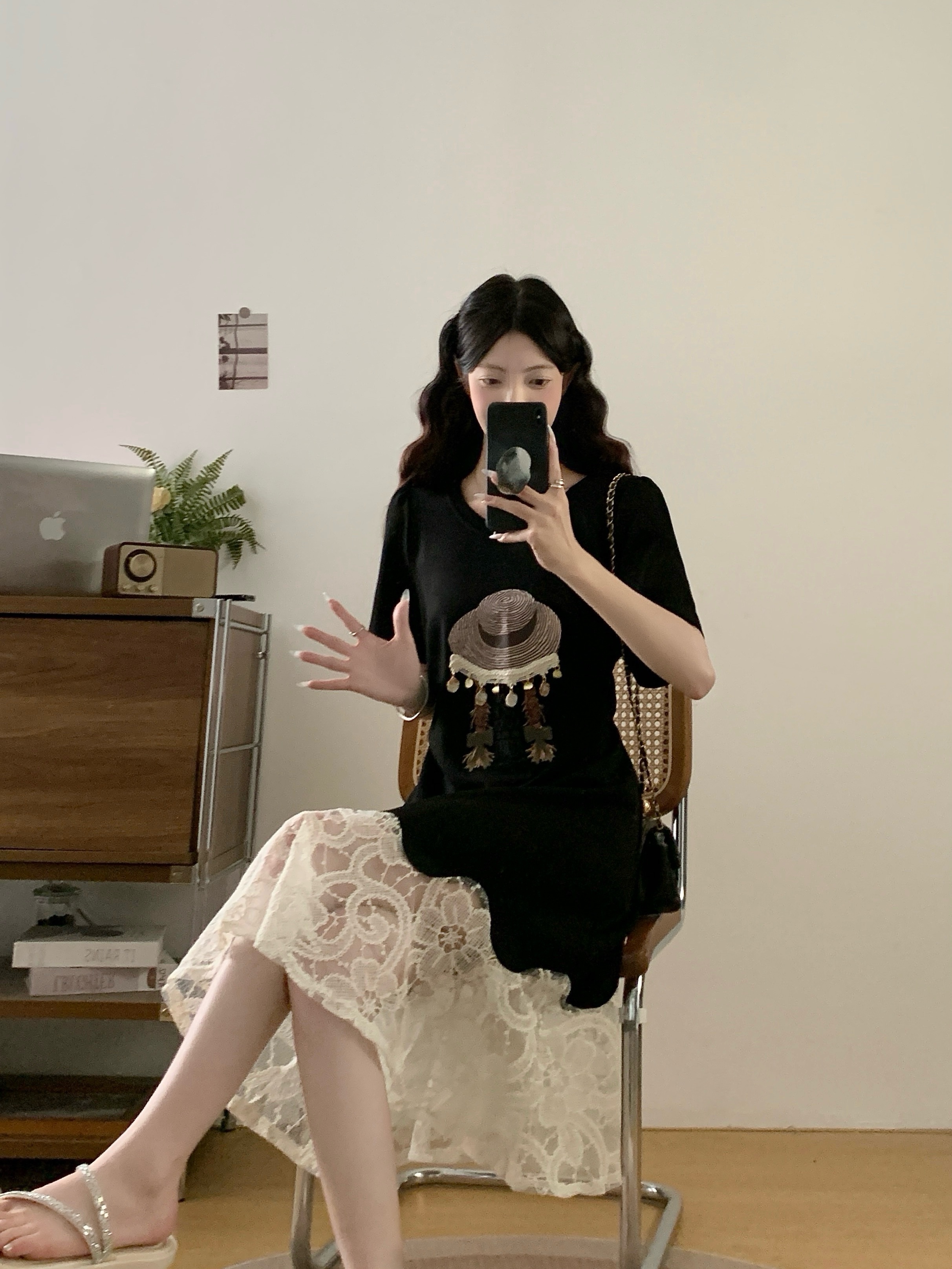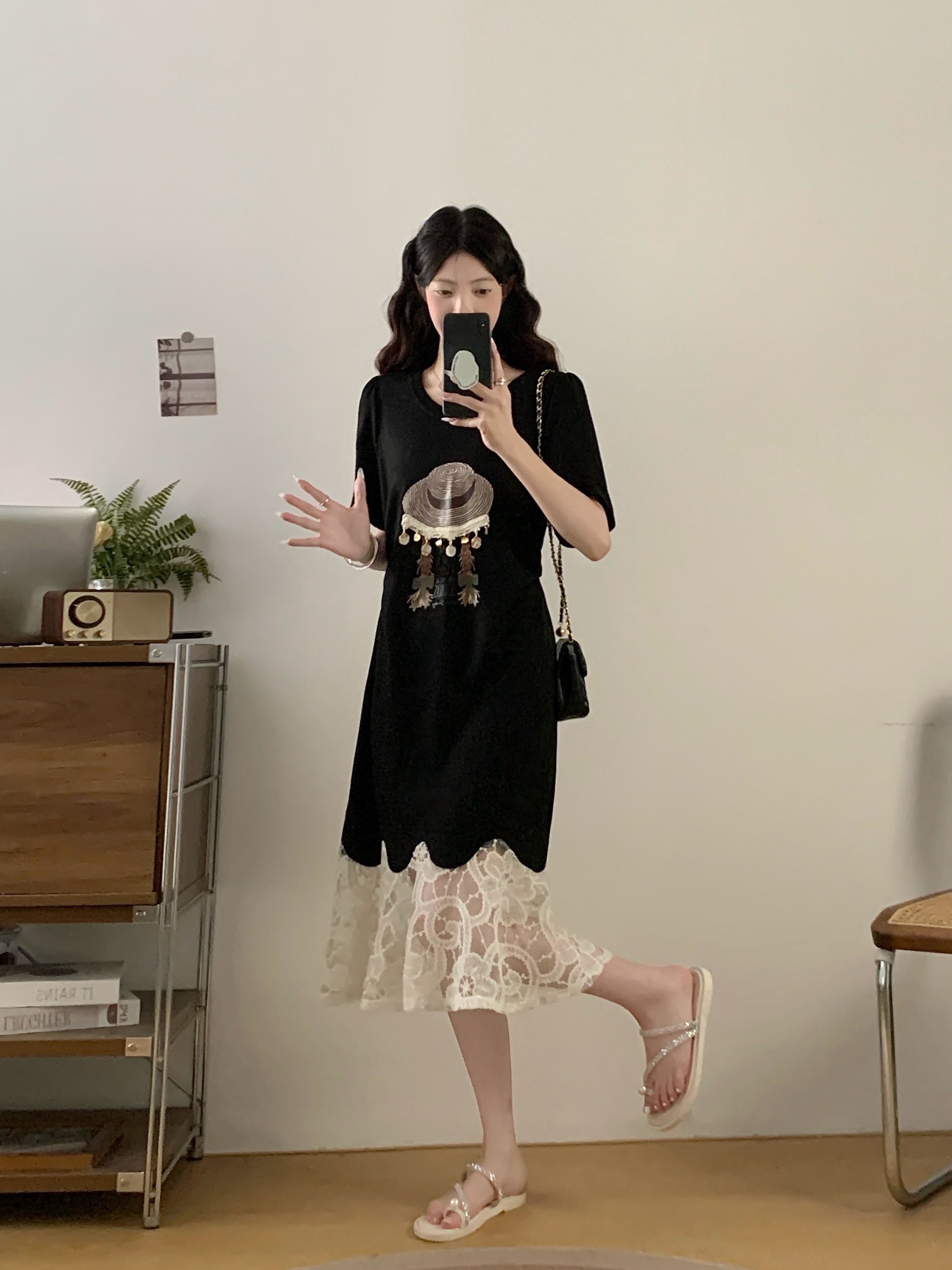 실사 빅 사이즈 여성 의류 지방 mm 봄 여름 디자인 센스 패치워크 레이스 불규칙 루즈핏 티셔츠 맨위 기본 셔츠