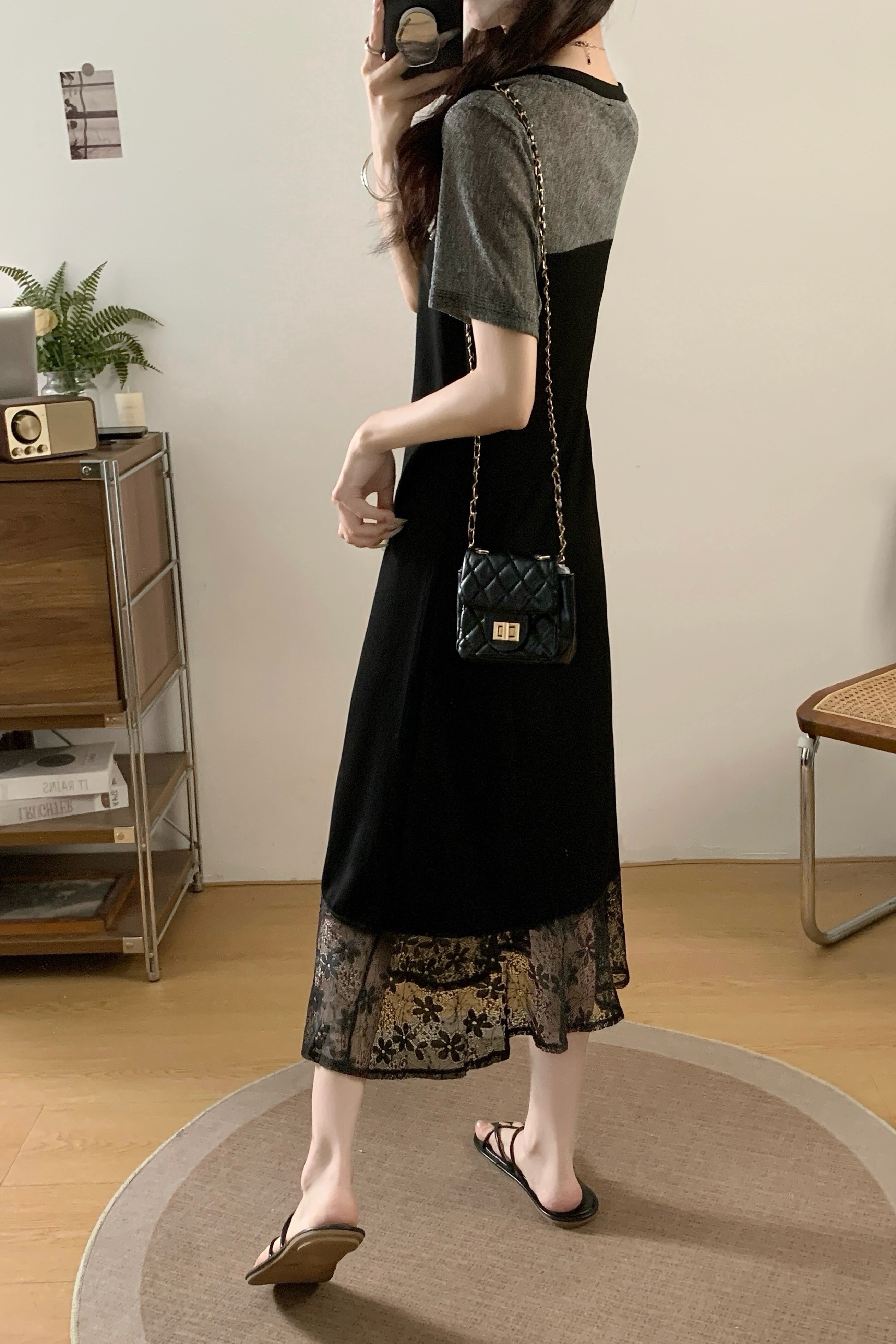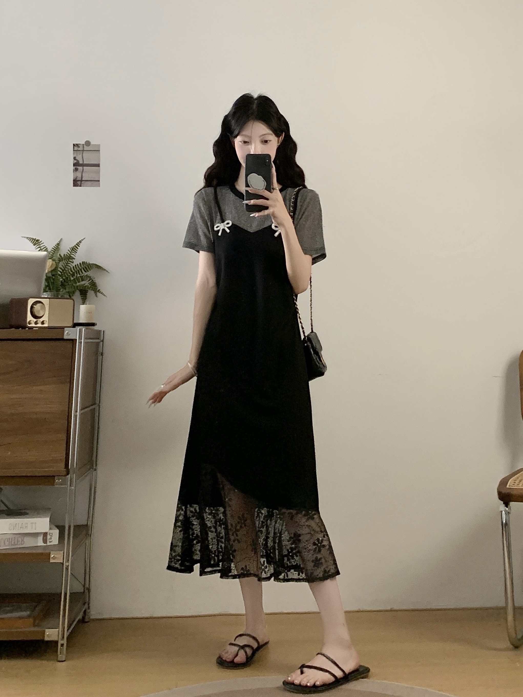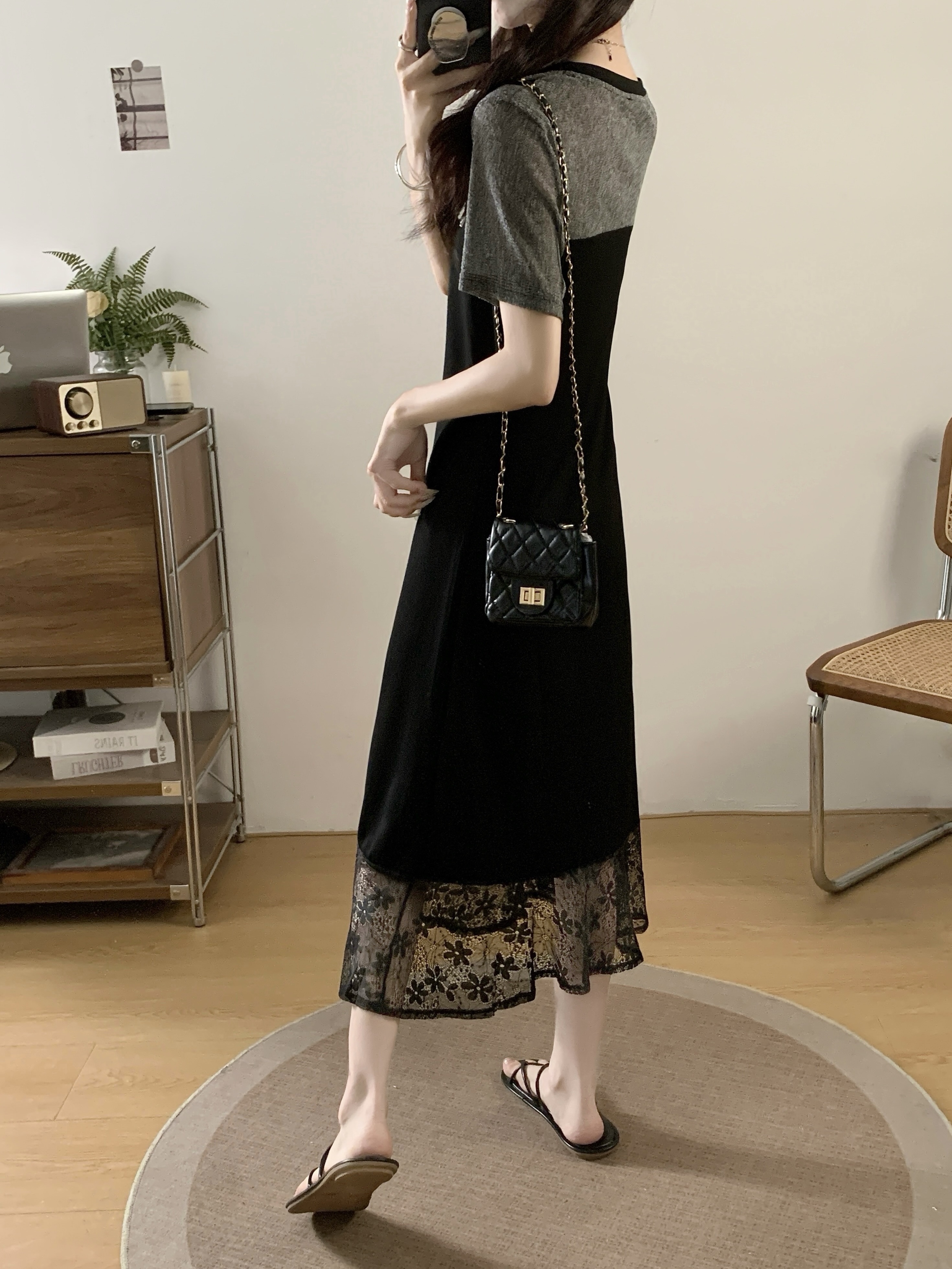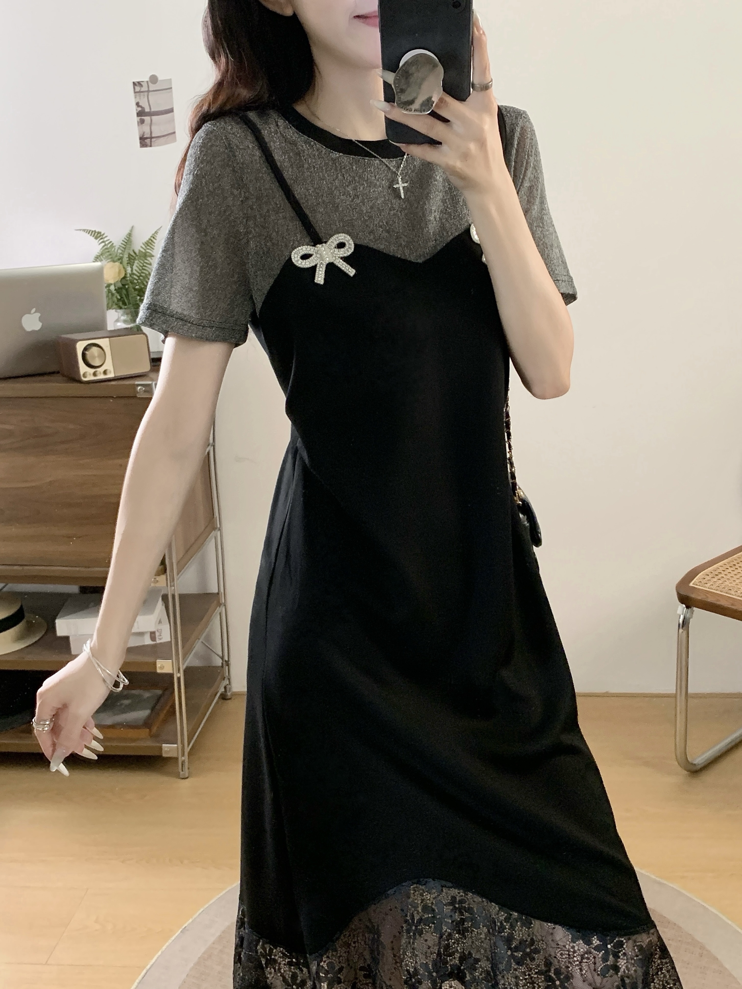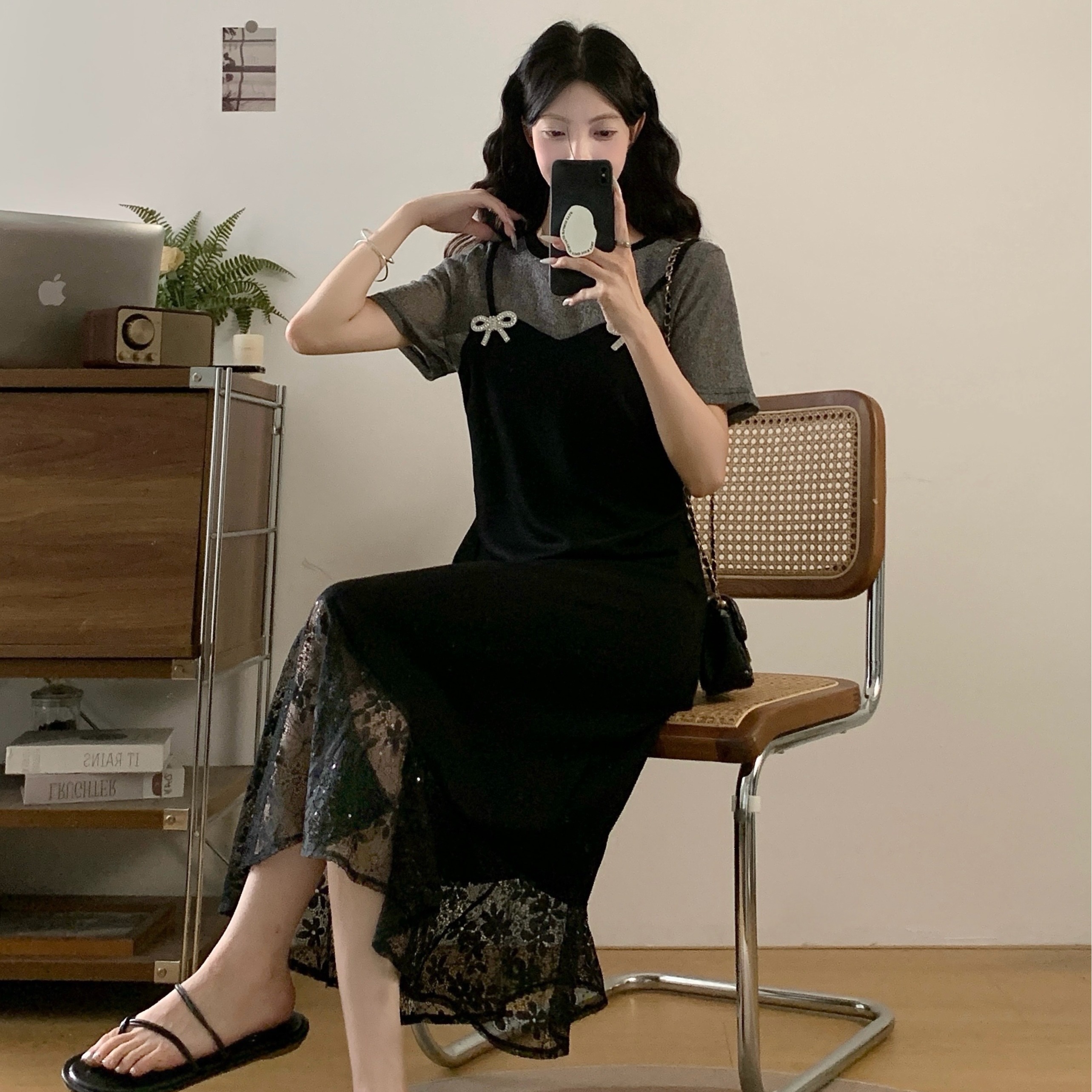실사 빅 사이즈 여성 의류 2026 여름 프랑스식 패션 캐주얼 레이스 조각 페이크 레이어드 슬림해 보이는 반팔 드레스