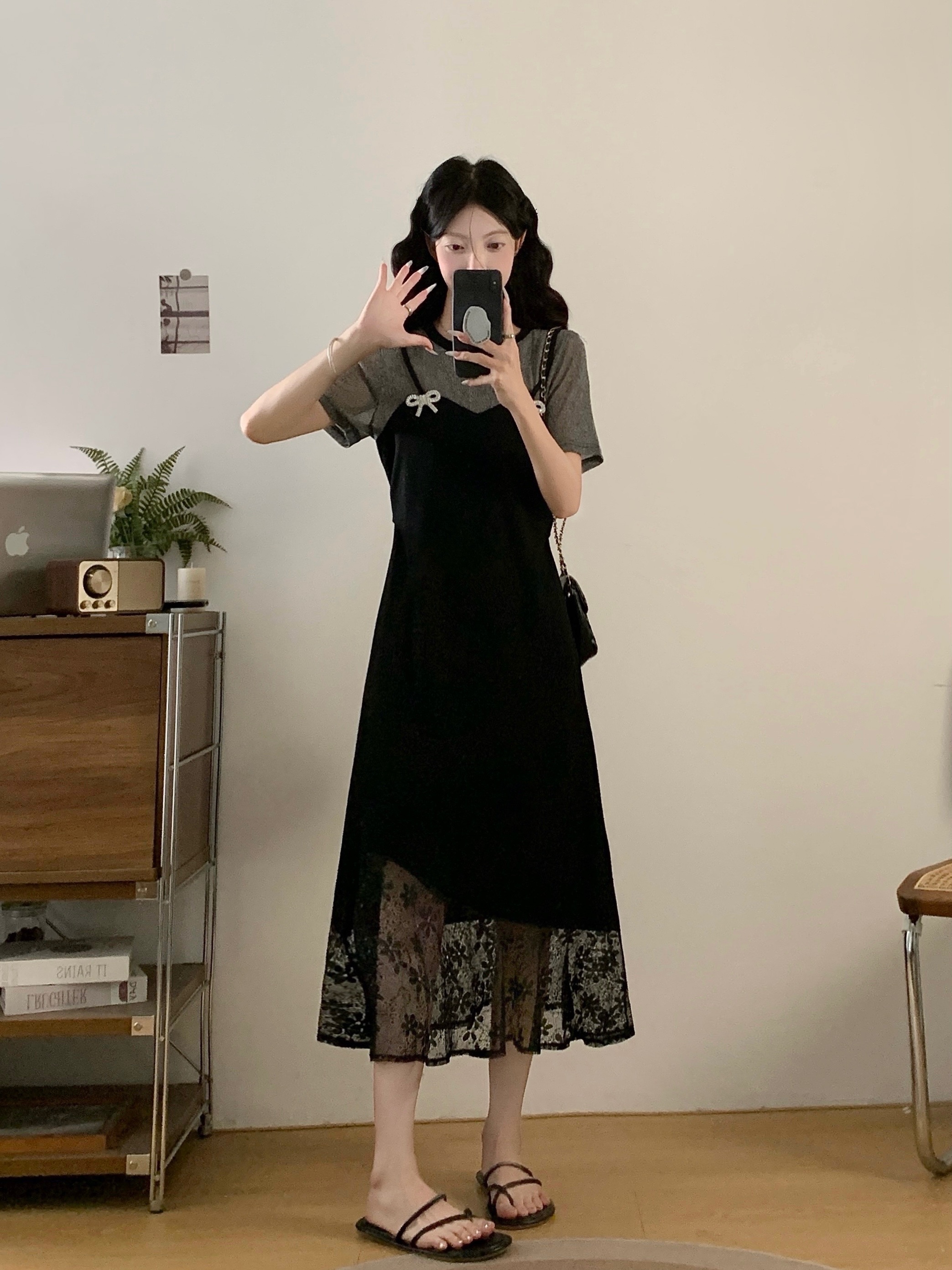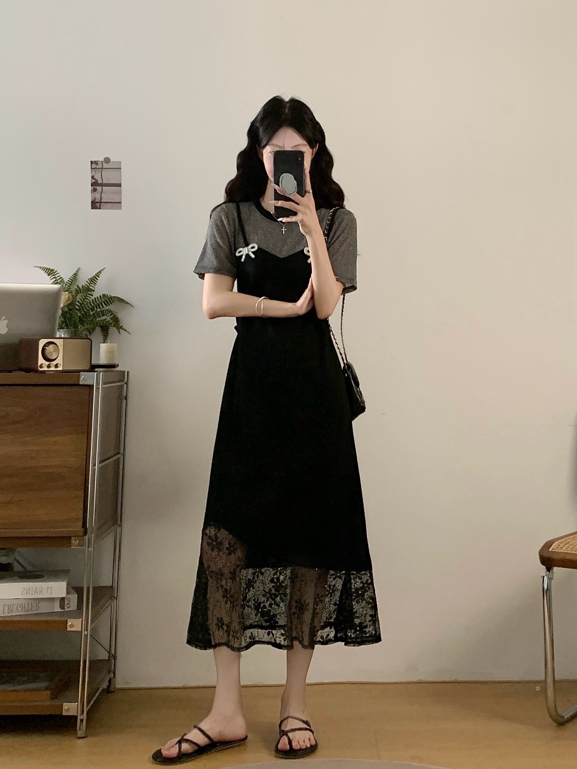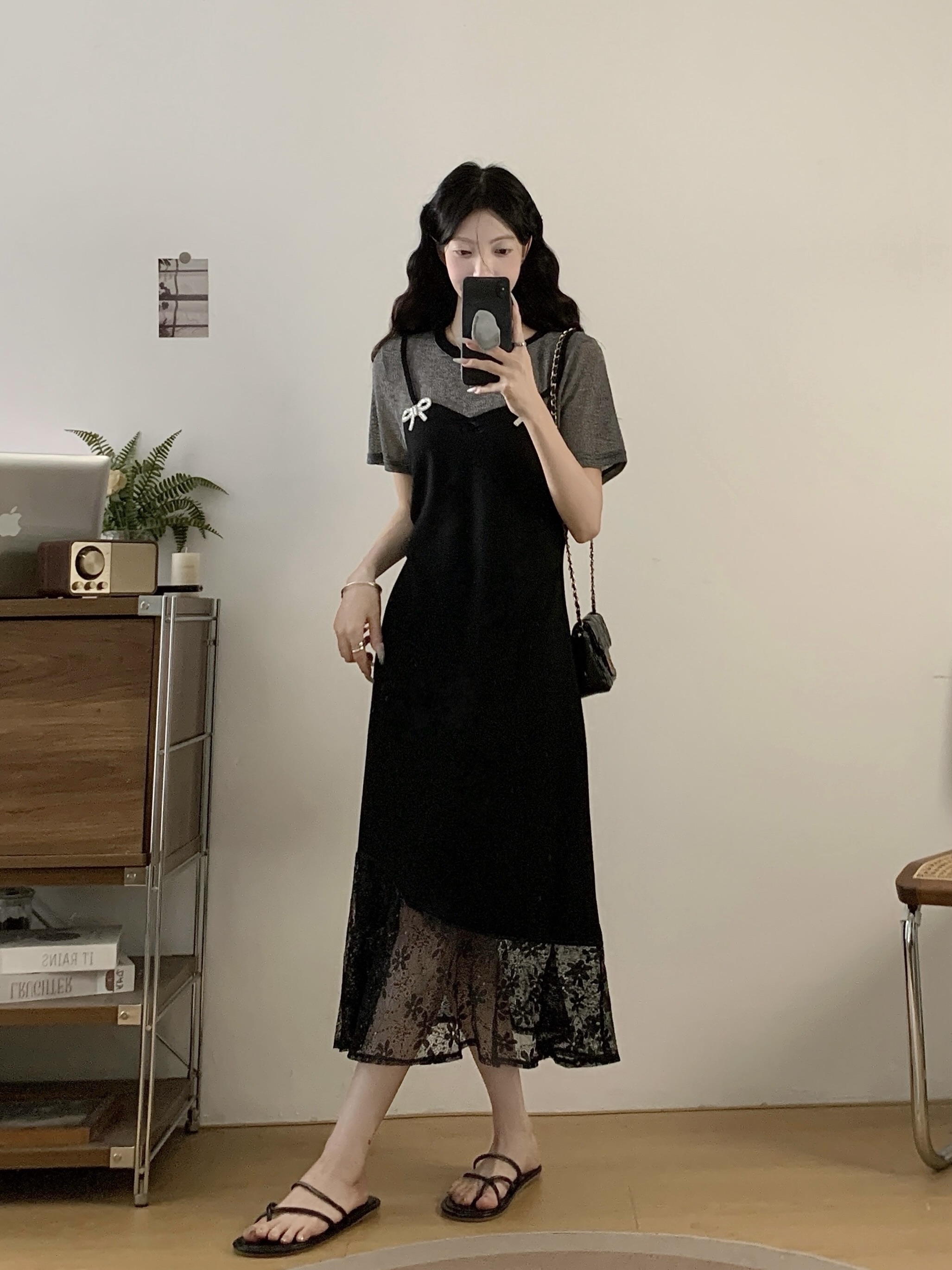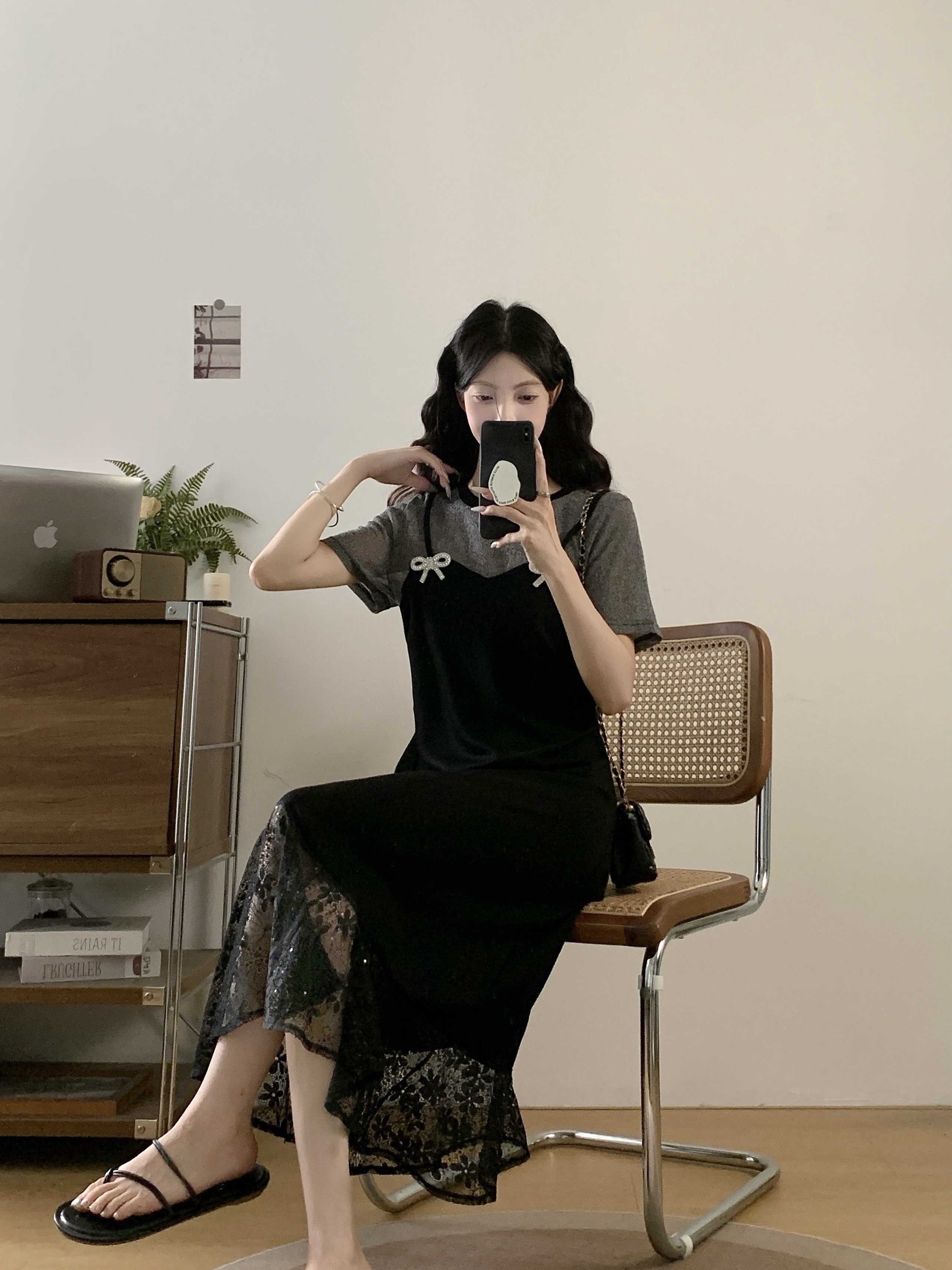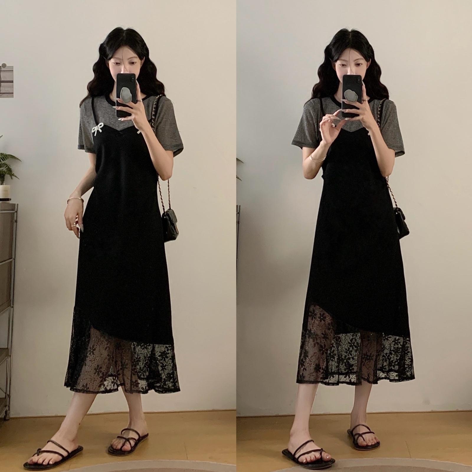 실사 빅 사이즈 여성 의류 2026 여름 프랑스식 패션 캐주얼 레이스 조각 페이크 레이어드 슬림해 보이는 반팔 드레스