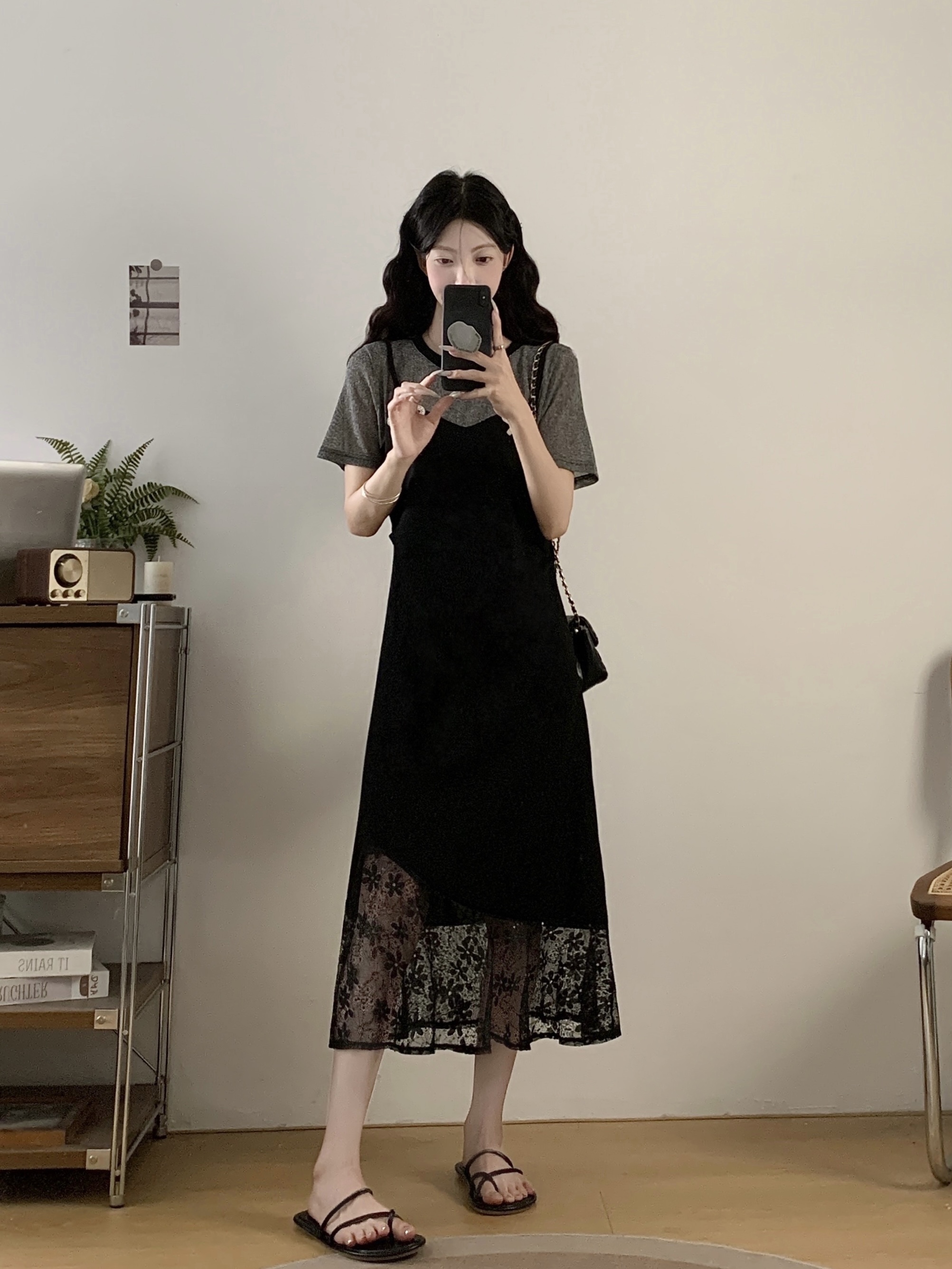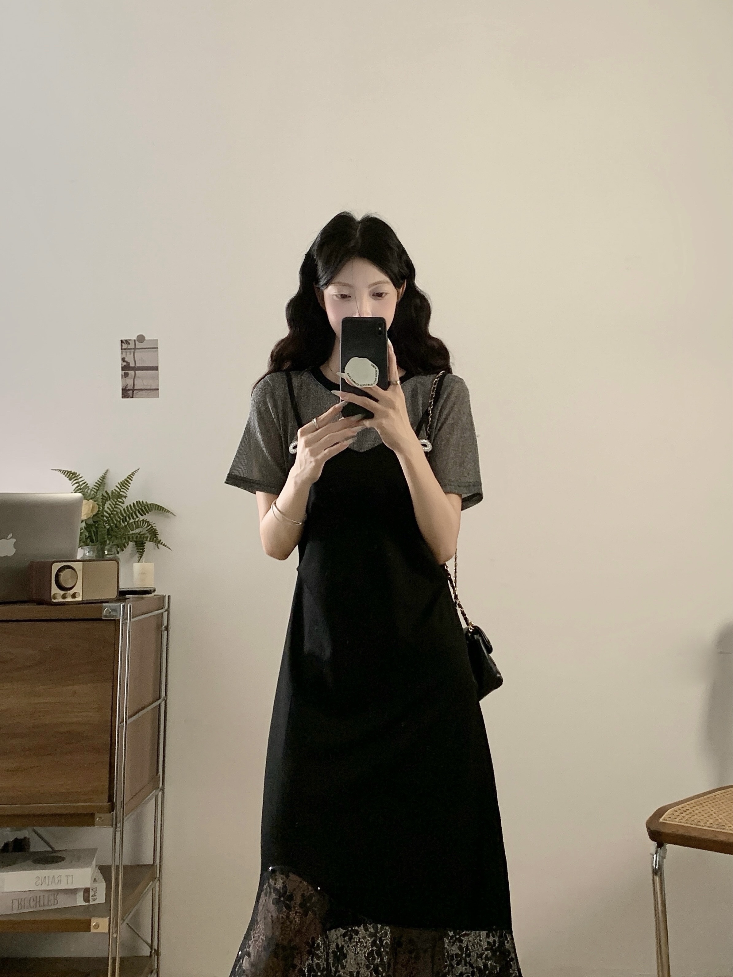 빅 사이즈 여성 의류 실사 2026 여름 디자인 센스 품격 패션 캐주얼 레이스 조각 페이크 레이어드 슬림해 보이는 드레스