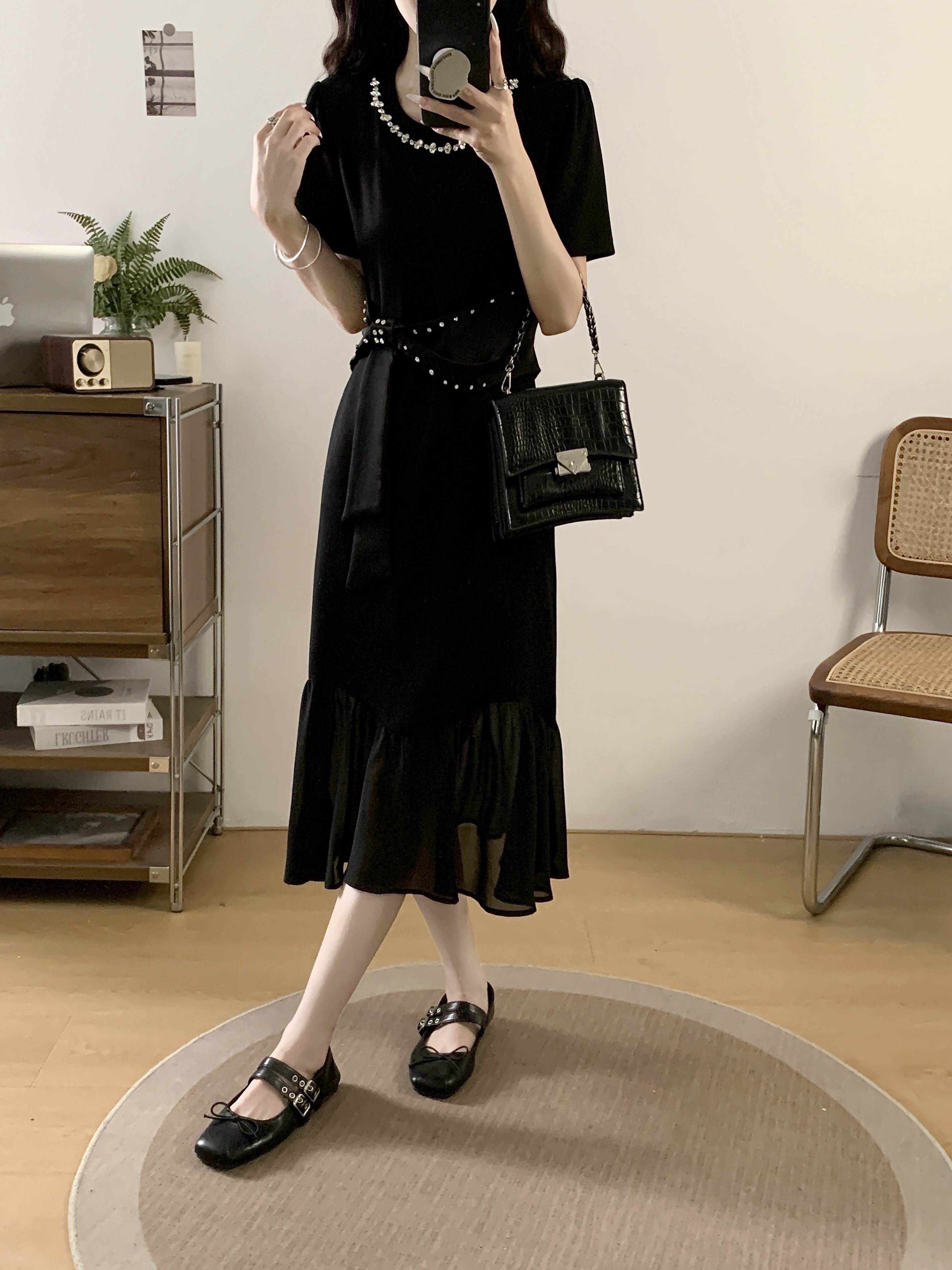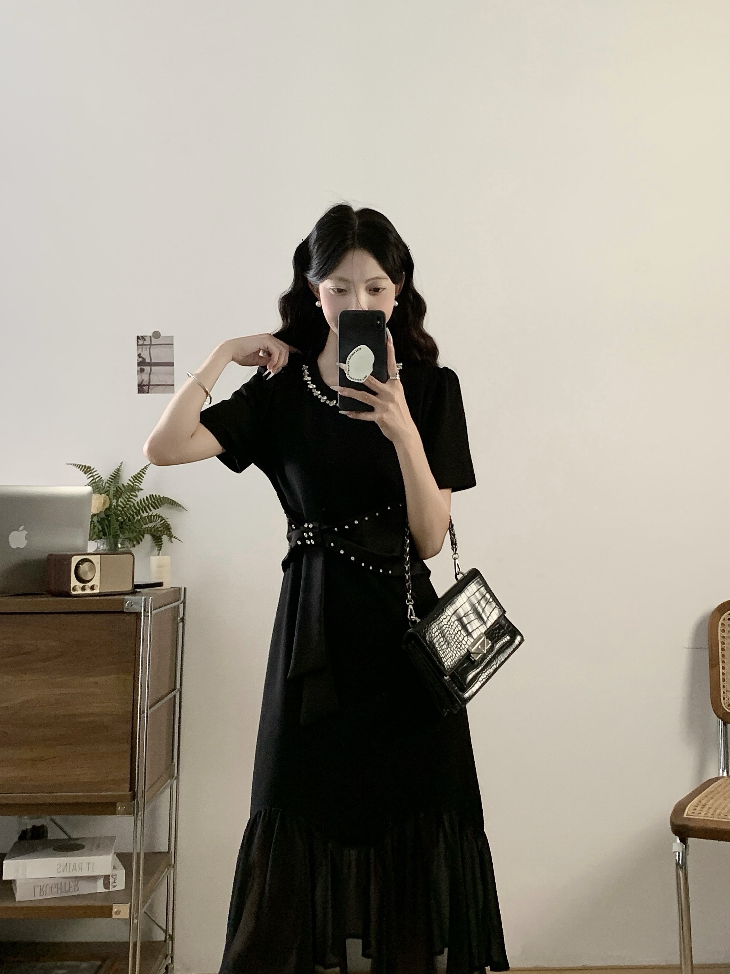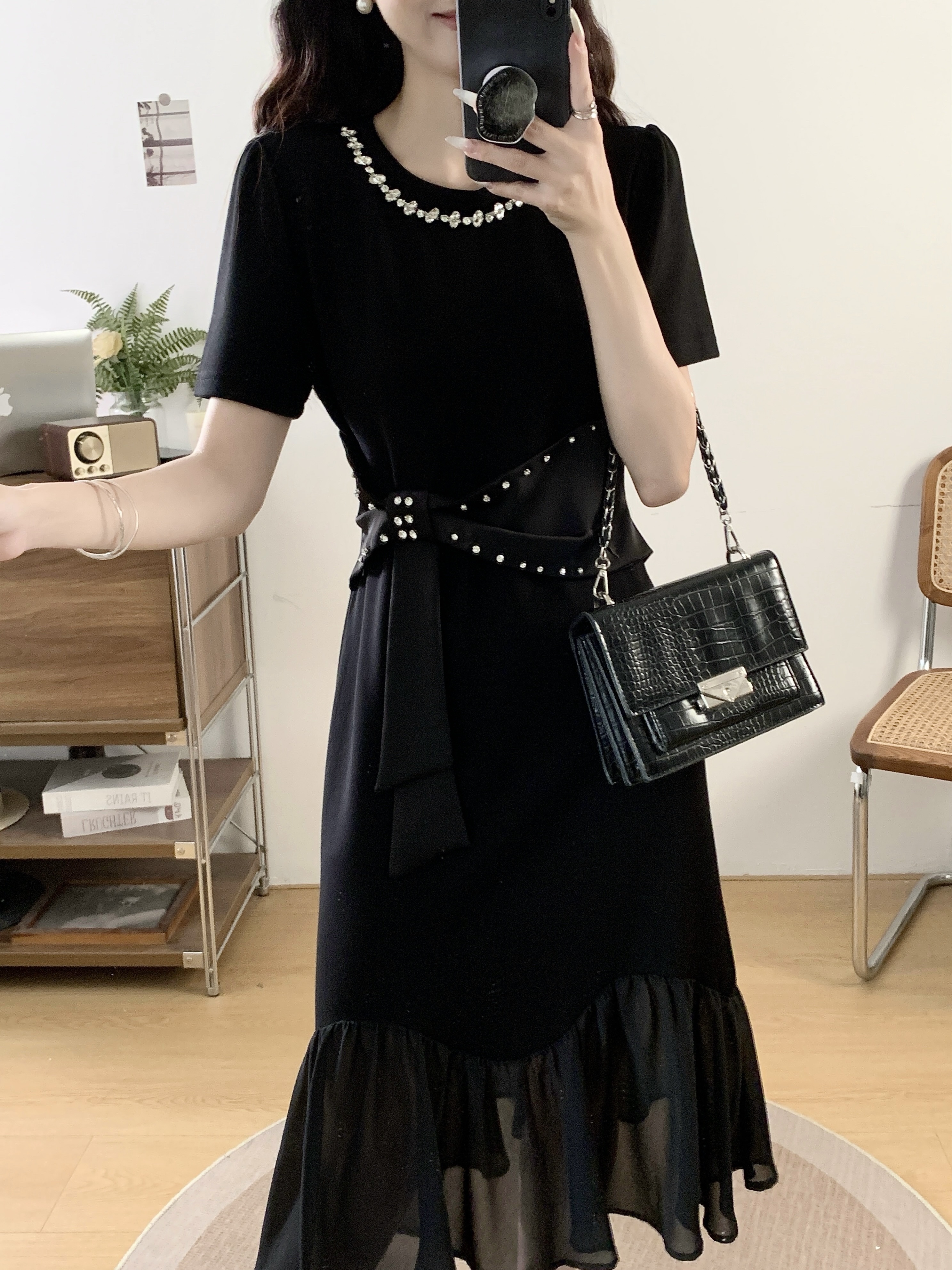 실사 빅 사이즈 여성 의류 2026 여름 새로운 지방 mm 프랑스식 품격 라운드 넥 허리 수축 슬림해 보이는 다이아몬드 세팅 드레스