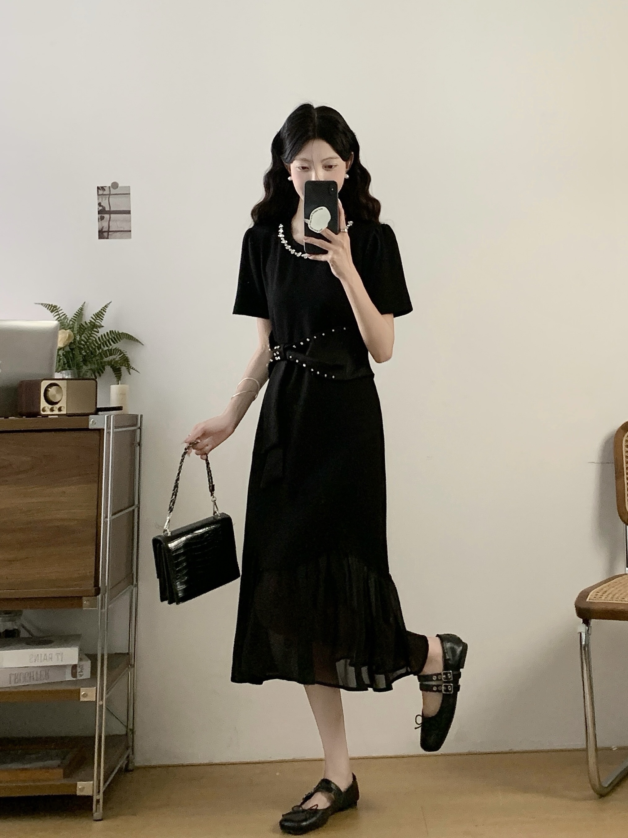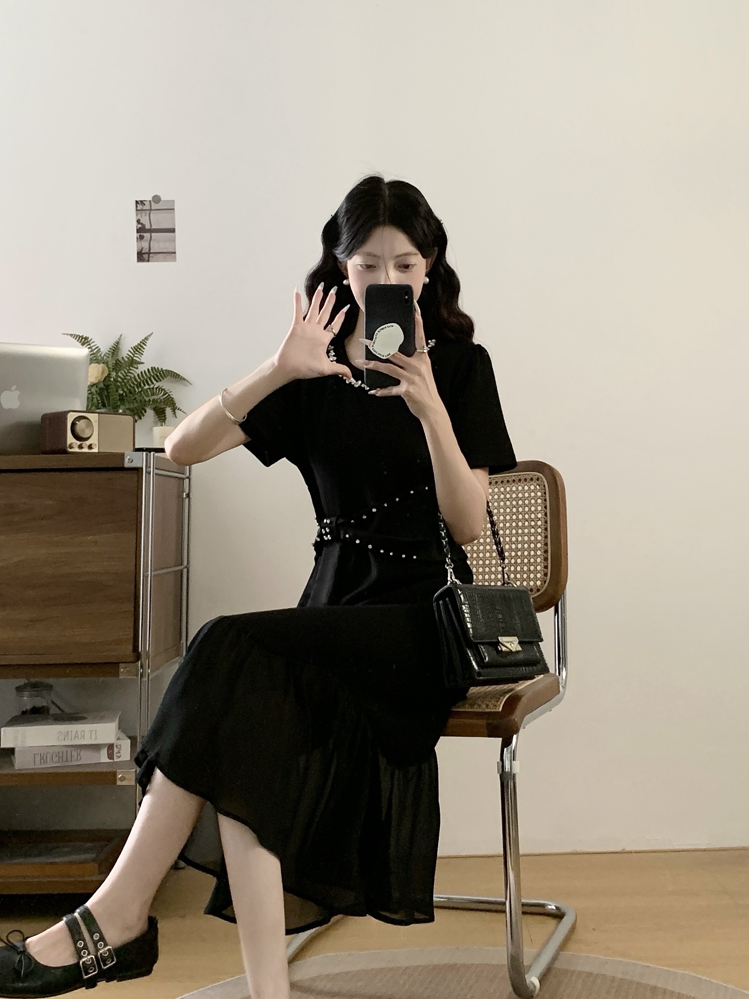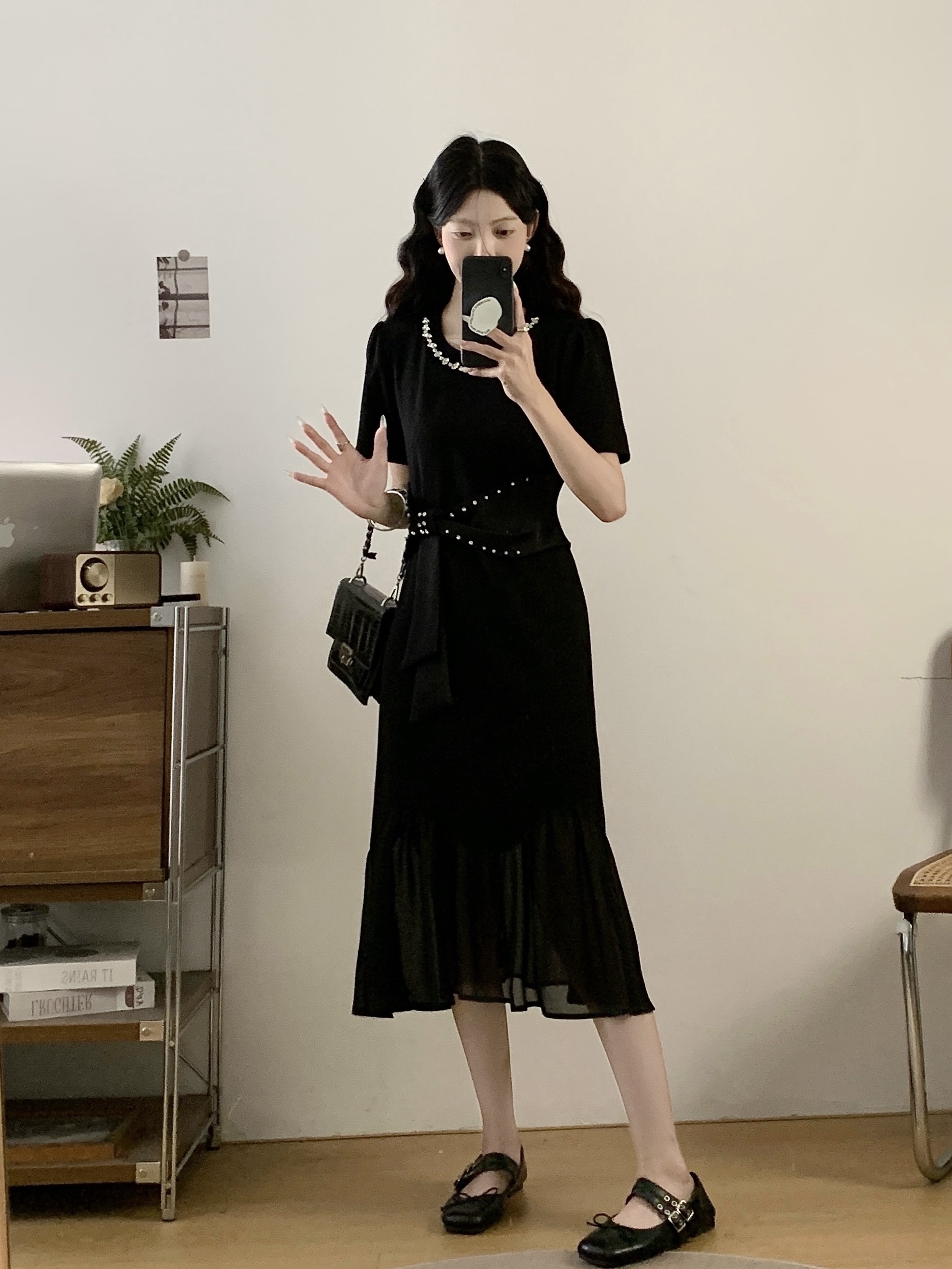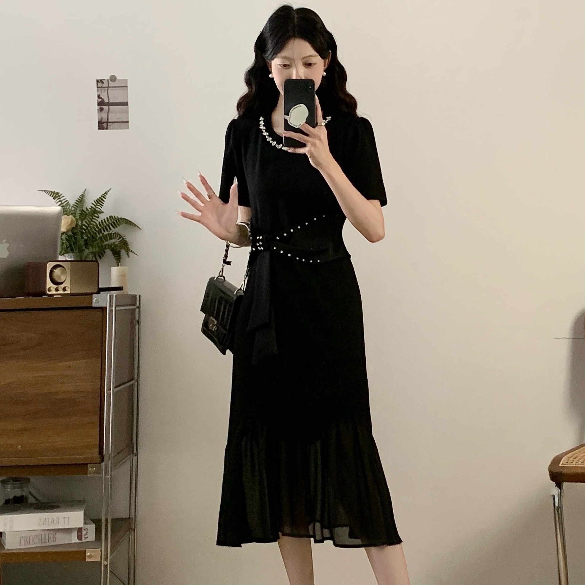 실사 빅 사이즈 여성 의류 2026 여름 새로운 지방 mm 프랑스식 품격 라운드 넥 허리 수축 슬림해 보이는 다이아몬드 세팅 드레스