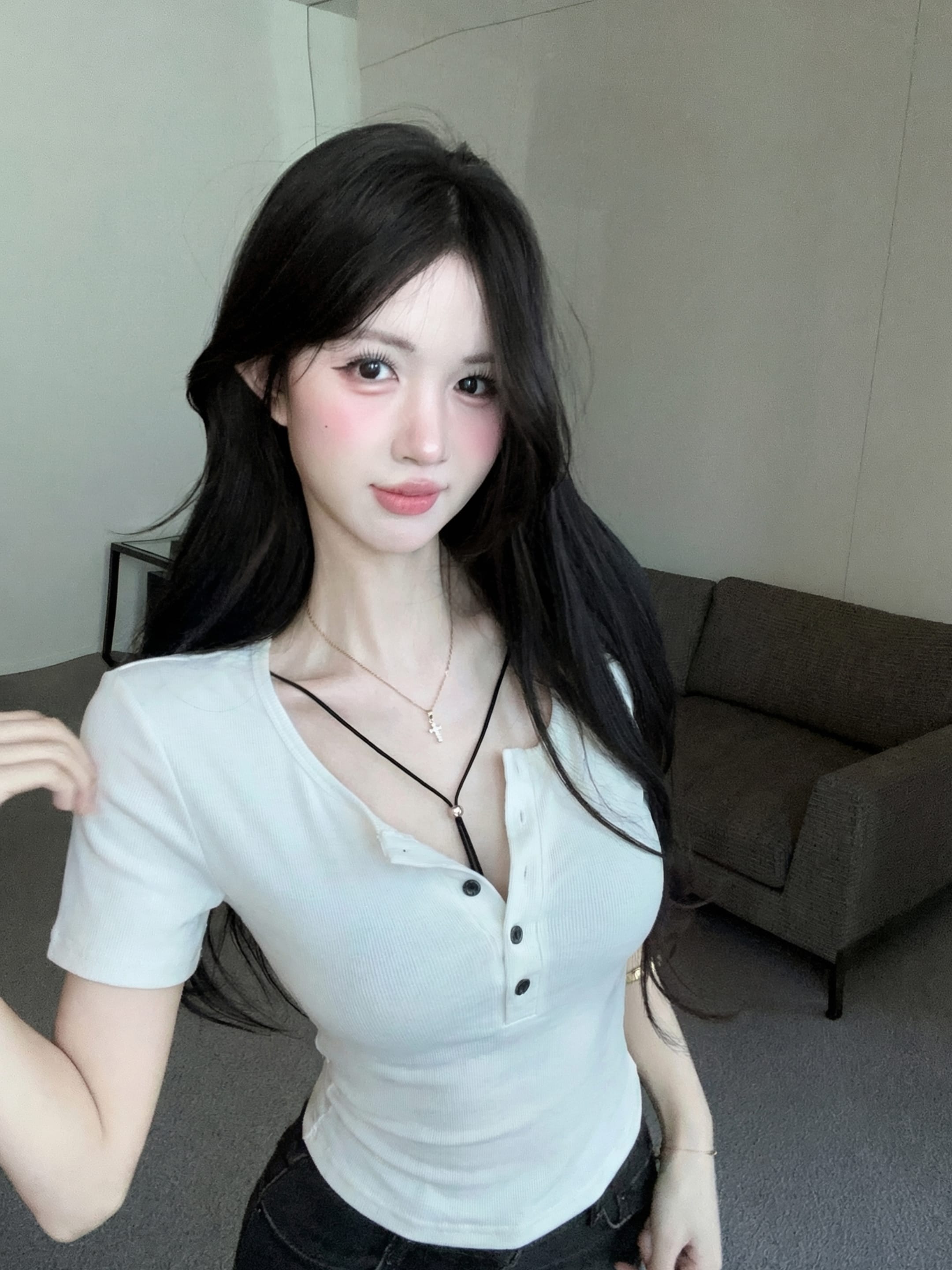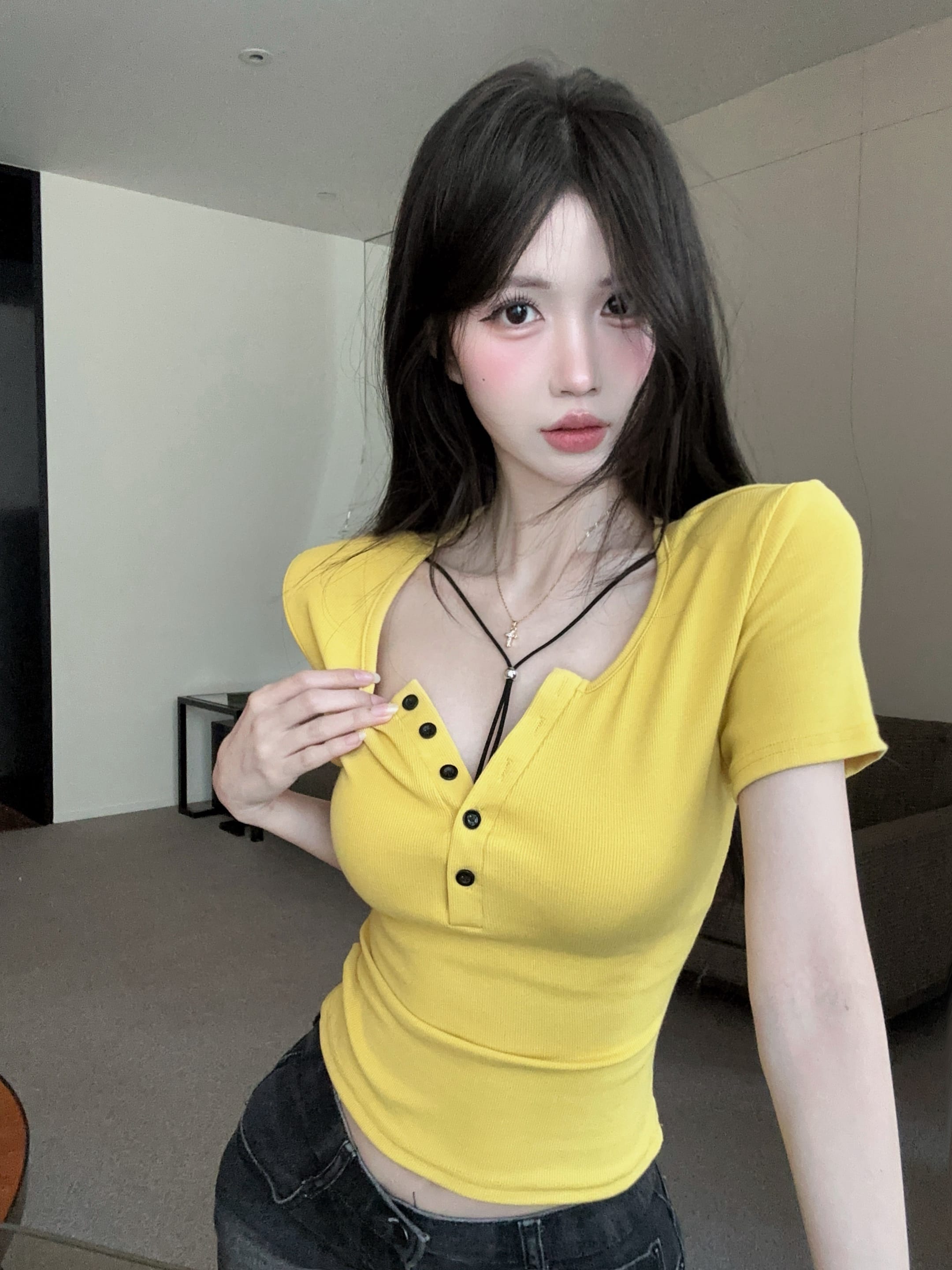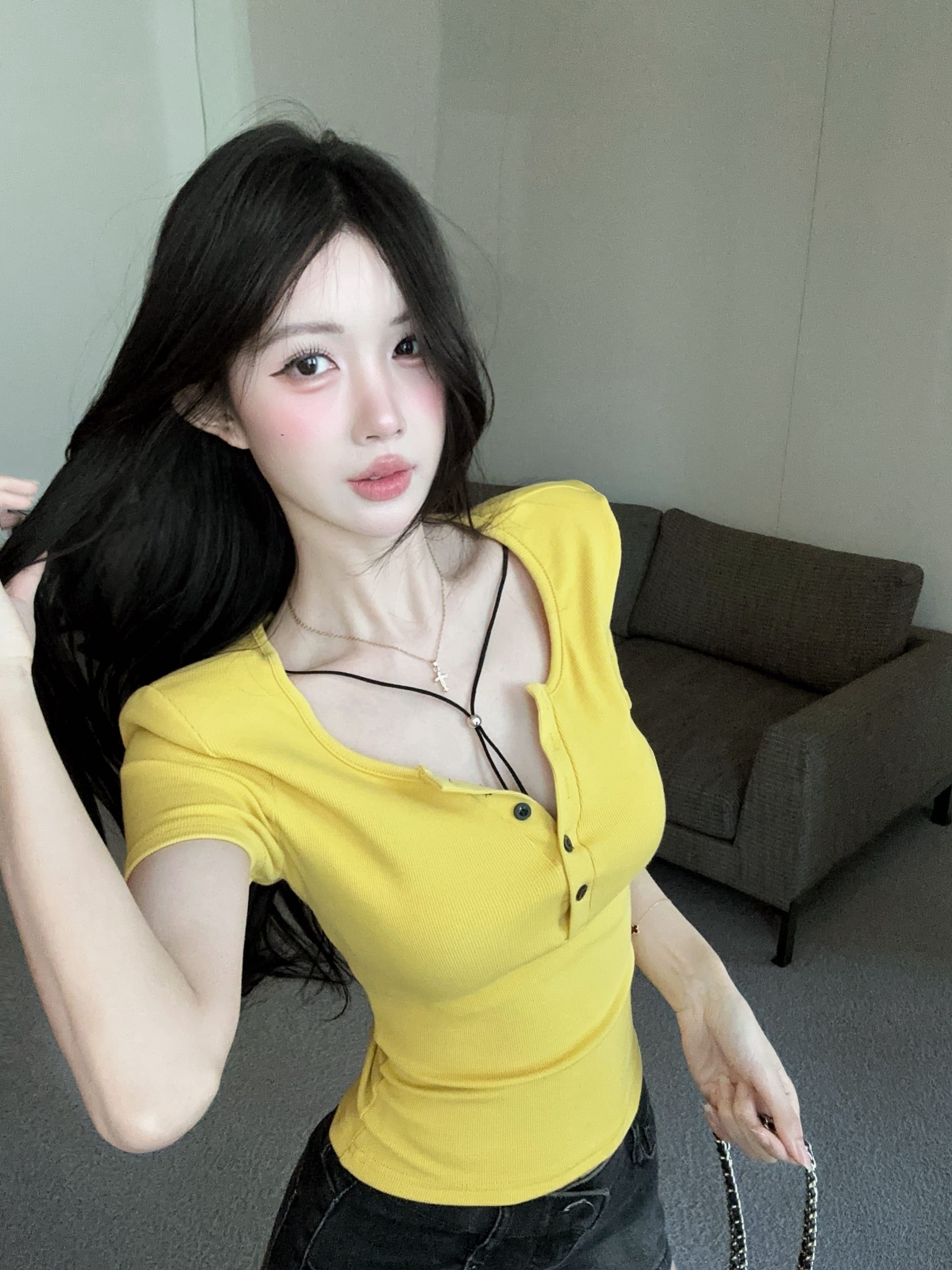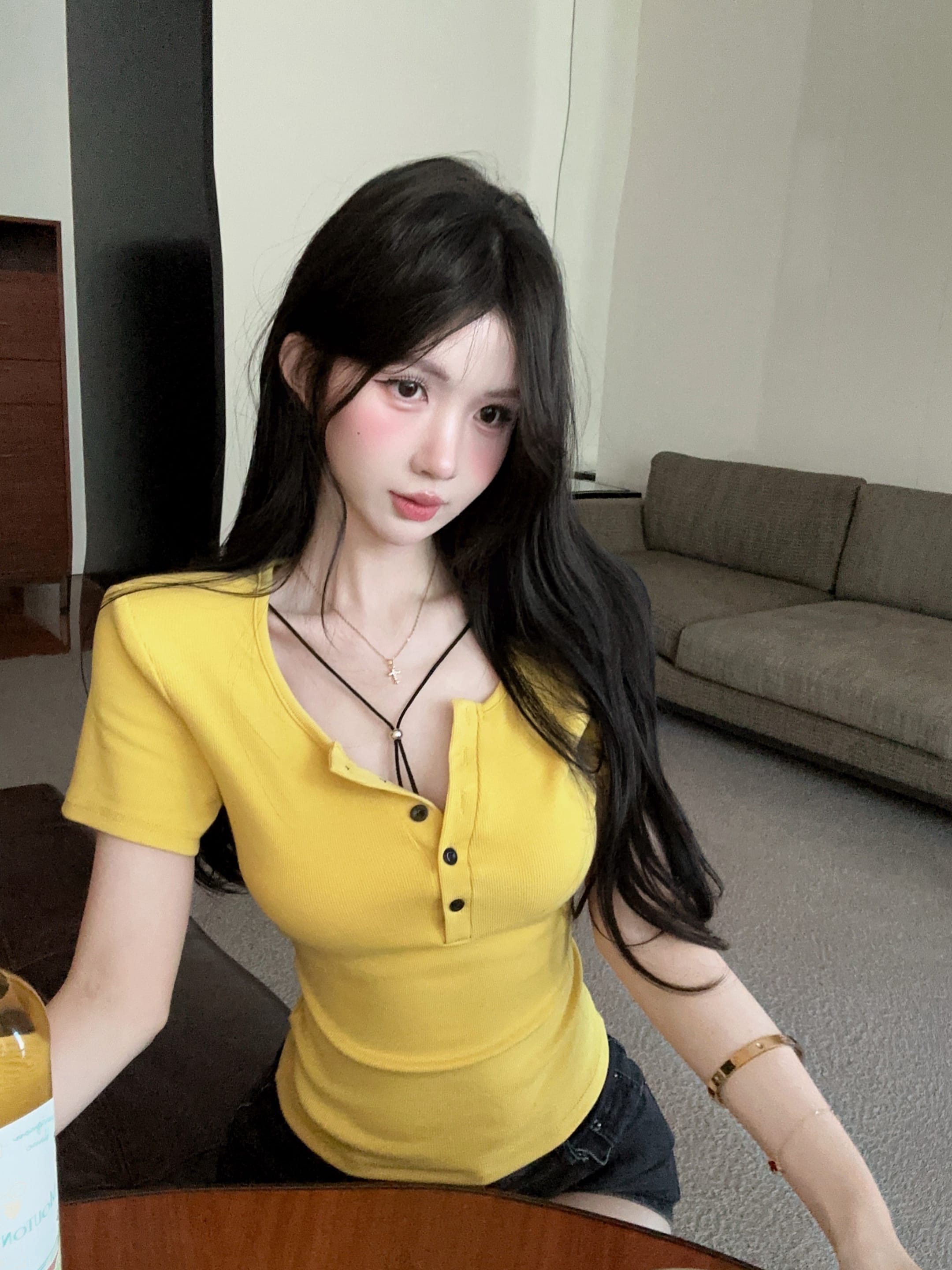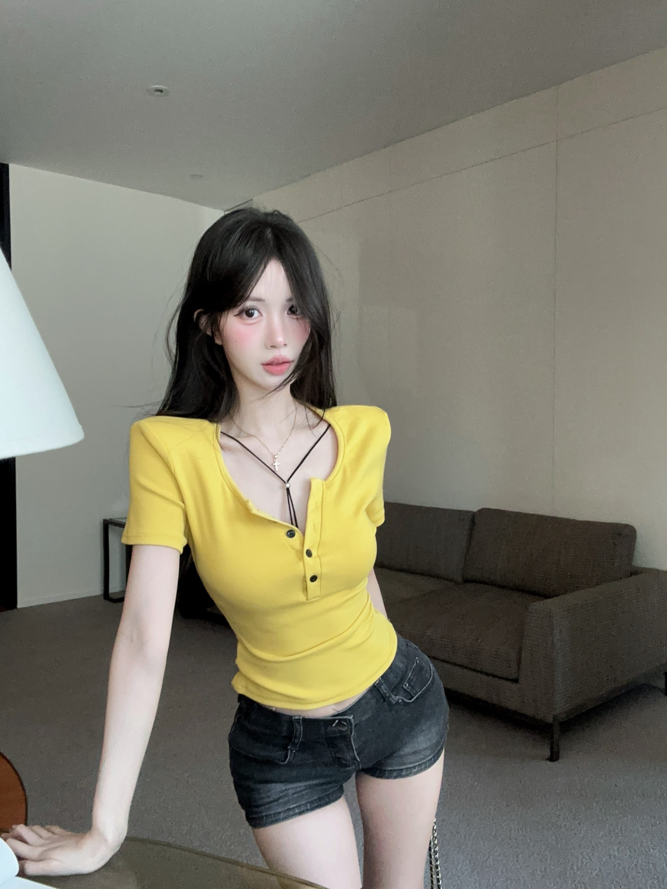 실사 정가 여름 새로운 레이스업 장식 어깨 패드 라운드 넥 버튼 반팔 티셔츠 여성 몸매 가꾸기 슬림해 보이는 맨위